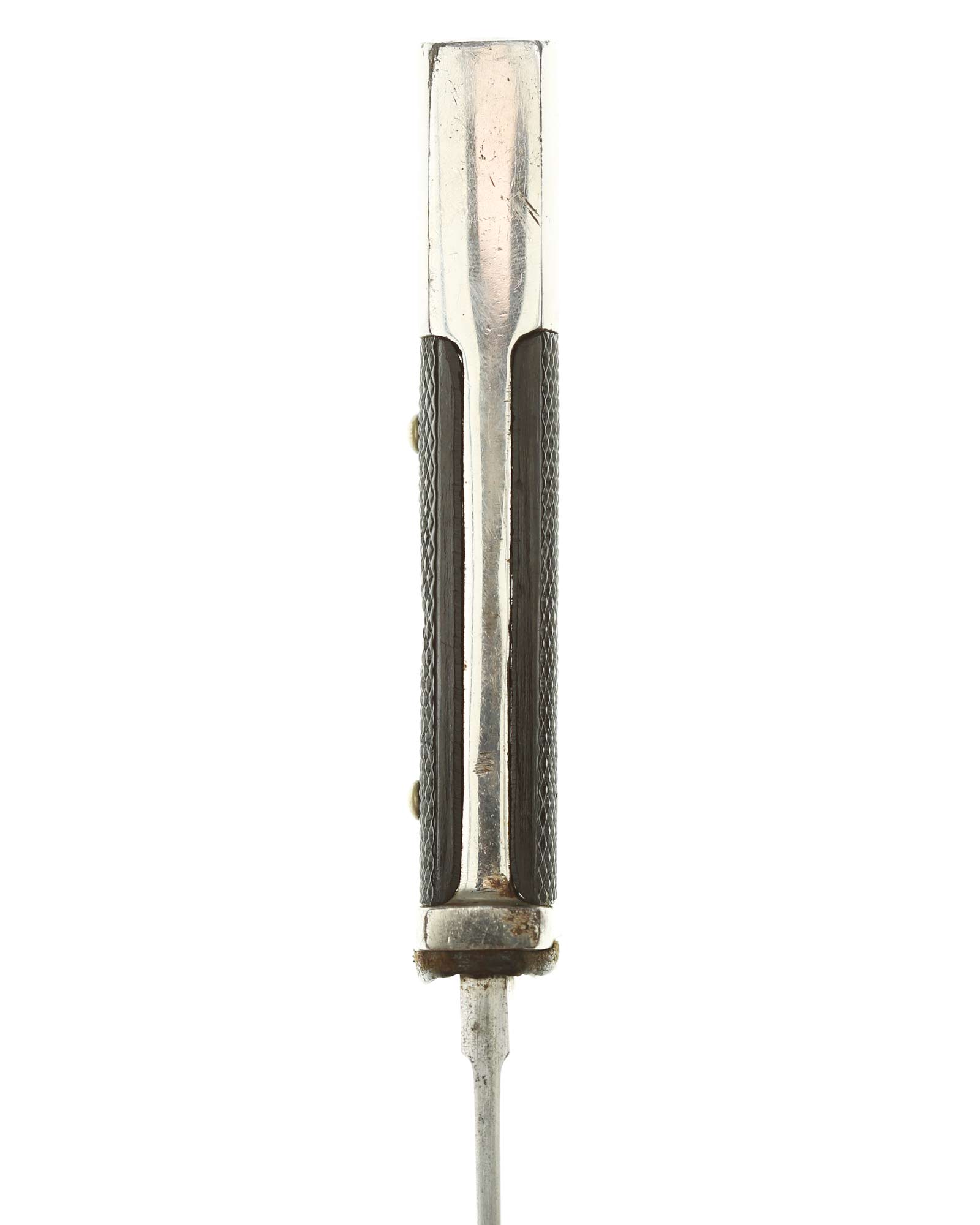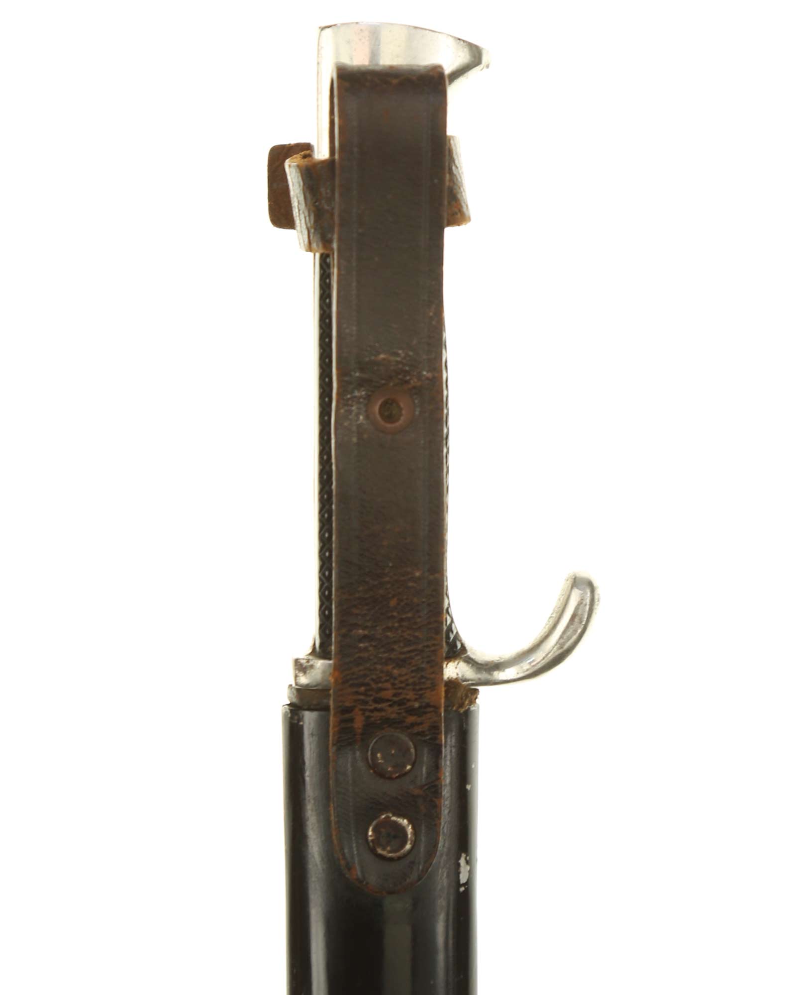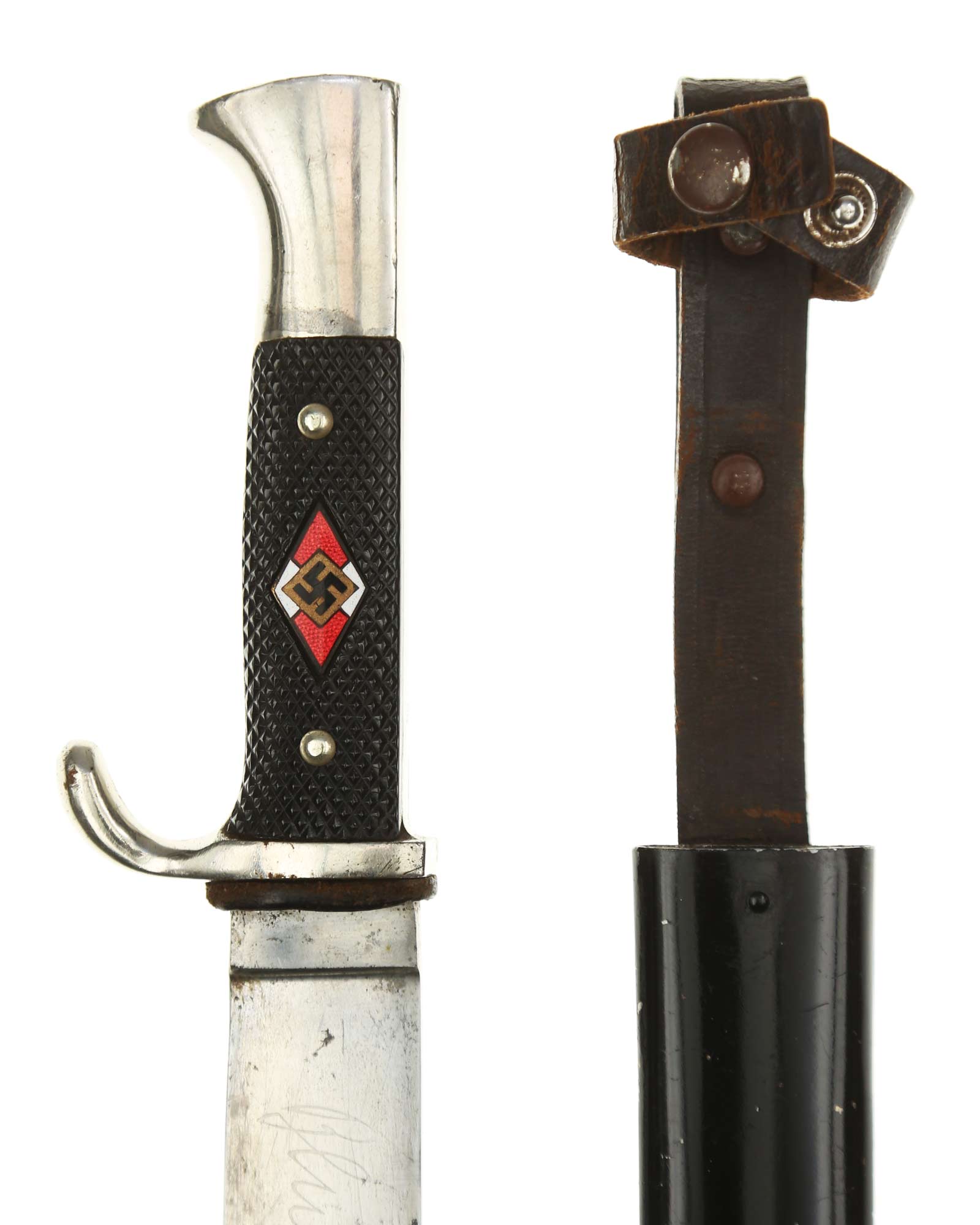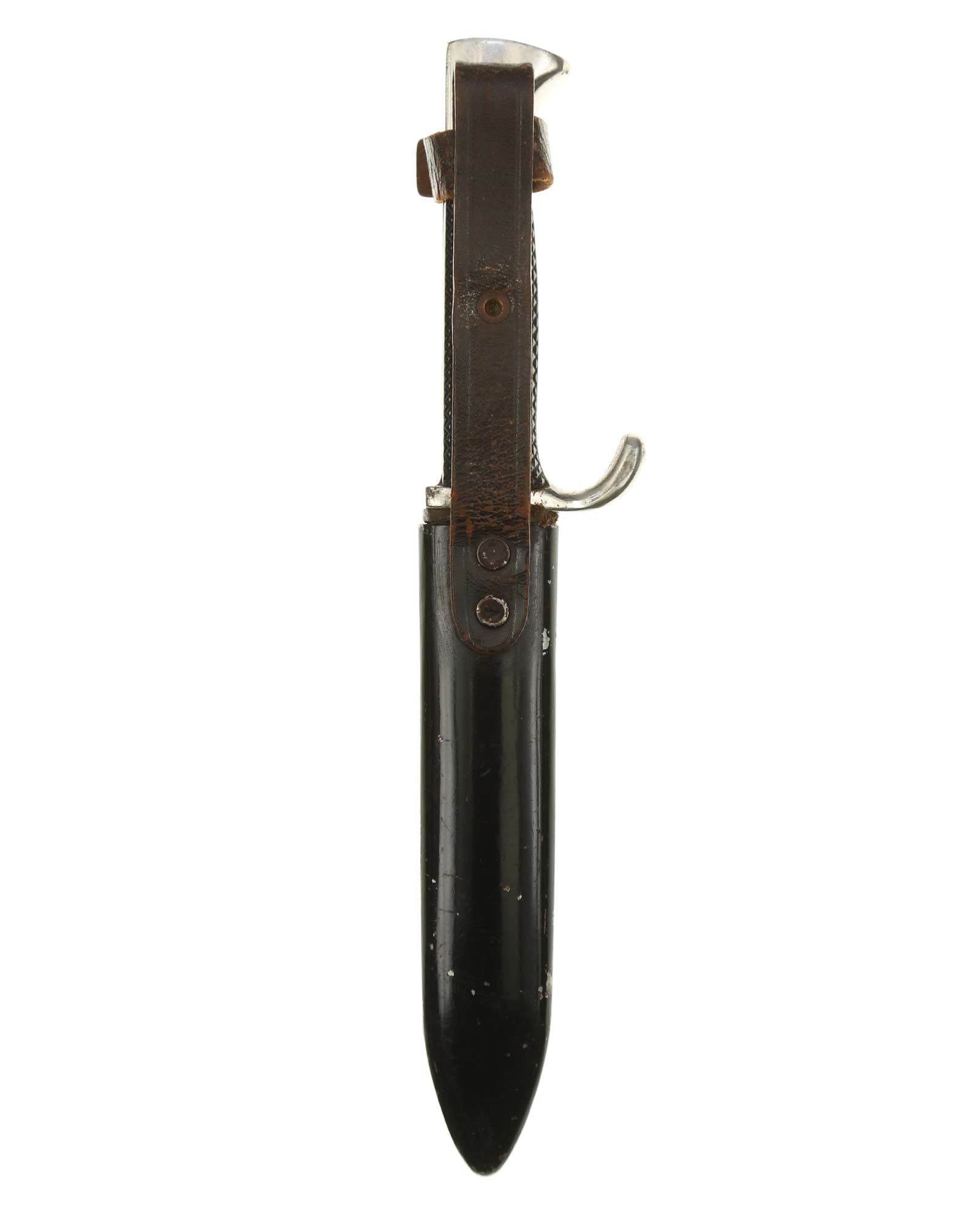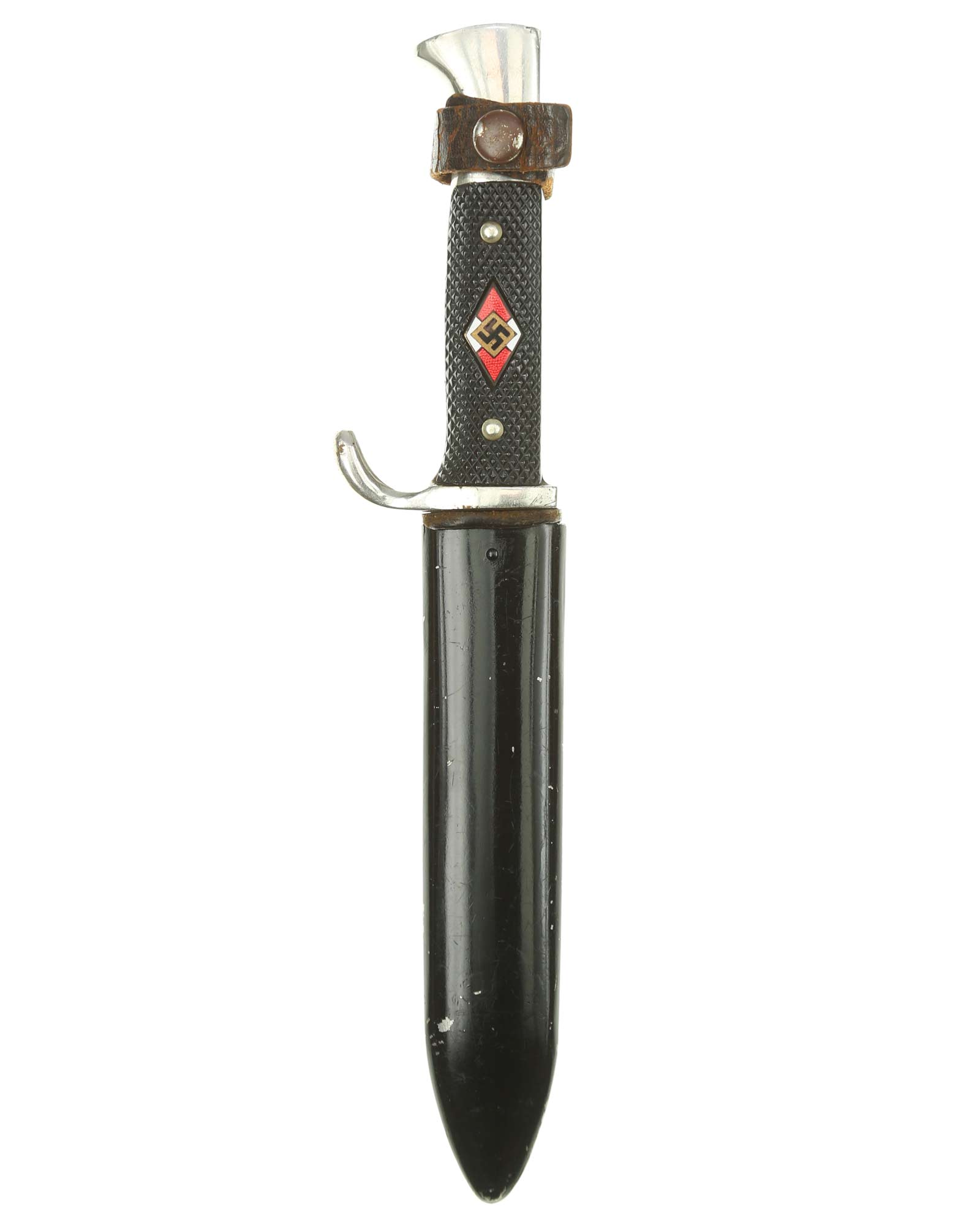Griff: Vernietete Griffschalen, aus Bakelit mit Fischgrätenmuster in Tiefschwarz. Auf der vorderen Seite befindet sich, in der Mitte der Griffschale, das Hitler-Jugend-Abzeichen (versplintet). Einseitig gebogene Parierstange bzw. Knebel.