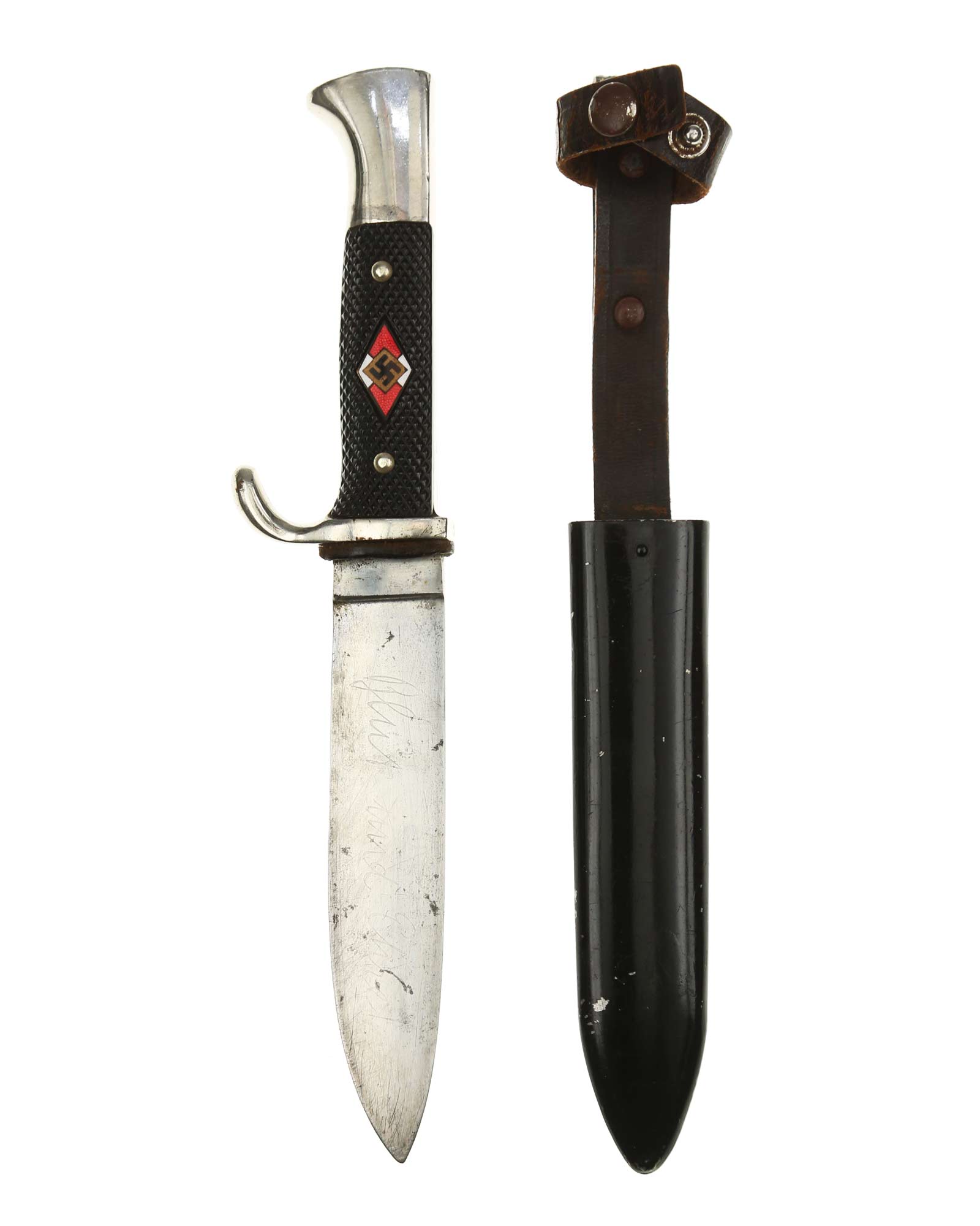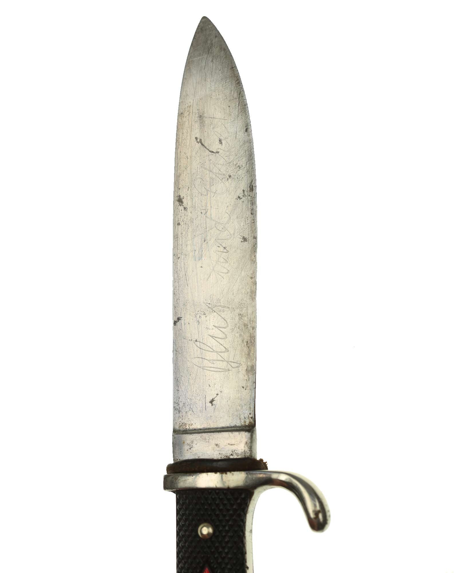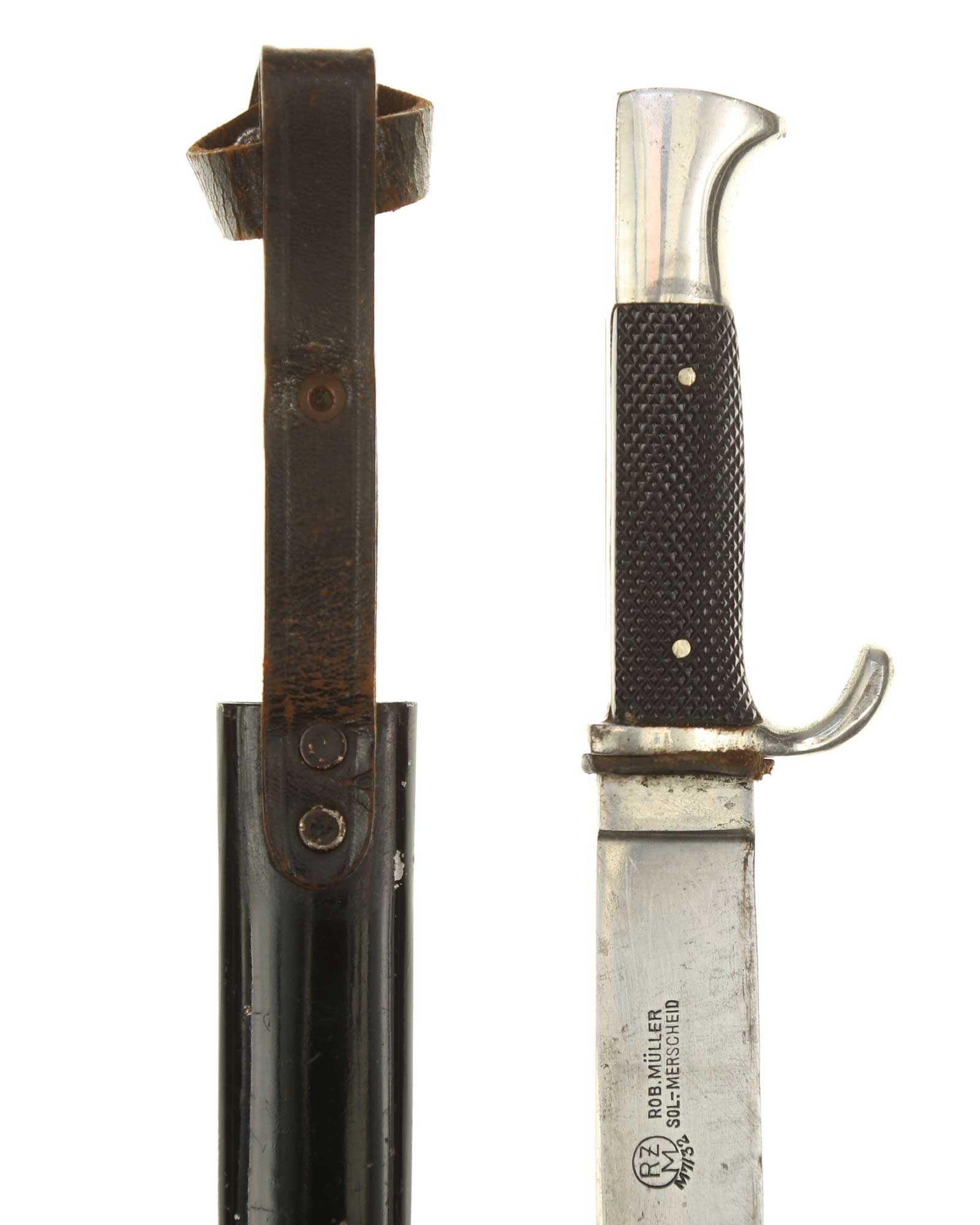 Klinge: Die Klinge ist einschneidig und aus Gussstahl. Diese ist in den Griff eingelassen und vernietet. Auf der vorderen Seite hat die Klinge (bis 19.08.1938) die typische HJ Devise: Blut und Ehre!. Die Rückseite der Klinge ist mit dem RZM Hersteller: RZM M7/32 (Rob. Müller Sol.-Merscheid).