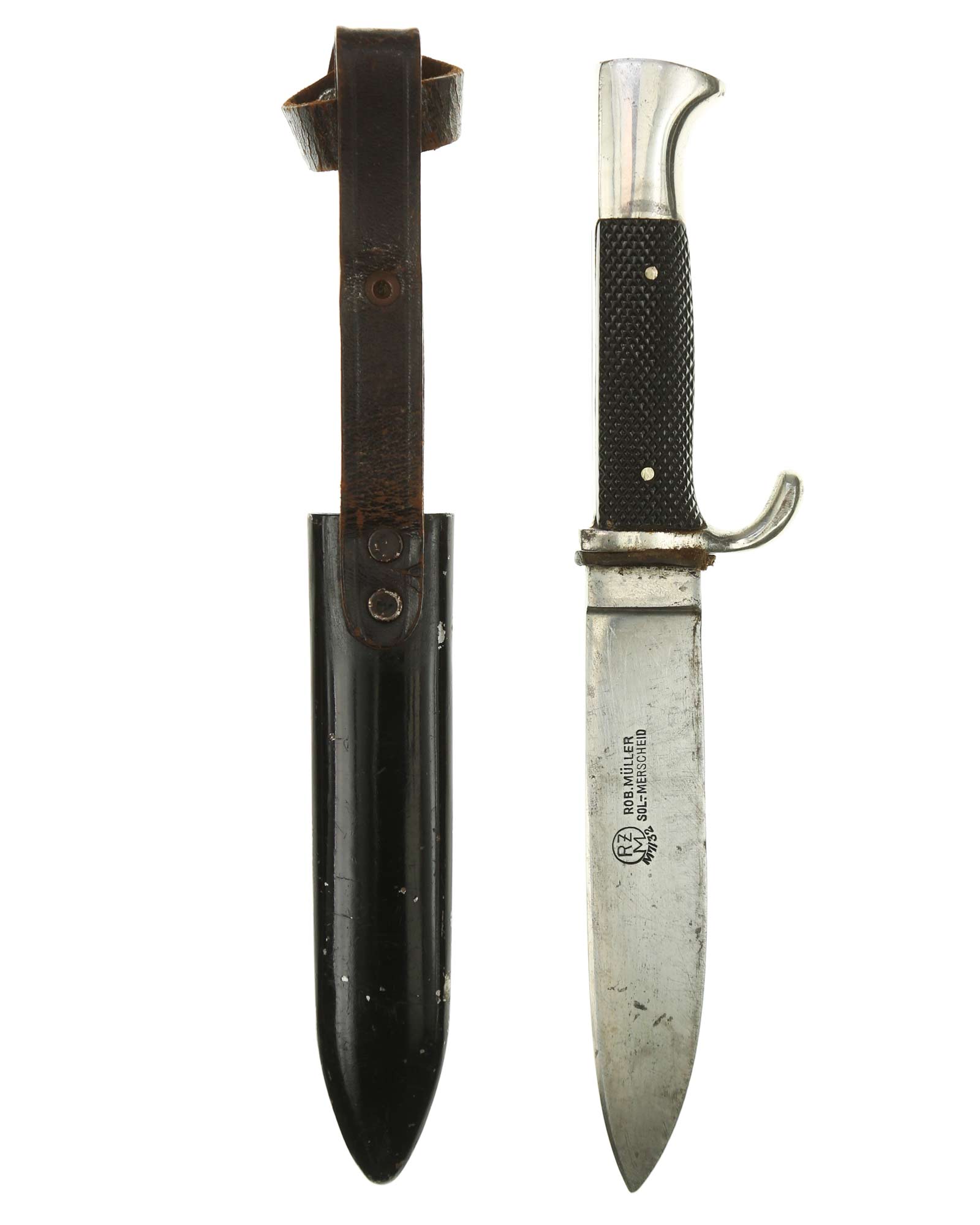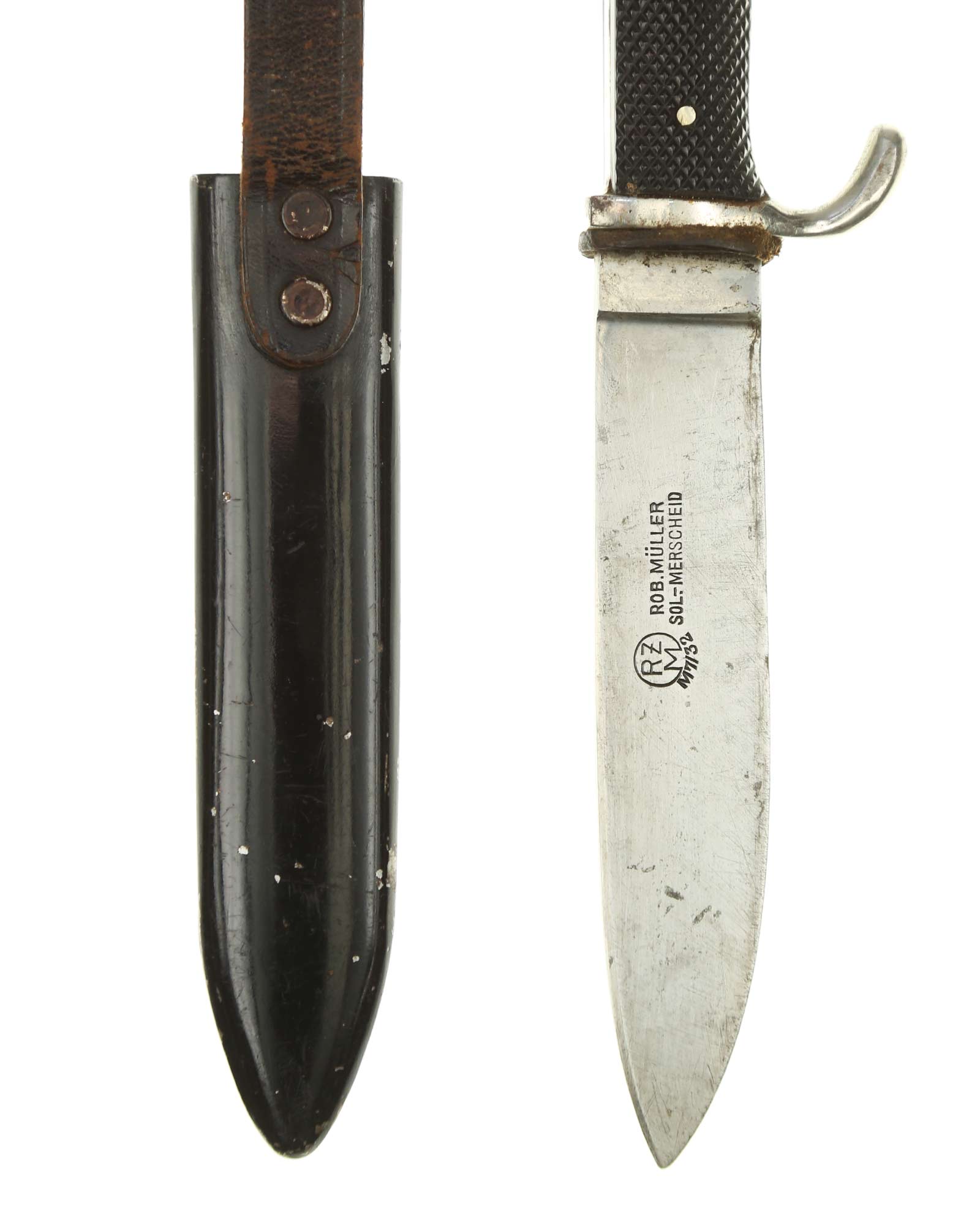 HJ Fahrtenmesser [Hitlerjugend] mit Motto in mittlerer Fertigung 1936-1938. HJ Messer ist auf der Rückseite mit Hersteller und RZM Code: RZM M7/32 (Rob. Müller Sol.-Merscheid).