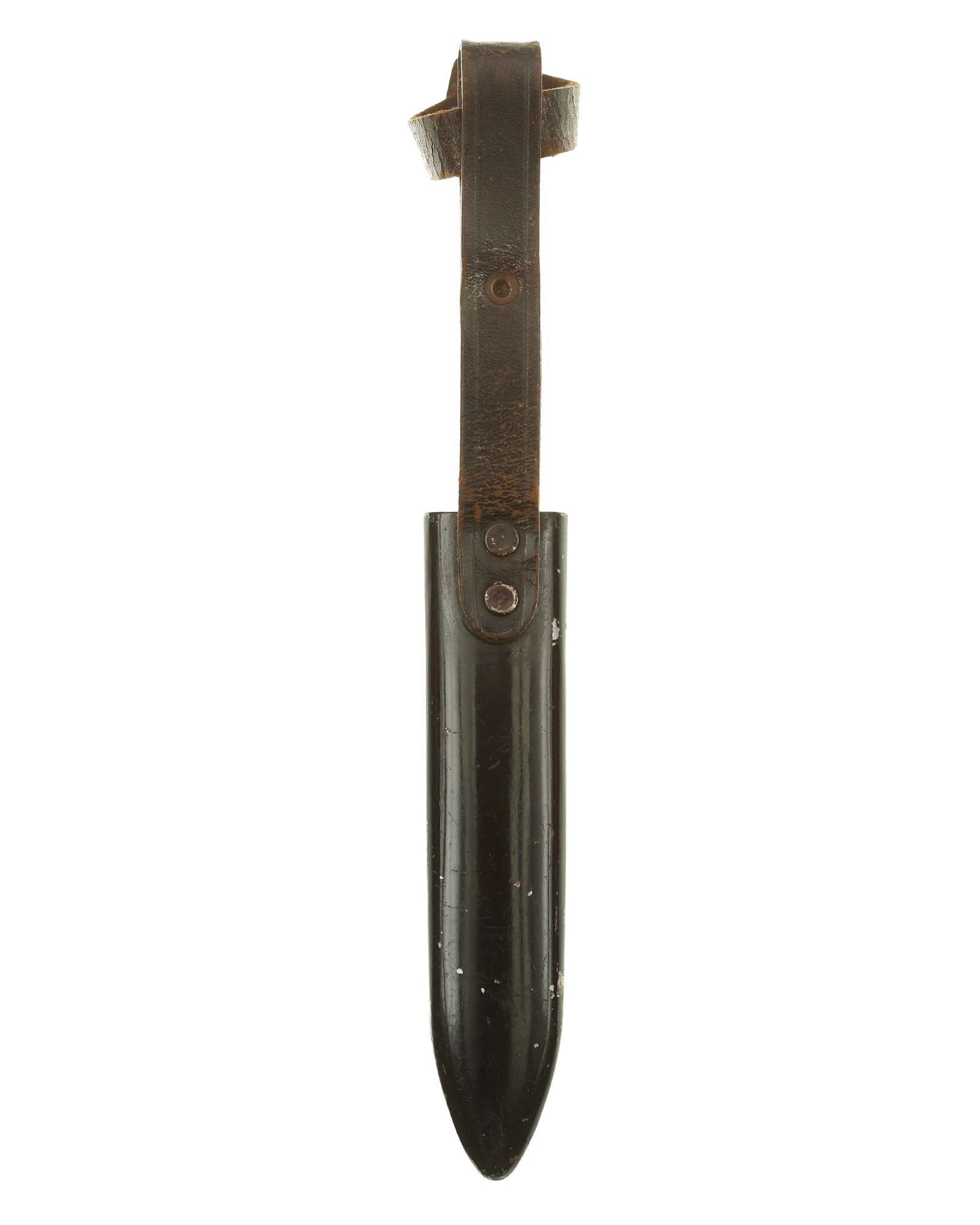 Scheide: Die Scheide ist aus Eisen. Die Tragevorrichtung besteht aus einer Schlaufe, die aus einem doppelt gelegten Riemen besteht.