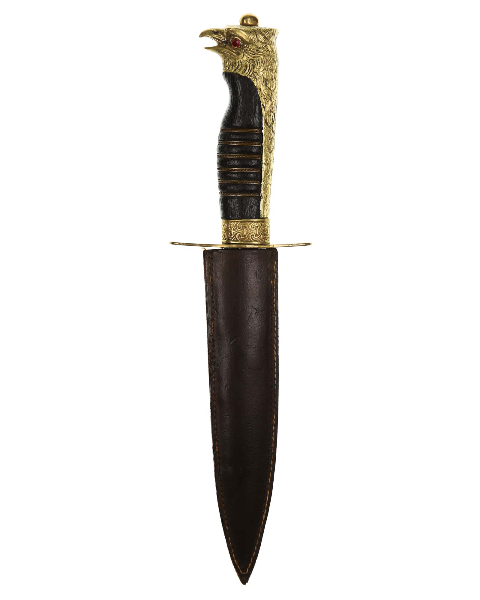 Italienischer Jugend-Faschisten Messer Modell 1933-1945. Die Scheide ist aus Leder. Die Klinge ist zweischneidig und gut erhalten. Gesamtlänge 29,5 cm. Zustand: 2+.