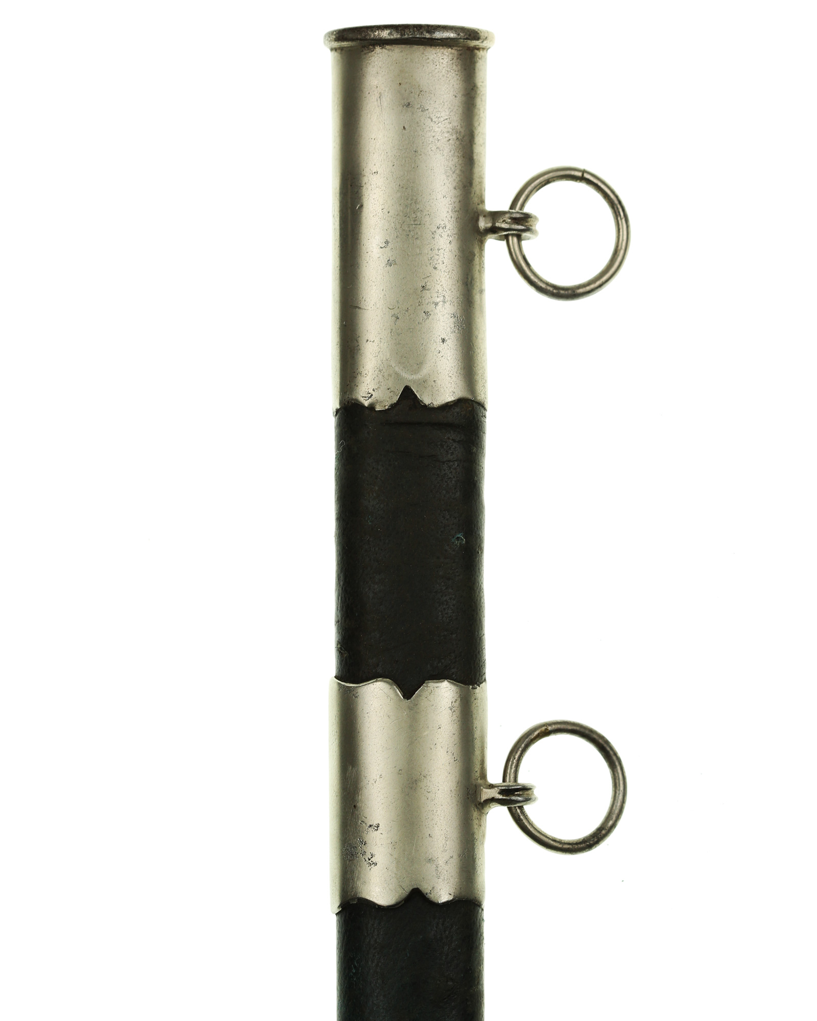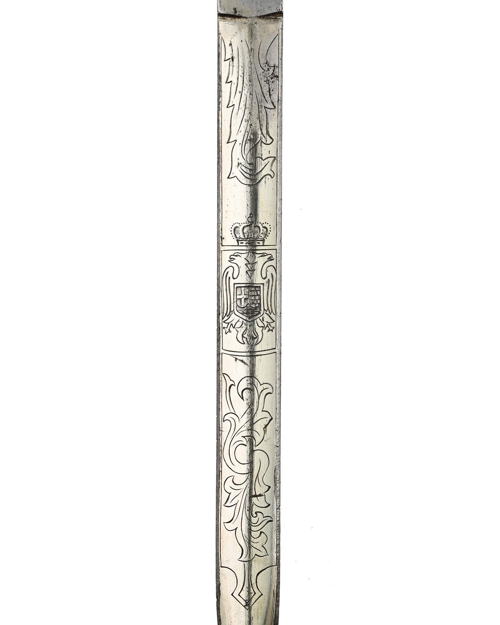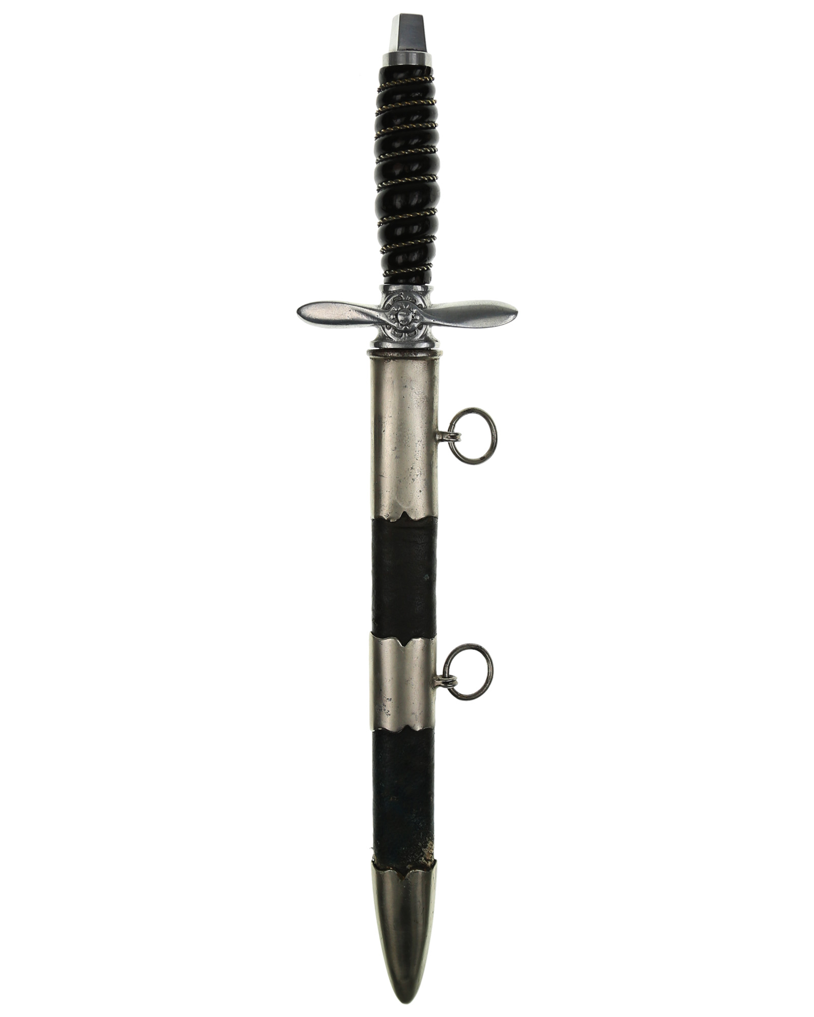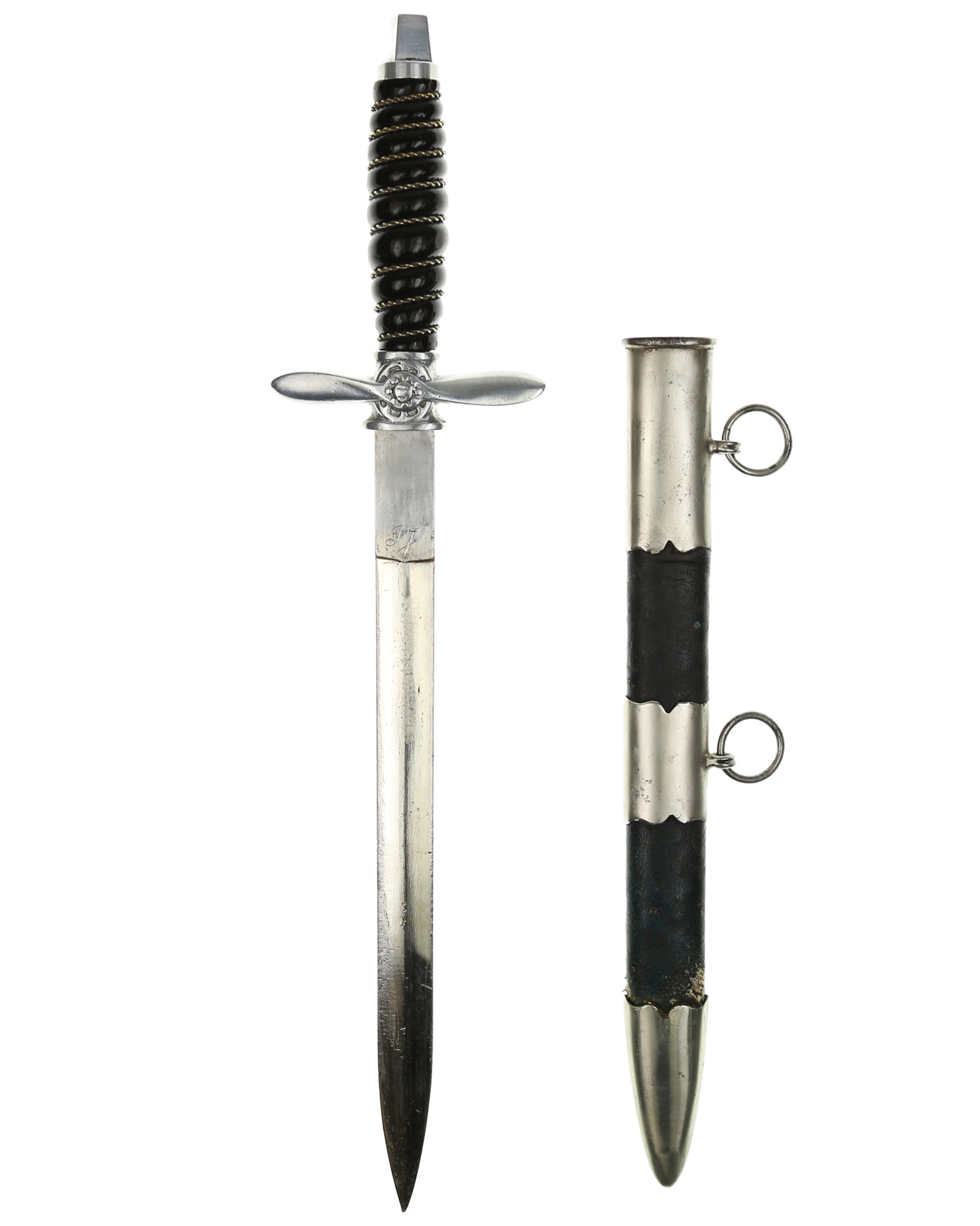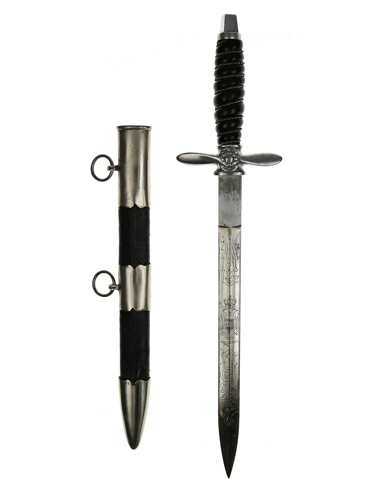 Jugoslawischer Offiziersdolch der Luftwaffe in einer einfachen Ausführung. Die Gesamtlänge beträgt 37,2 cm. Schwarzer Trolongriff mit zweifacher Drahtwicklung. Die Parierstange ist aus Aluminium in Form eines Kolbenmotors mit aufgelegtem Propeller. Der Knauf wurde überarbeitet. Die Klinge ist zweischneidig und mit königlichem Wappen zwischen floralem Dekor. Die Rückseite ist mit Initialen P J. Die Scheide ist aus Eisen mit Leder ummantelt und mit drei Beschlägen. Die beiden Trageringe sind komplett geschlossen.