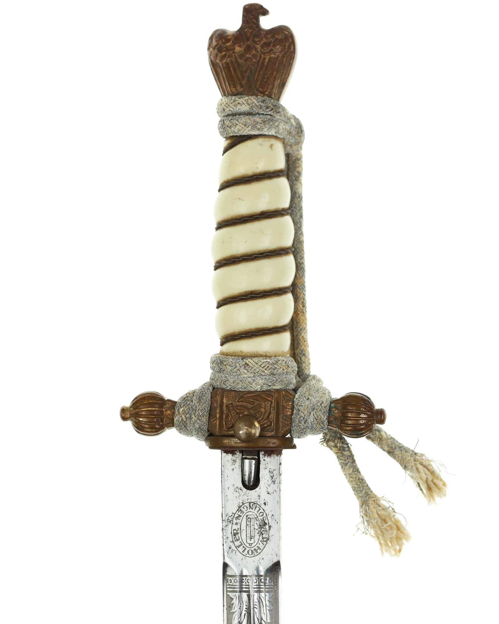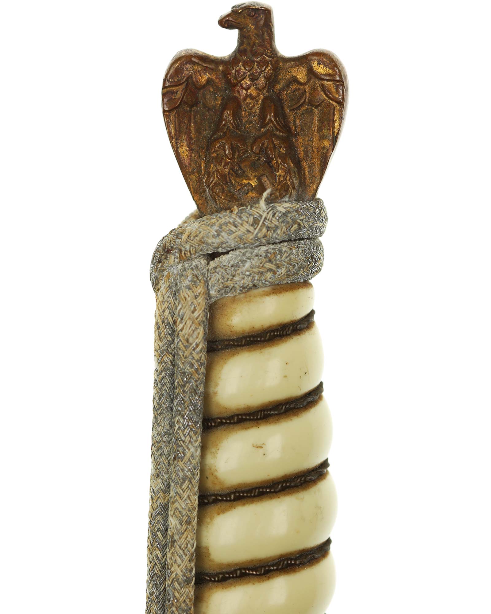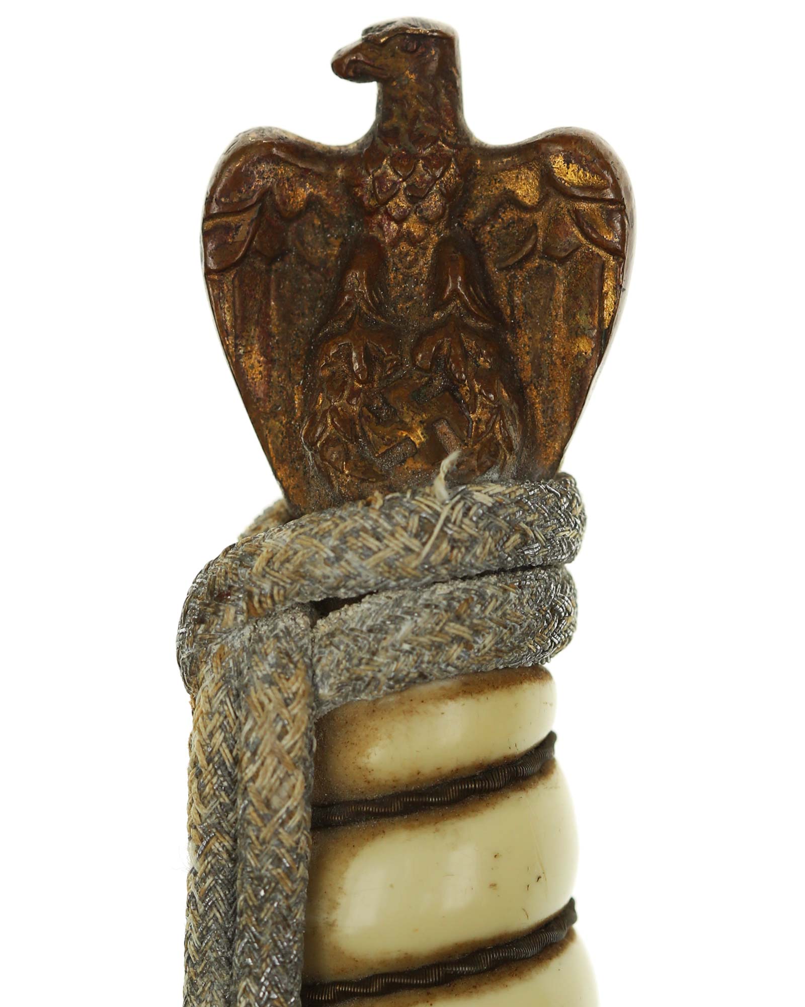Griff: Heller Griff, verläuft leicht oval. Der Griff ist mit einem Doppeldraht gewickelt. Die Parierstange und der Knauf sind aus Buntmetall gefertigt und vergoldet worden. Unterhalb der Parierstange befindet sich das originale Stoßleder. Der Knauf ist in Form eines Adlers, der mit seinen Krallen das Hakenkreuz in einem Kranz festhält.