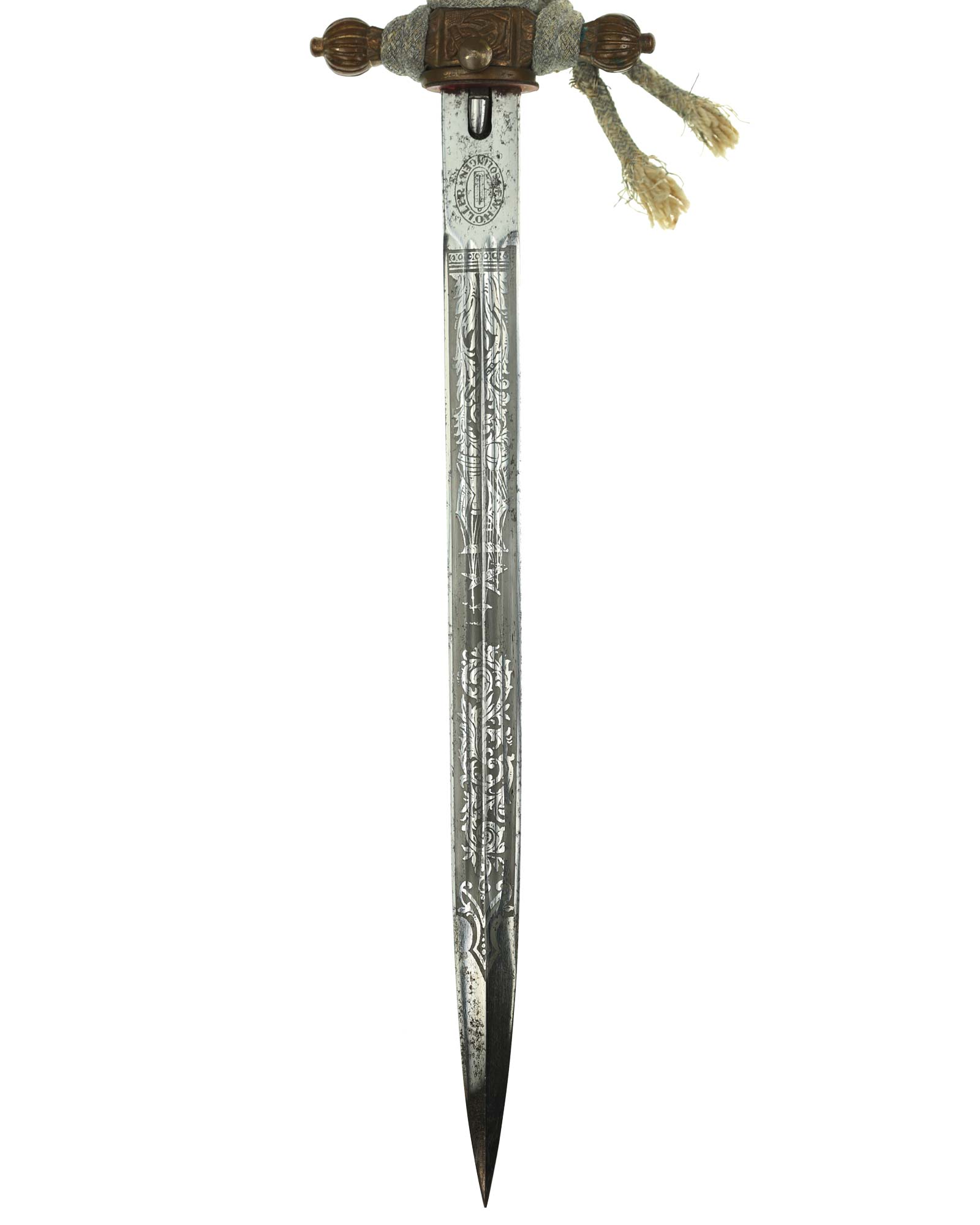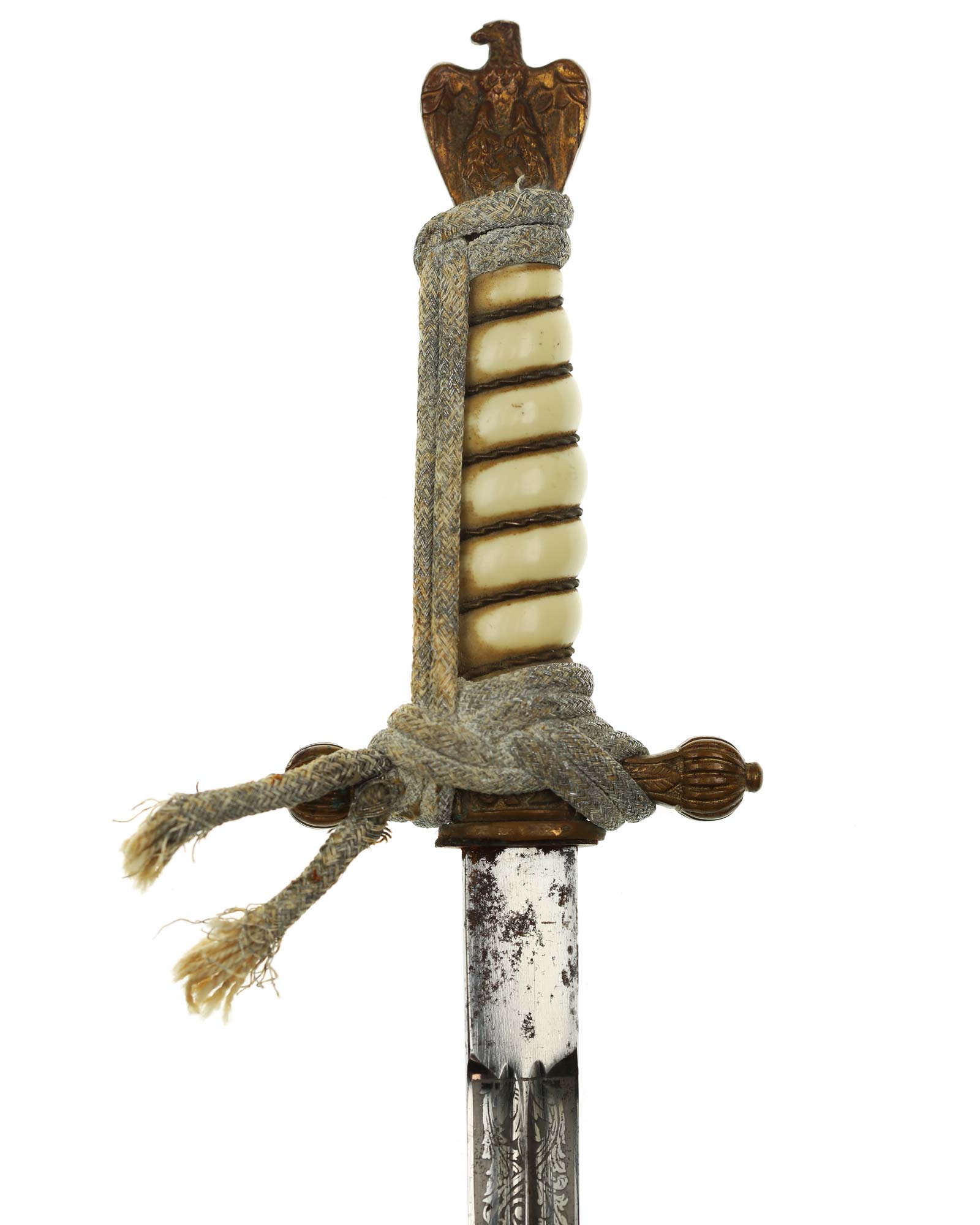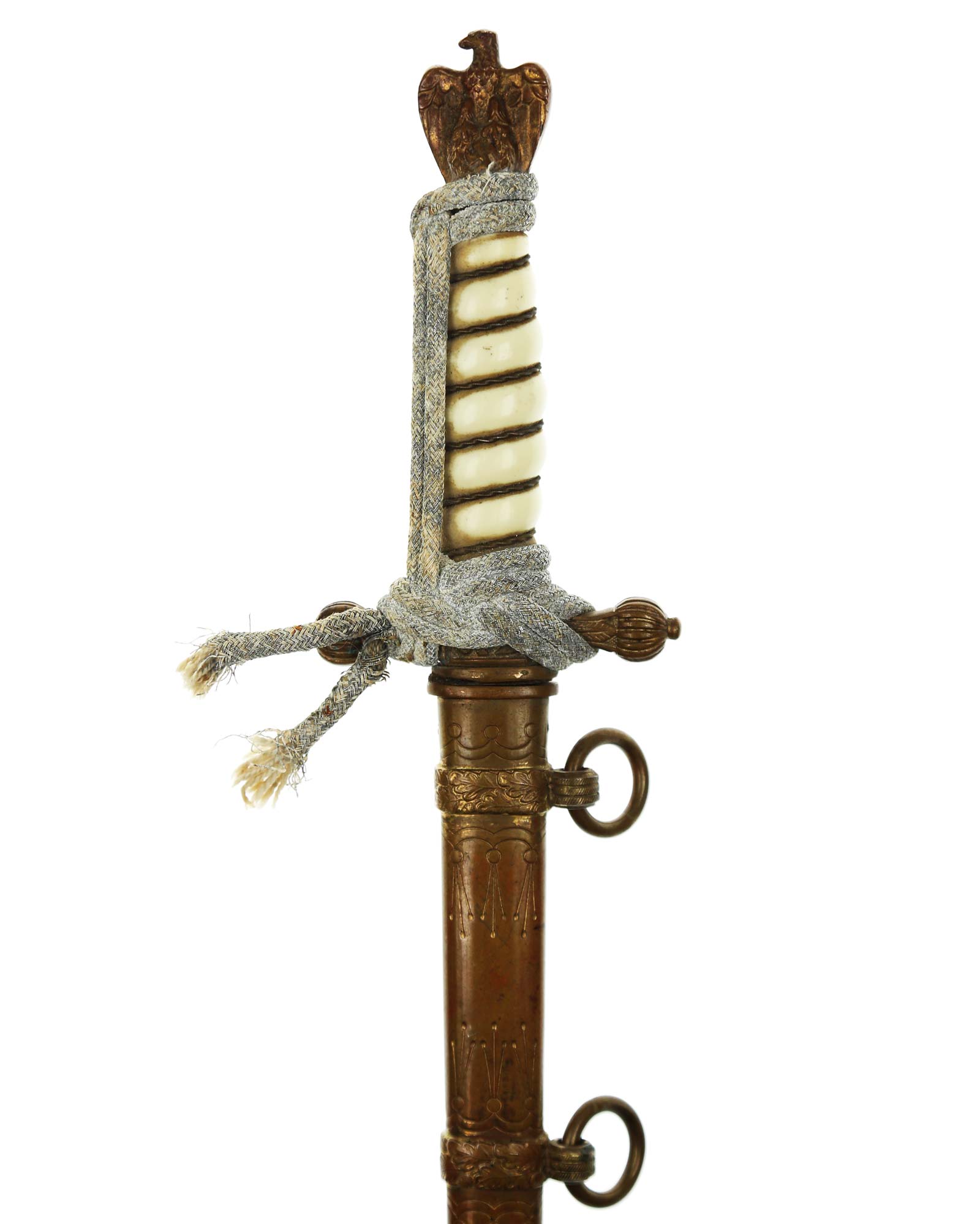 Griff: Heller Griff, verläuft leicht oval. Der Griff ist mit einem Doppeldraht gewickelt. Die Parierstange und der Knauf sind aus Buntmetall gefertigt und vergoldet worden. Unterhalb der Parierstange befindet sich das originale Stoßleder. Der Knauf ist in Form eines Adlers, der mit seinen Krallen das Hakenkreuz in einem Kranz festhält.