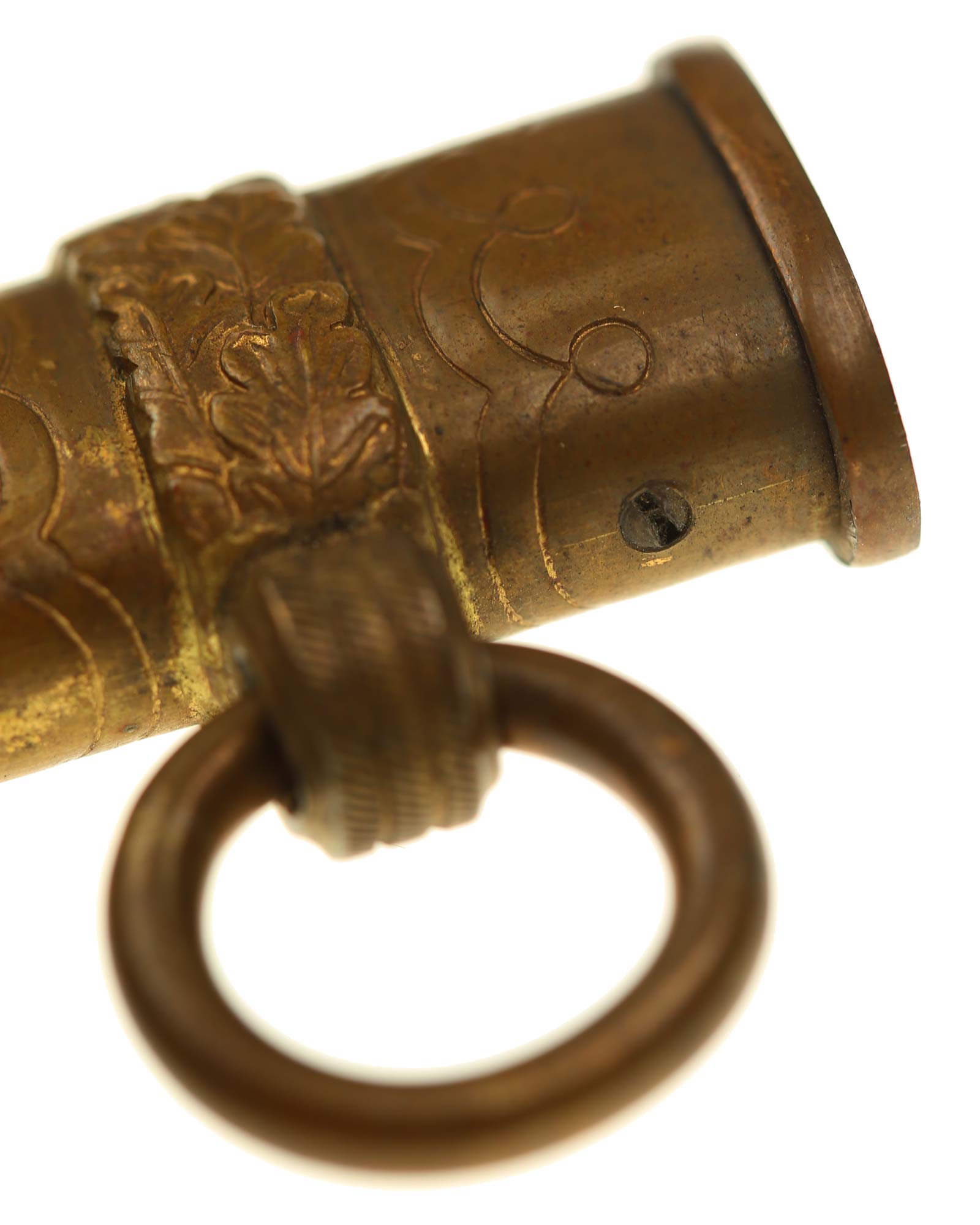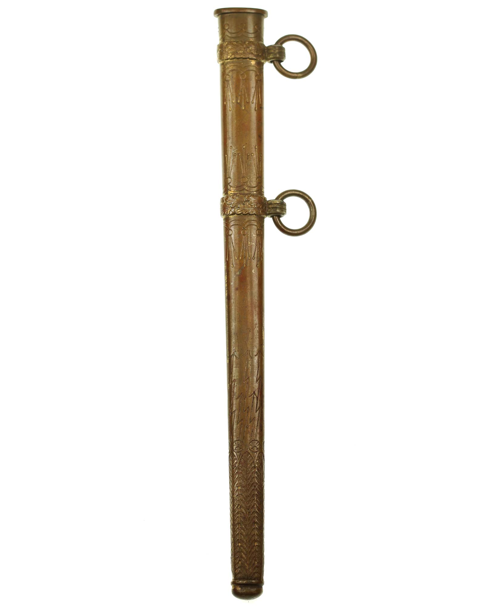 Scheide: Blitzscheide ohne Dellen. Die Ringbänder sind mit Eichenlaubdekor. Das Mundblech wird anhand von zwei seitlich befestigten Schrauben festgehalten. Die beiden Trageringe sind geschlossen.