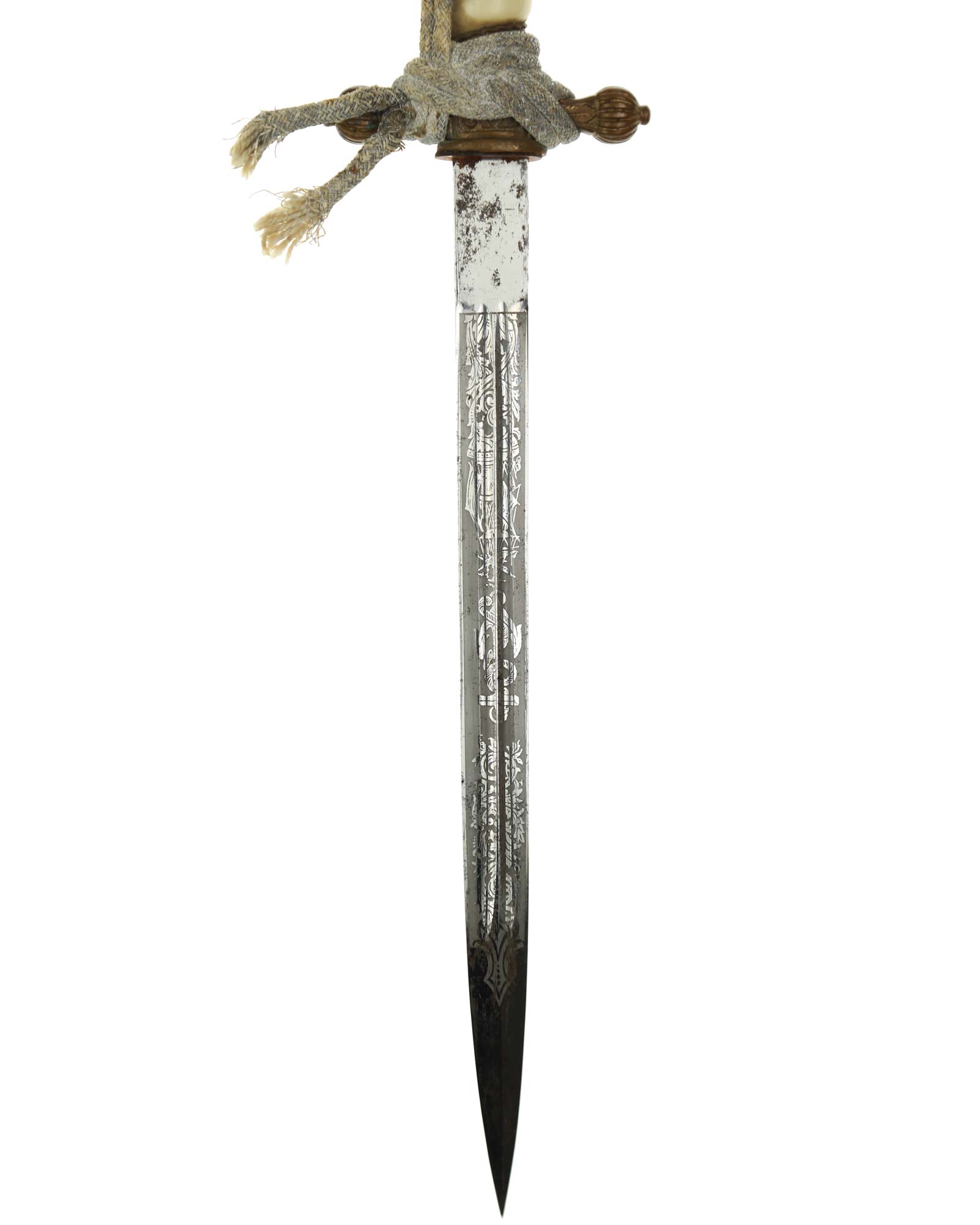 Klinge: Die Klinge ist blank und gut erhalten. Die Klinge ist beidseitig mit Ätzung (Marinemotive). Auf der Rückseite befindet sich das Herstellerlogo: F.W. Höller Solingen. Oberhalb des Herstellerlogos ist der intakte Druckknopf. Zweischneidige Klinge mit unbeschädigter Spitze.