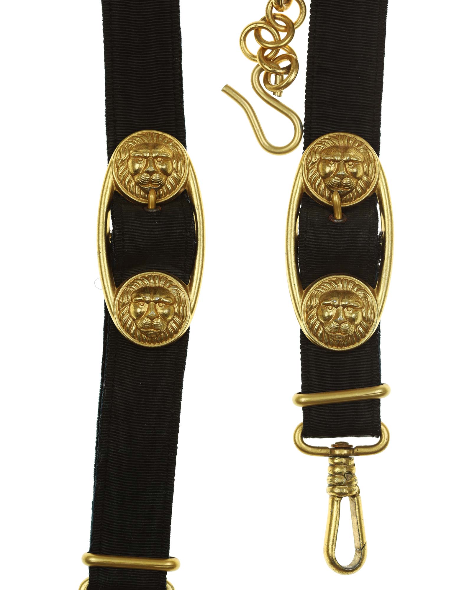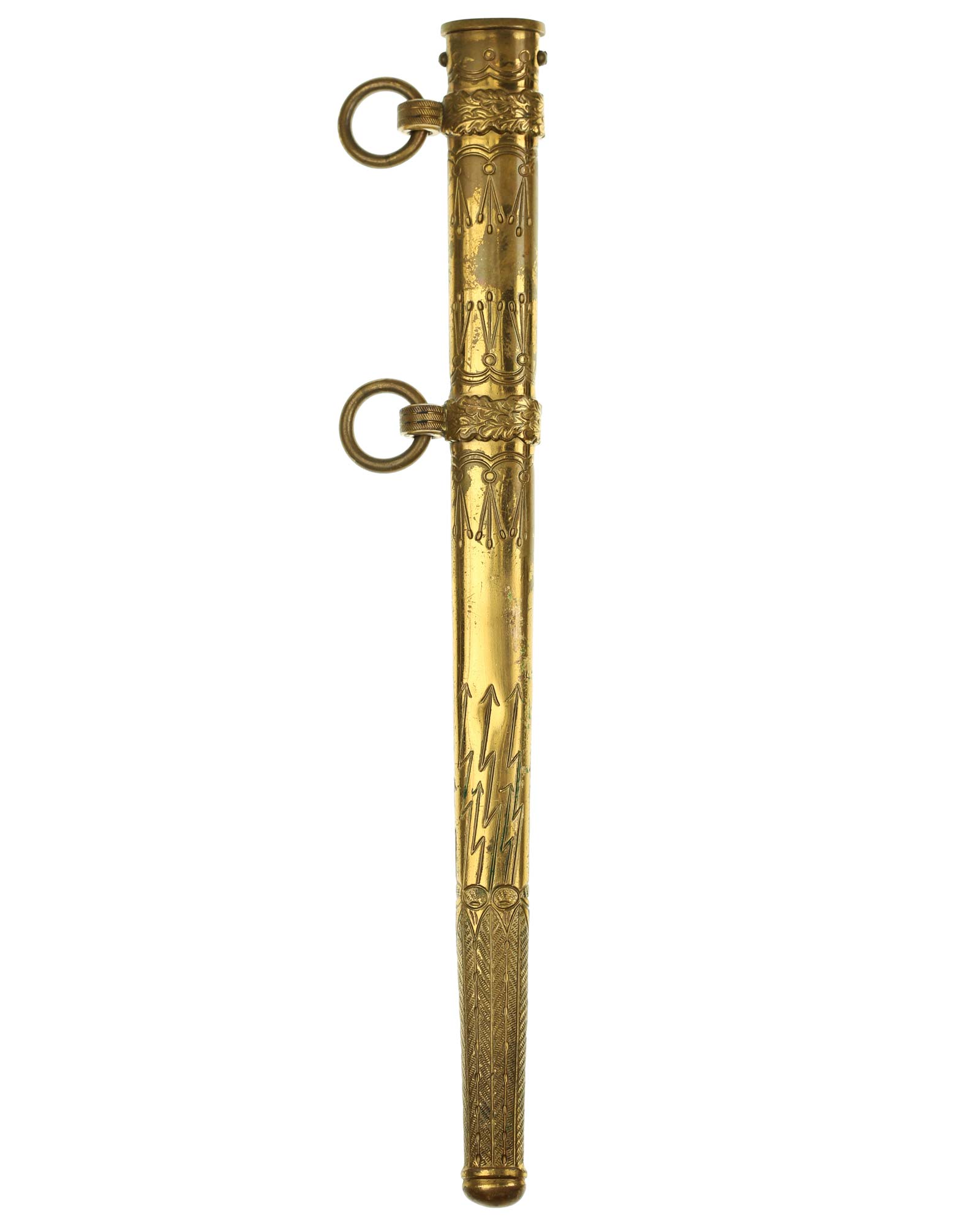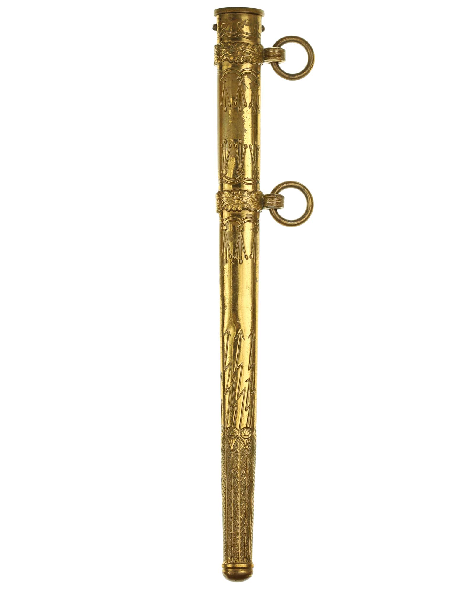 Scheide: Blitzscheide. Die Ringbänder sind mit Eichenlaubdekor. Das Mundblech wird anhand von zwei seitlich befestigten Schrauben festgehalten. Die beiden Trageringe sind geschlossen.
