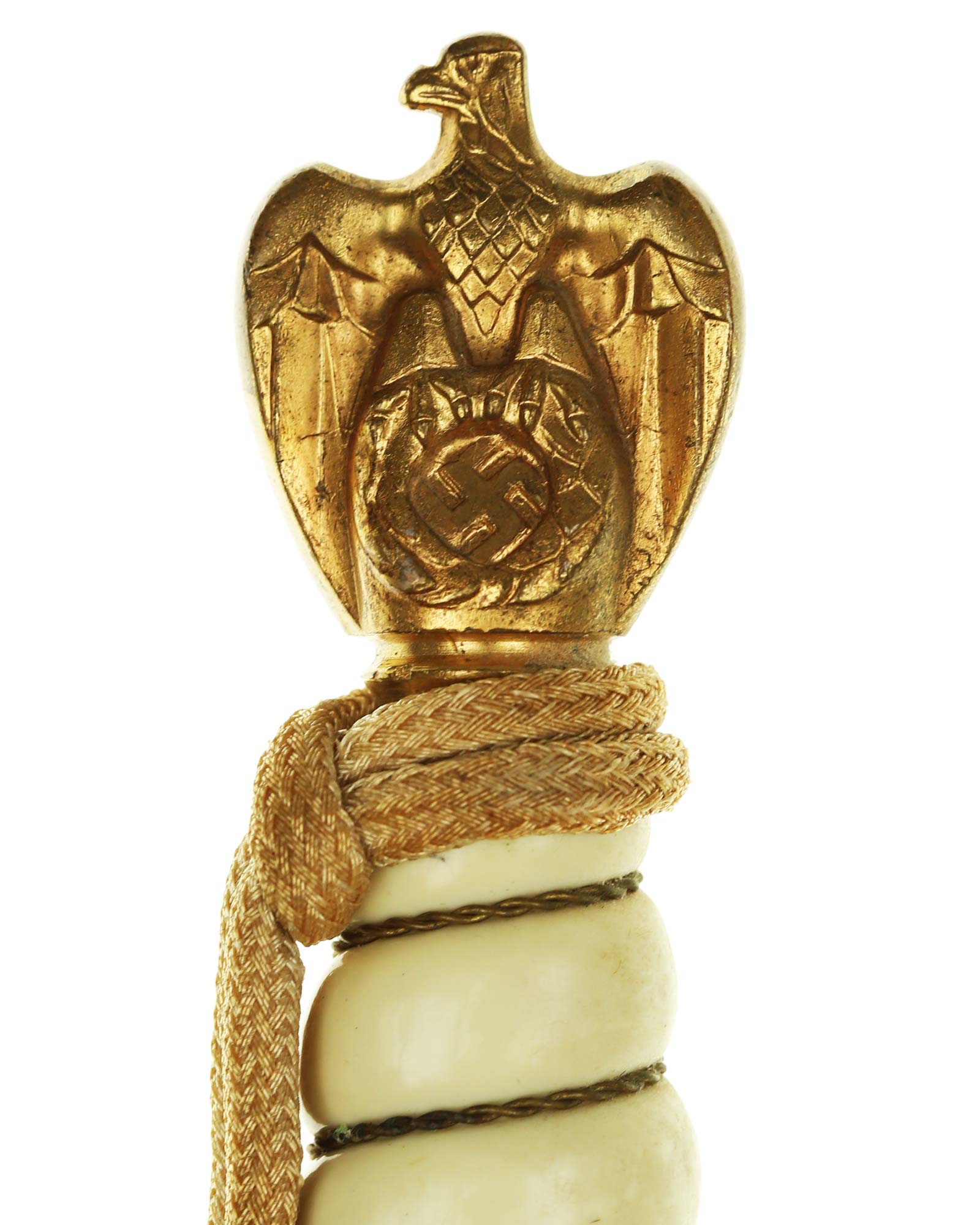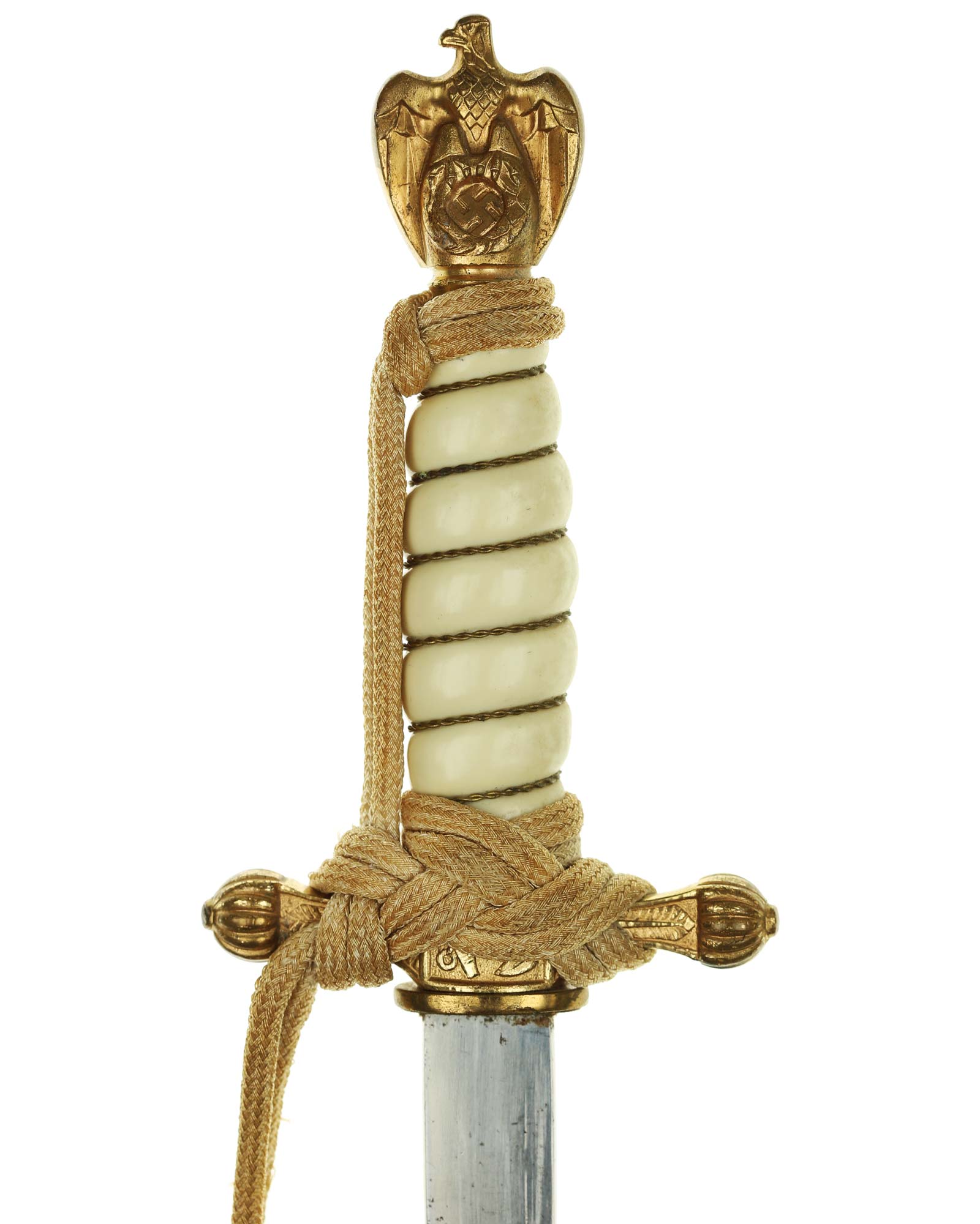 Griff: Heller Griff, verläuft leicht oval. Der Griff ist mit einem Doppeldraht gewickelt. Die Parierstange und der Knauf sind aus Buntmetall gefertigt und vergoldet worden. Unterhalb der Parierstange befindet sich das Stoßleder. Der Knauf ist in Form eines Adlers, der mit seinen Krallen das Hakenkreuz in einem Kranz festhält.