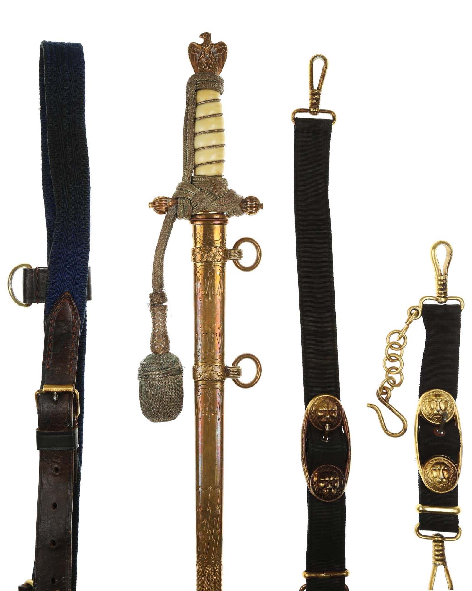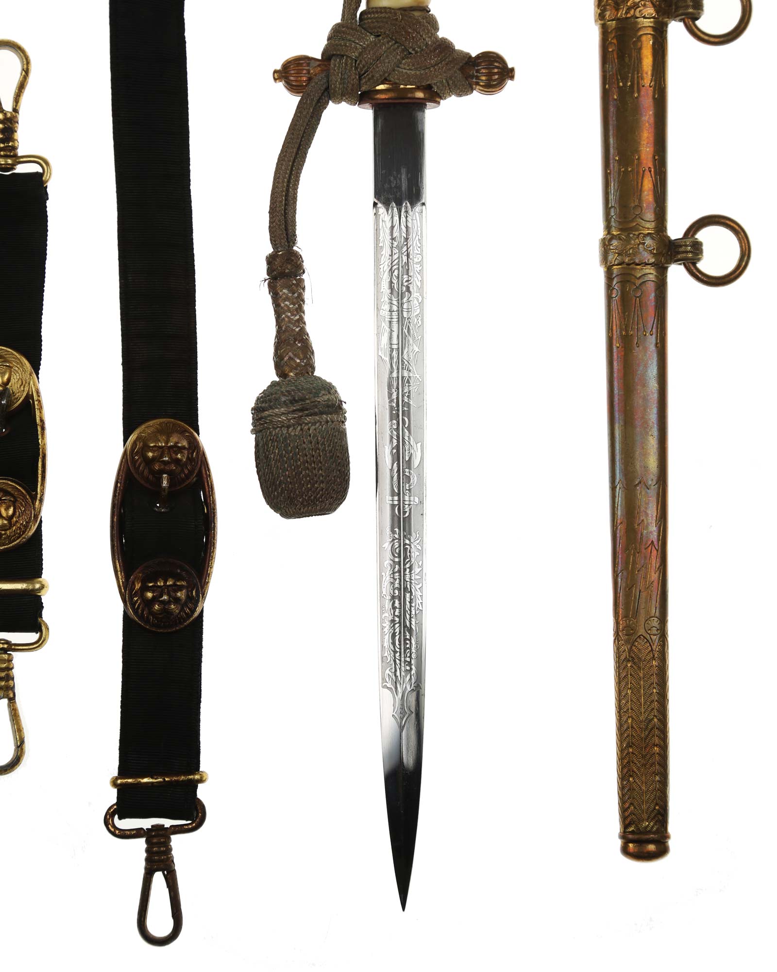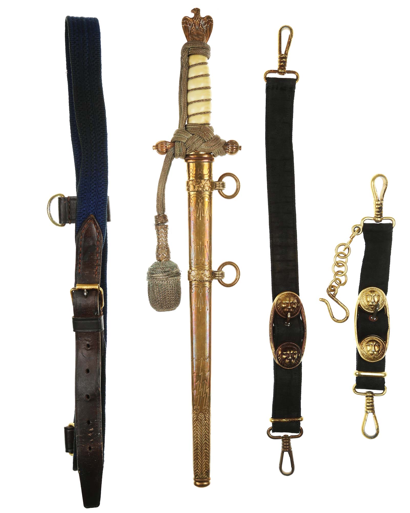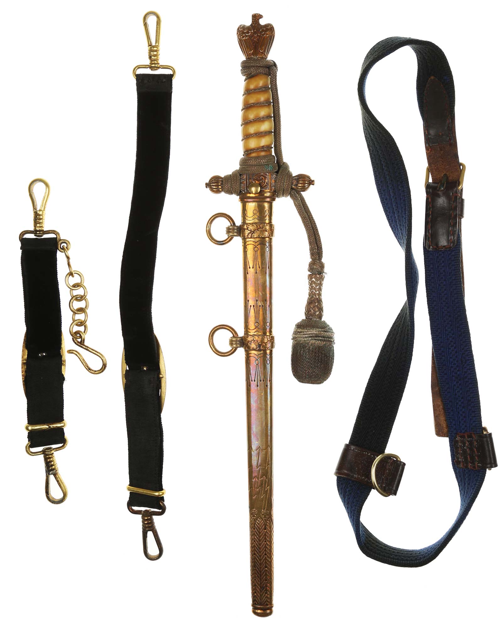 Kriegsmarine Offiziersdolch (Modell 1938) mit dem Hersteller auf der Klinge: F.W. Höller Solingen. Gesamtlänge beträgt 41,8 cm. Kriegsmarine Dolch mit dazugehörigem Portepee und zweiteiligem Gehänge.