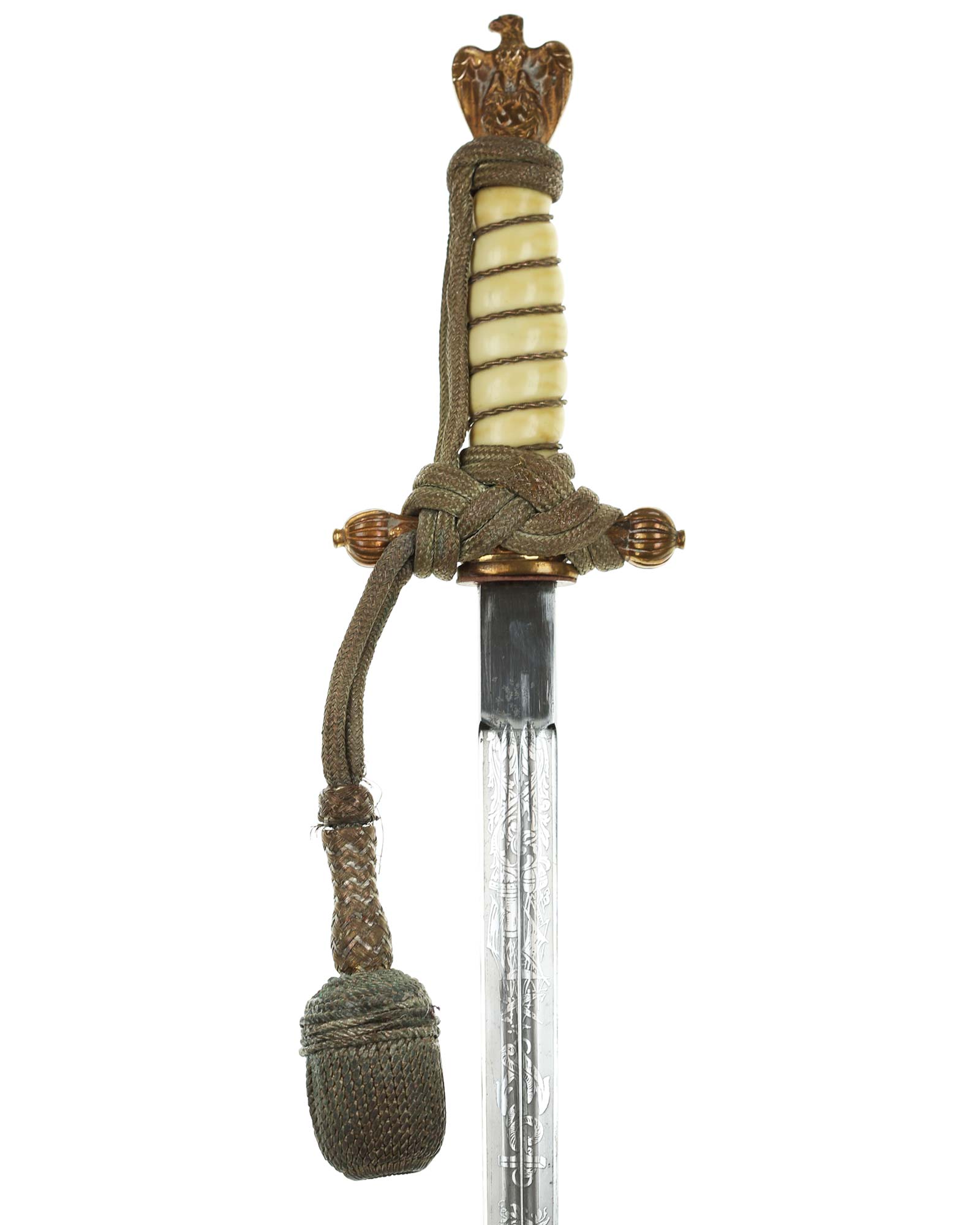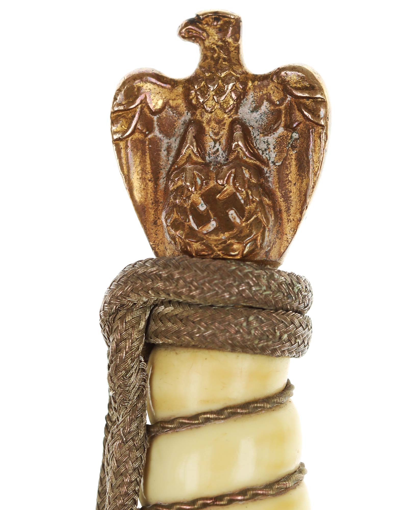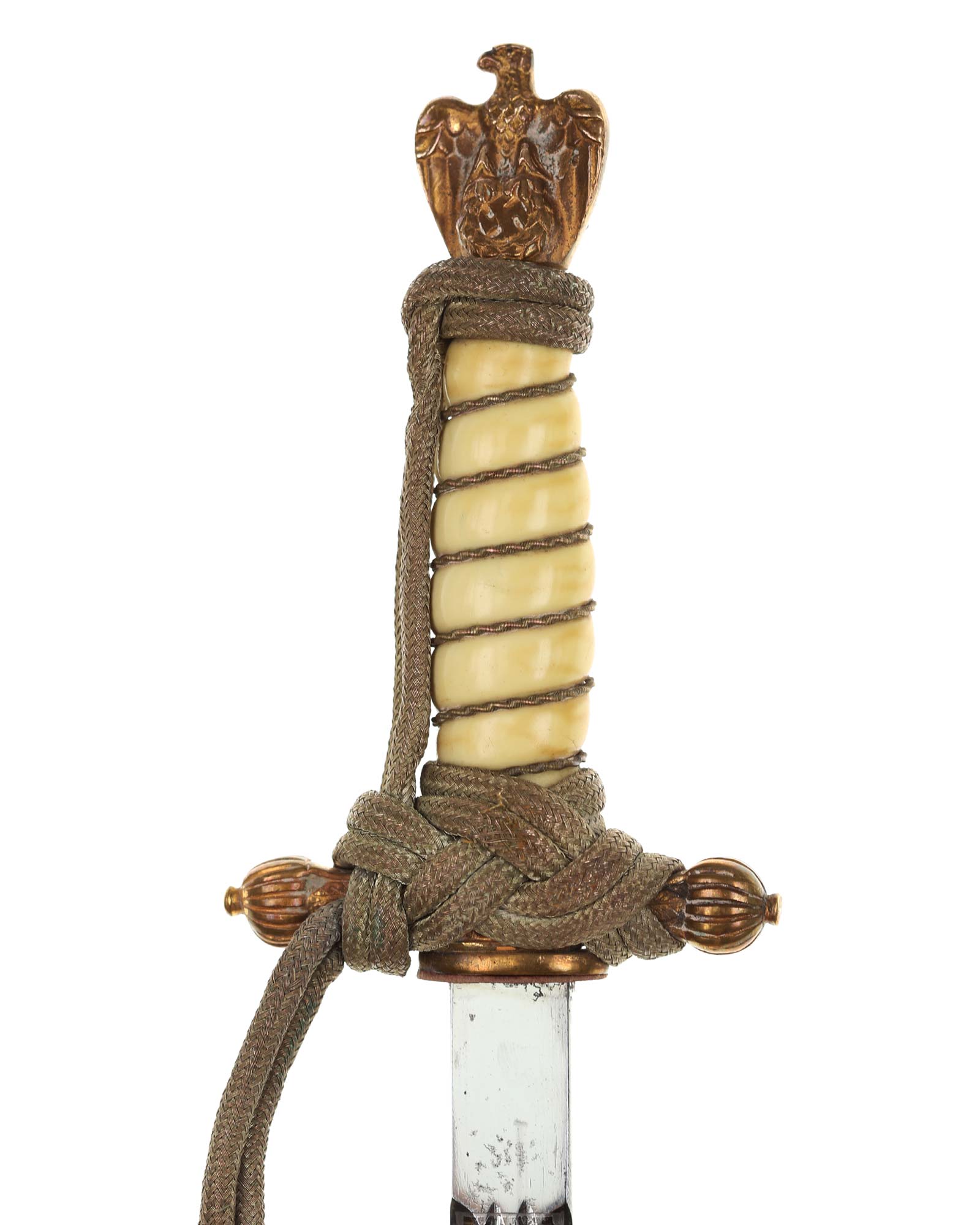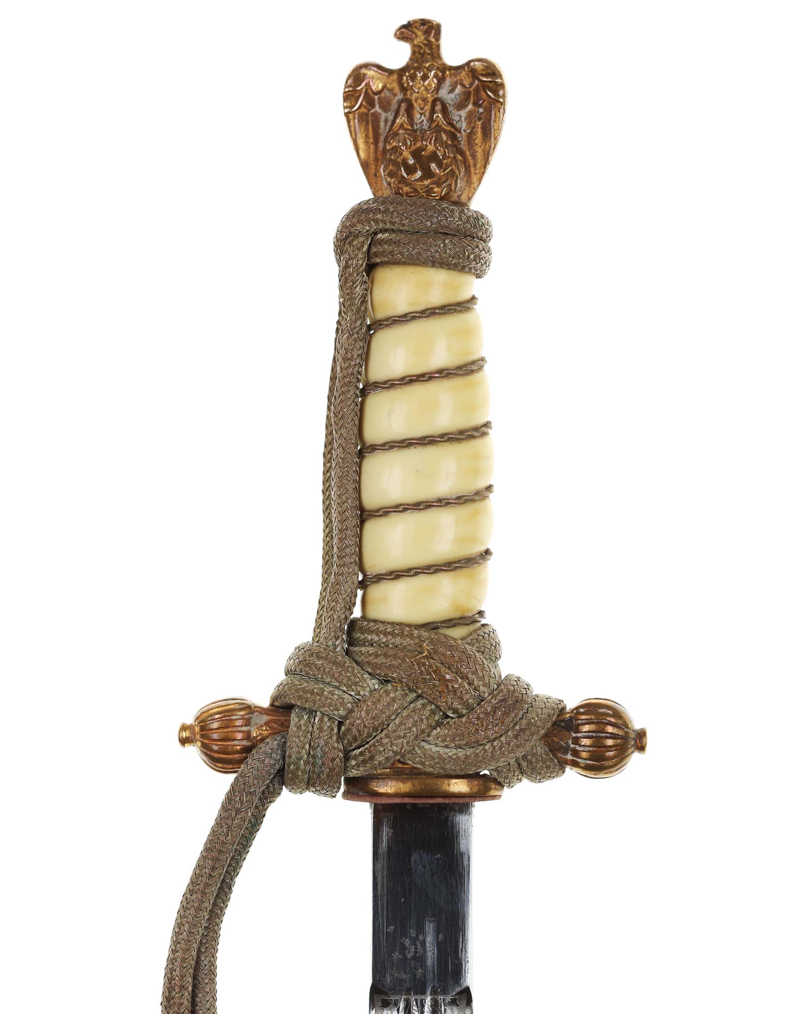 Griff: Heller Griff, verläuft leicht oval. Der Griff ist mit einem Doppeldraht gewickelt. Die Parierstange und der Knauf sind aus Buntmetall gefertigt und vergoldet worden. Unterhalb der Parierstange befindet sich das Stoßleder. Der Knauf ist in Form eines Adlers, der mit seinen Krallen das Hakenkreuz in einem Kranz festhält.