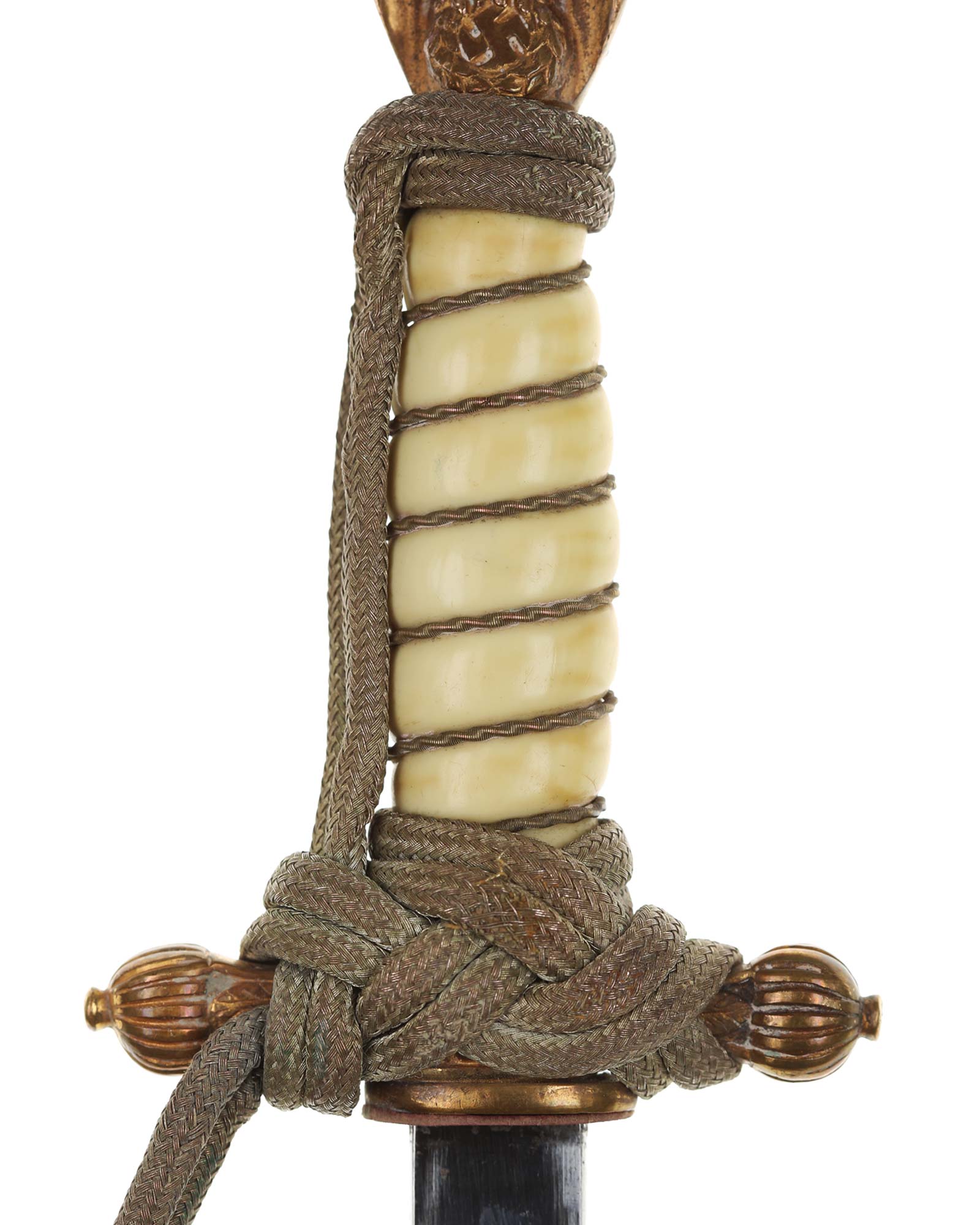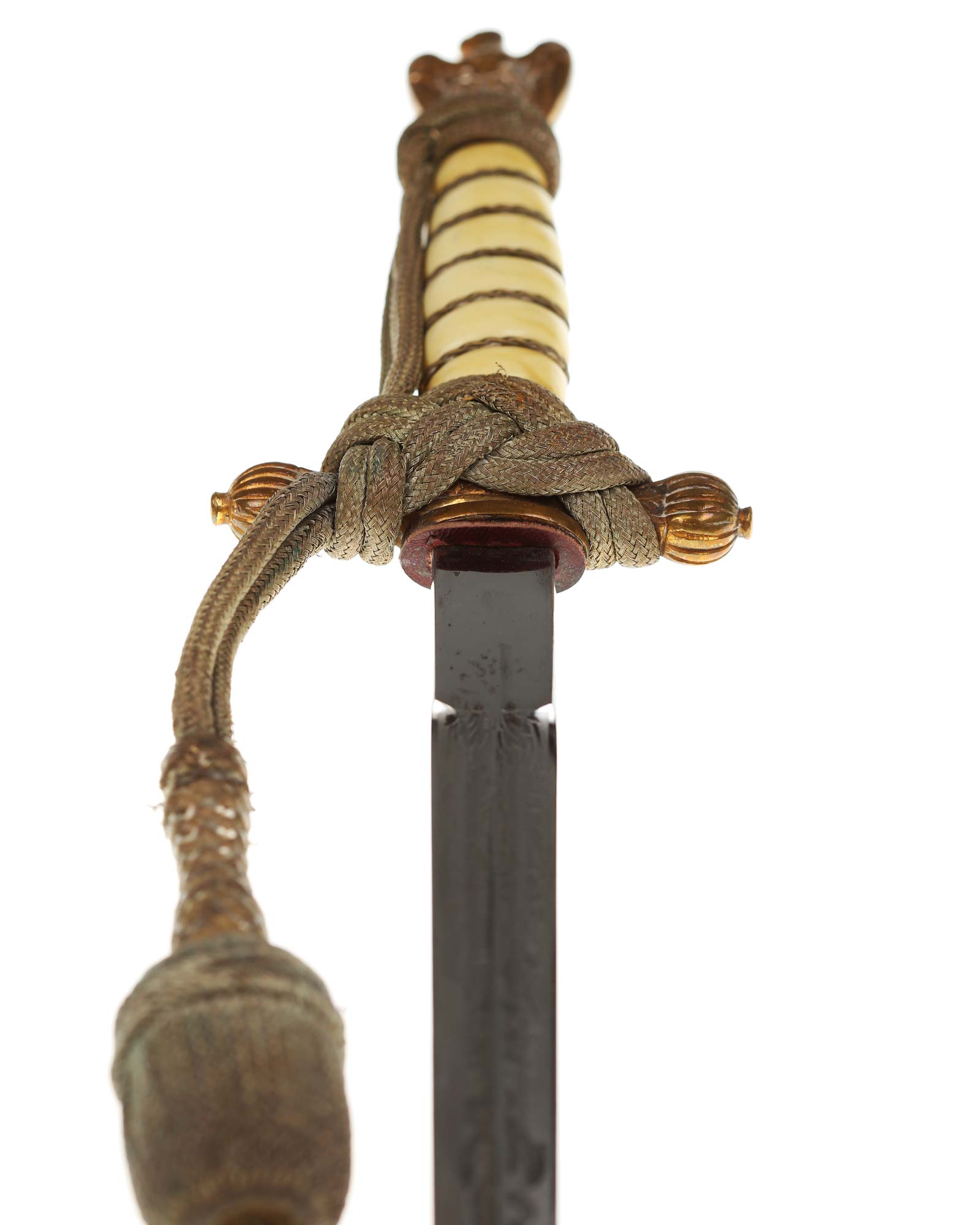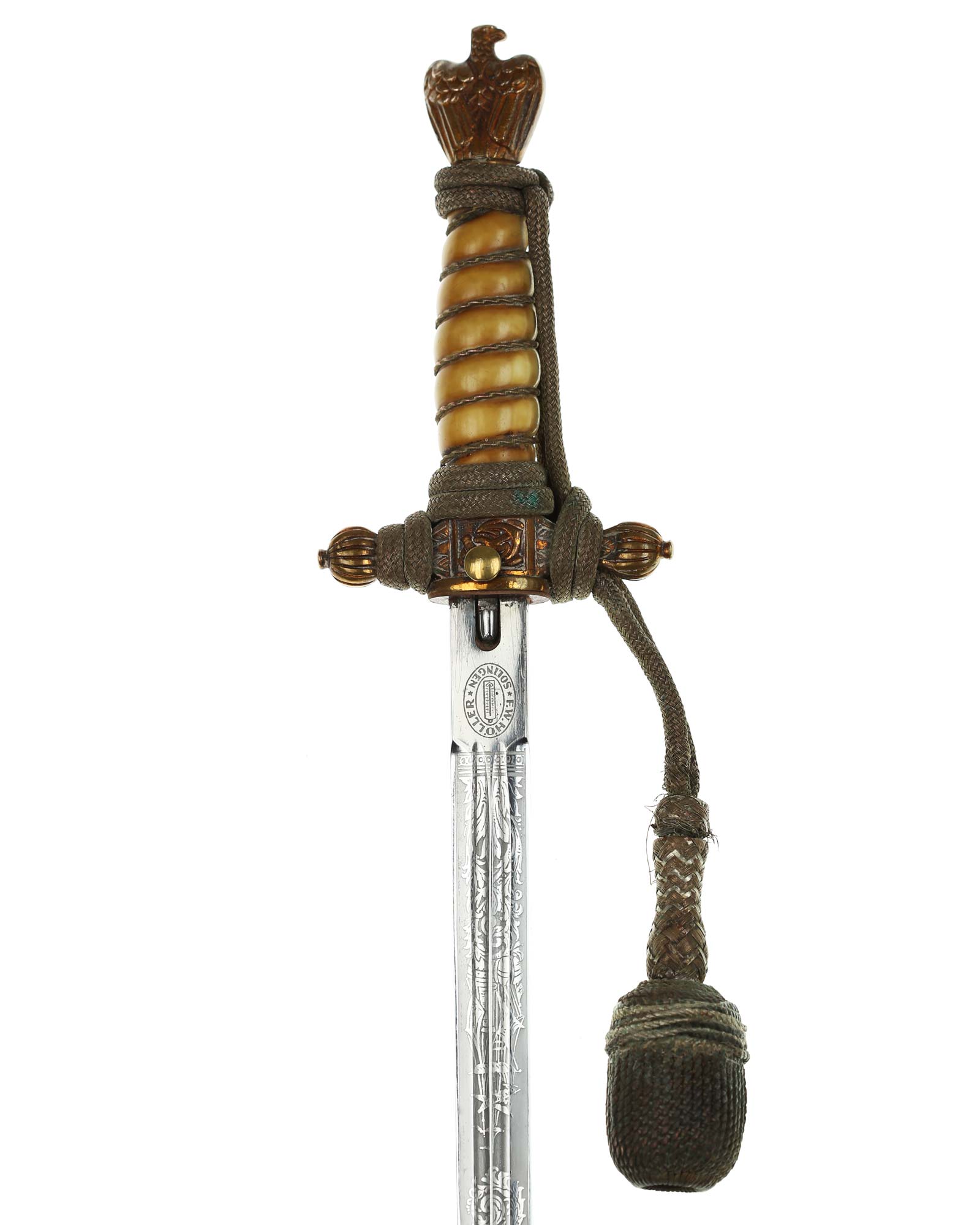 Griff: Heller Griff, verläuft leicht oval. Der Griff ist mit einem Doppeldraht gewickelt. Die Parierstange und der Knauf sind aus Buntmetall gefertigt und vergoldet worden. Unterhalb der Parierstange befindet sich das Stoßleder. Der Knauf ist in Form eines Adlers, der mit seinen Krallen das Hakenkreuz in einem Kranz festhält.