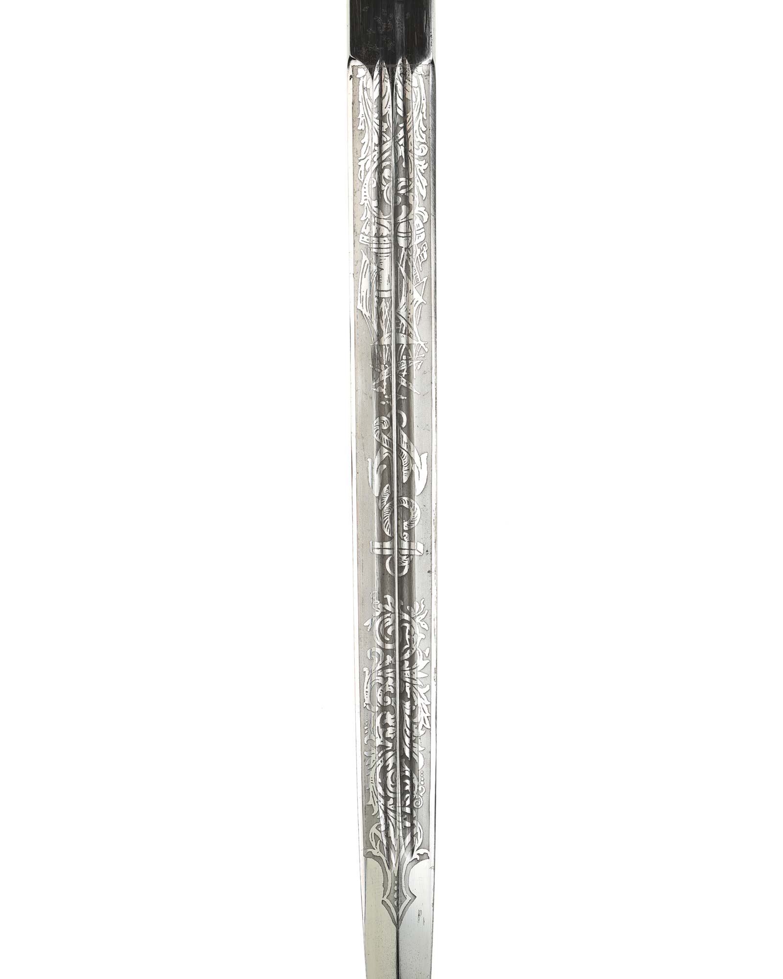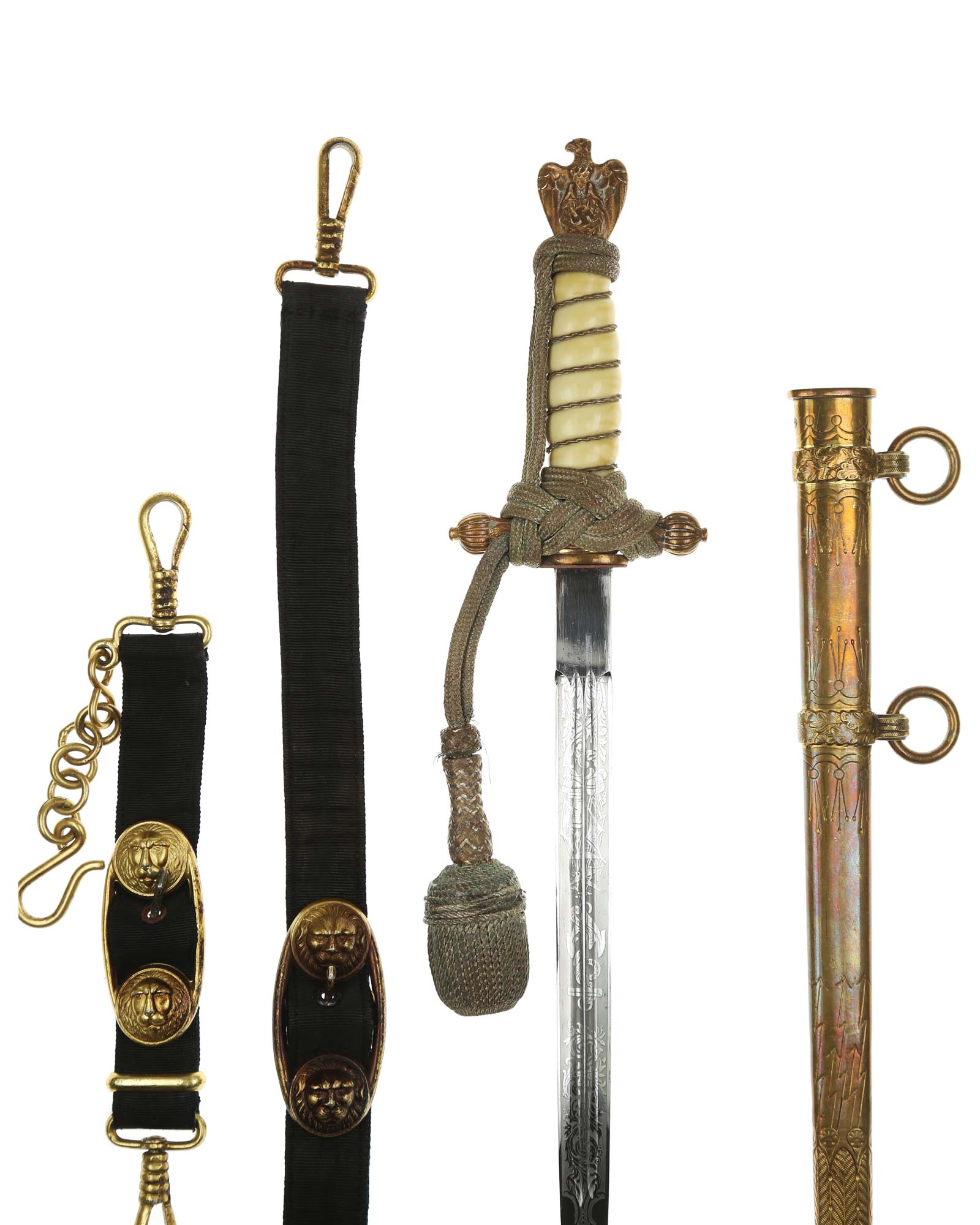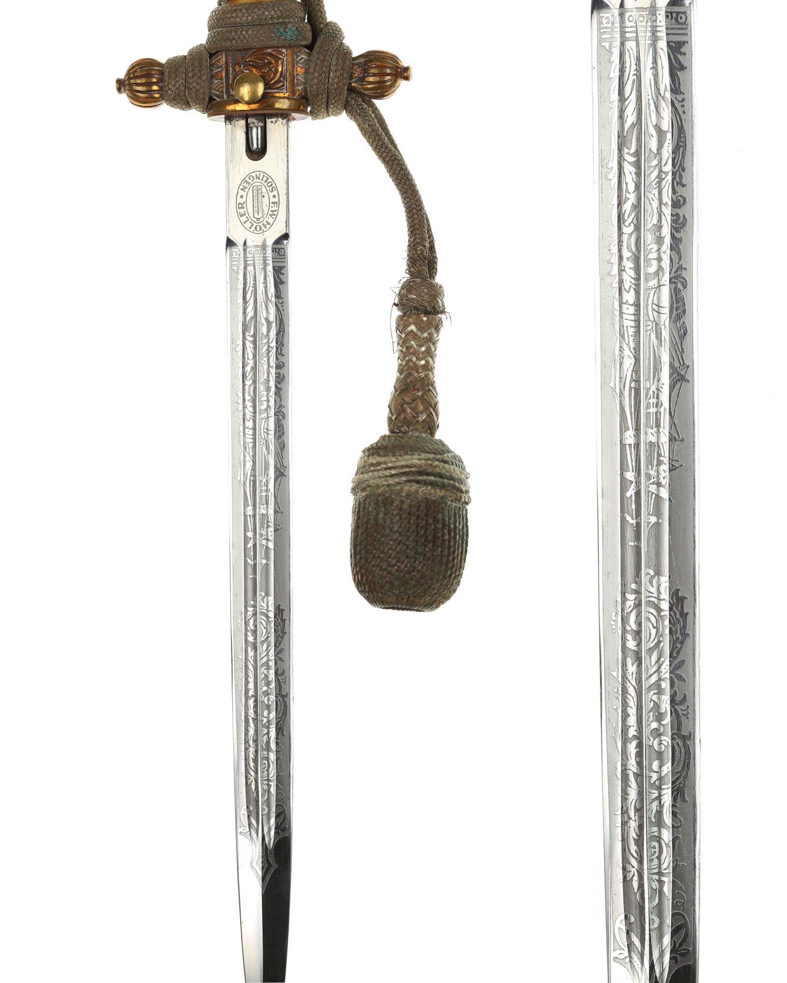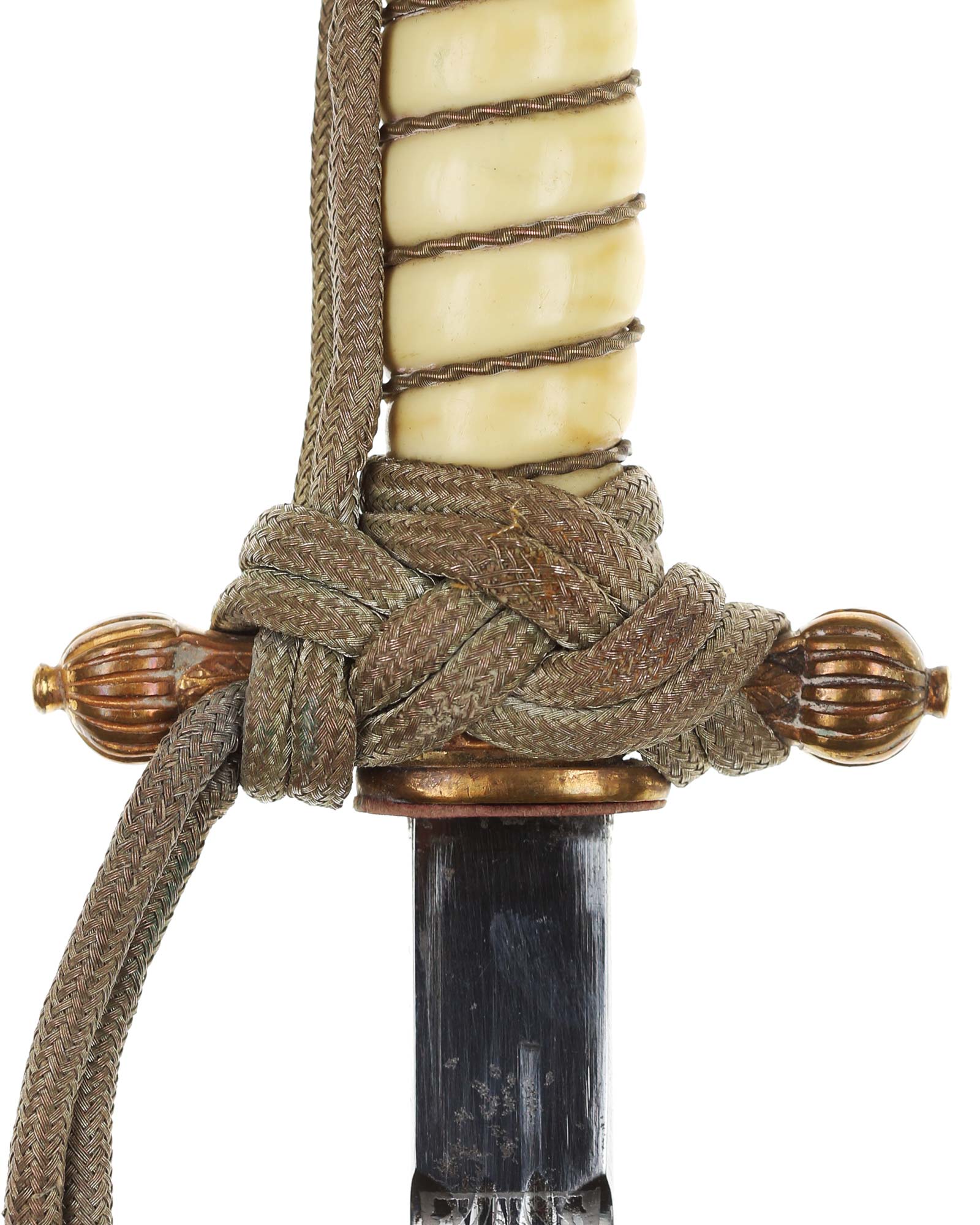 Griff: Heller Griff, verläuft leicht oval. Der Griff ist mit einem Doppeldraht gewickelt. Die Parierstange und der Knauf sind aus Buntmetall gefertigt und vergoldet worden. Unterhalb der Parierstange befindet sich das Stoßleder. Der Knauf ist in Form eines Adlers, der mit seinen Krallen das Hakenkreuz in einem Kranz festhält.