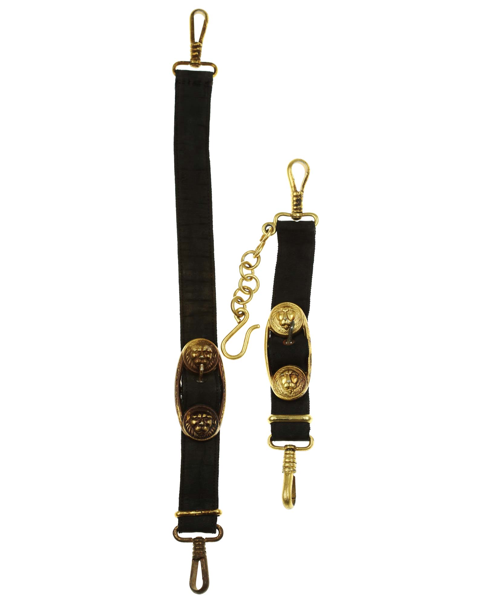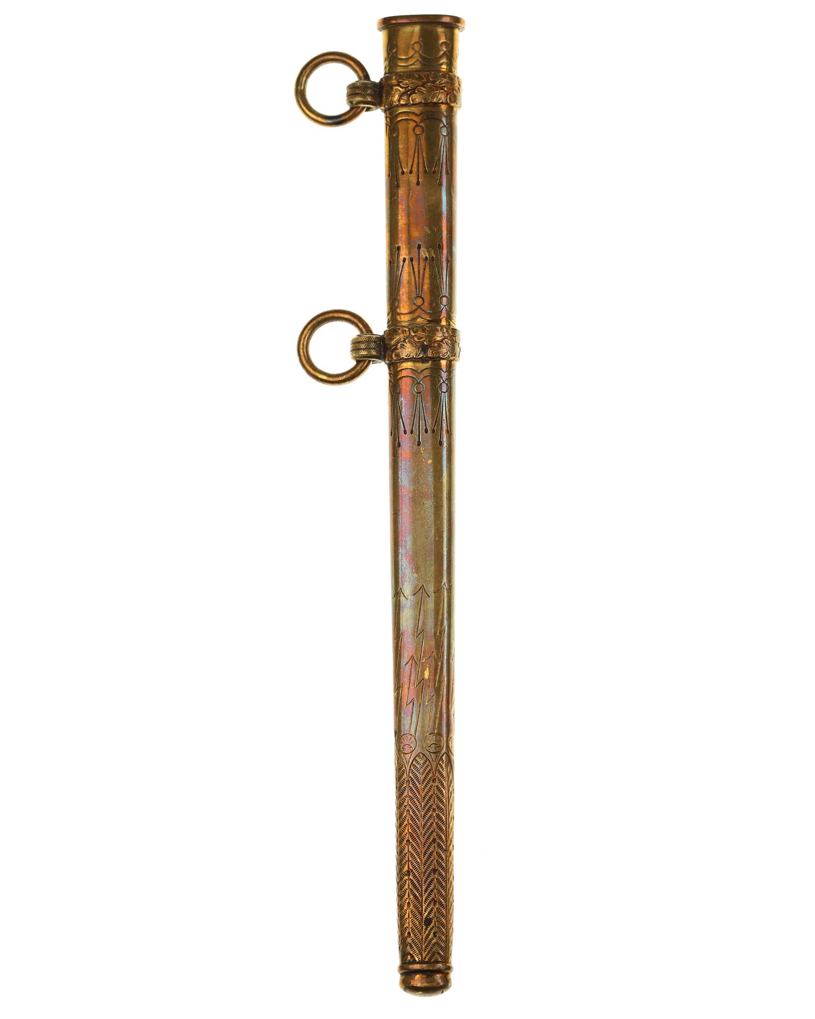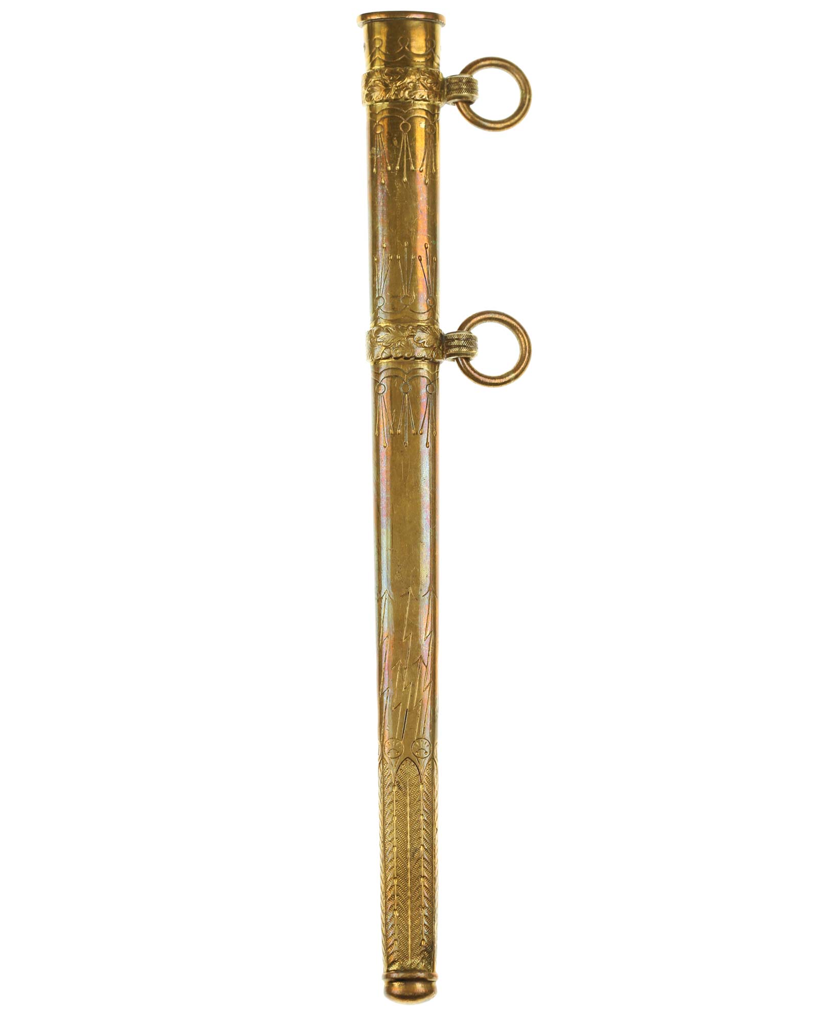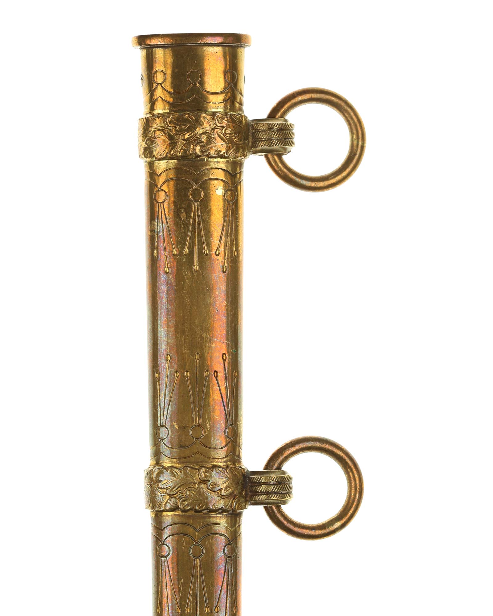 Scheide: Blitzscheide. Die Ringbänder sind mit Eichenlaubdekor. Das Mundblech wird anhand von zwei seitlich befestigten Schrauben festgehalten. Die beiden Trageringe sind geschlossen.
