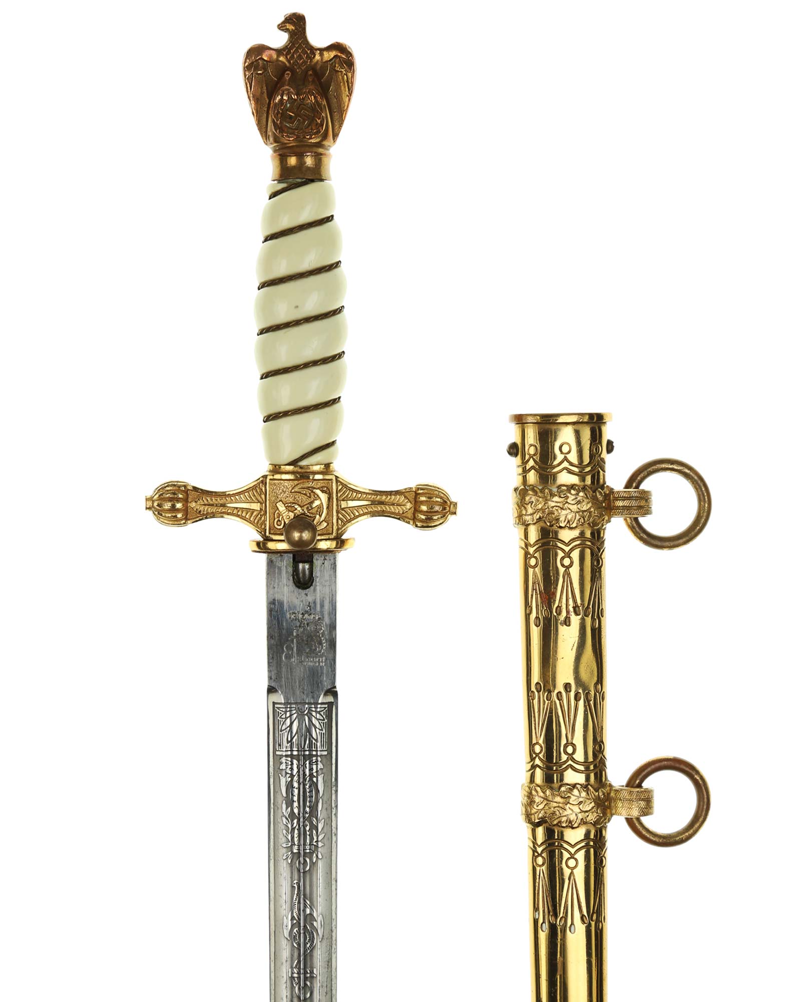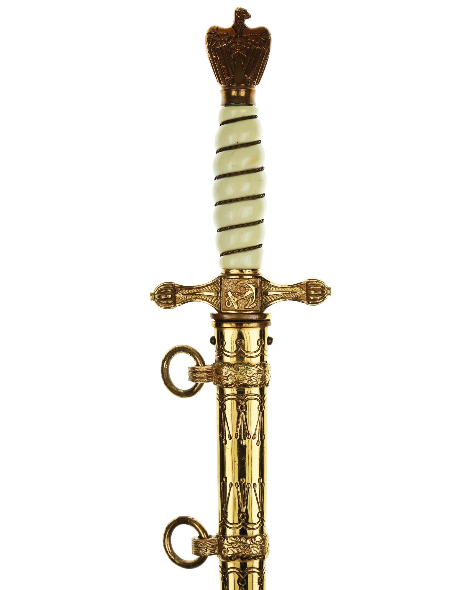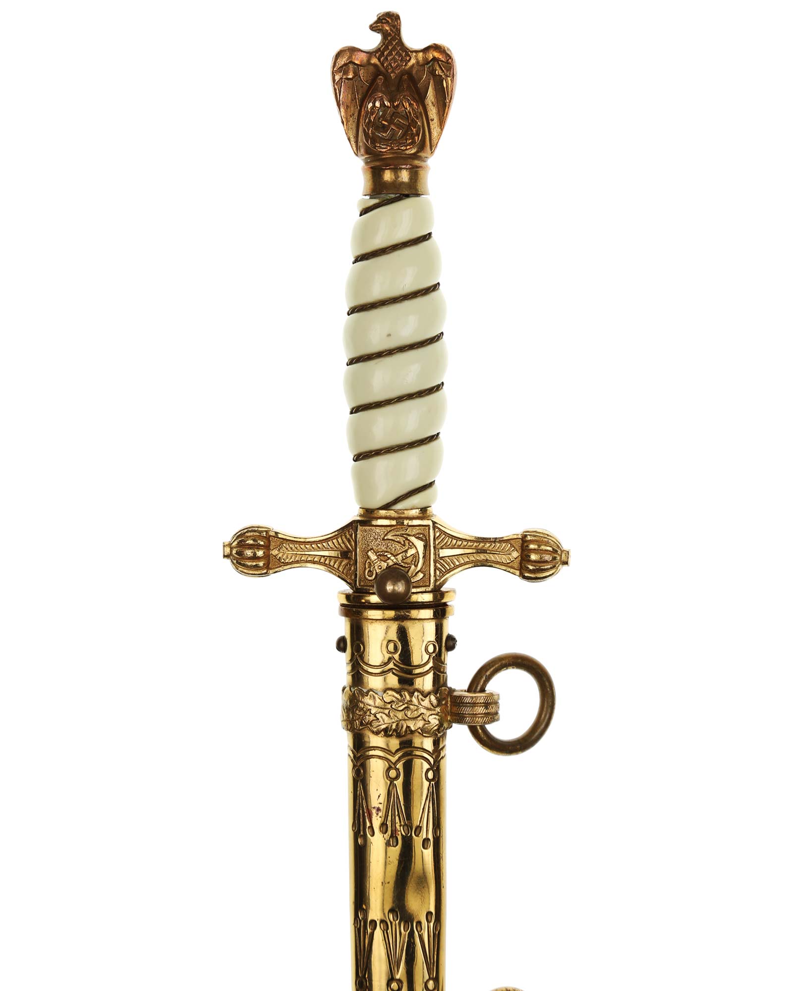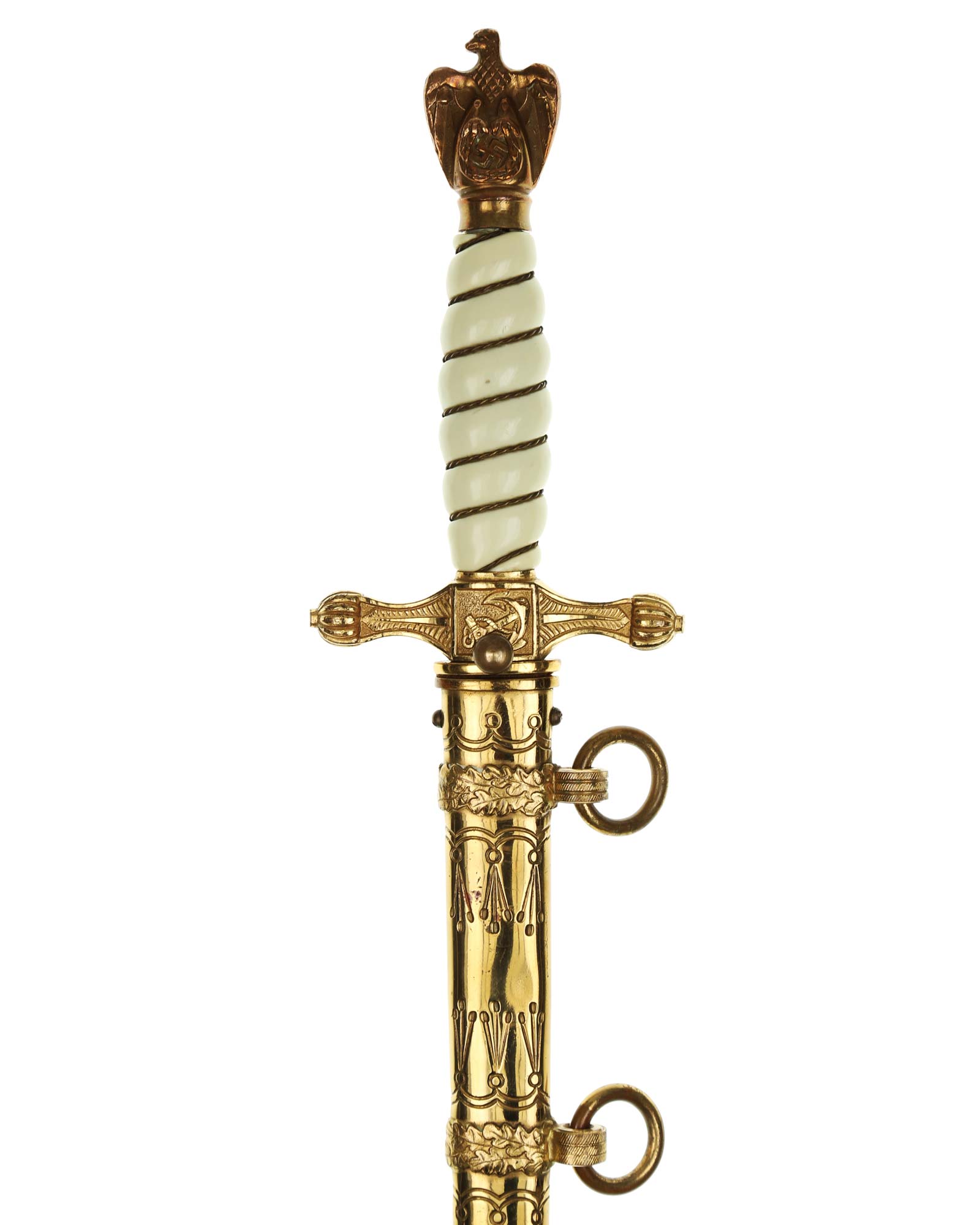 Griff: Heller Griff, verläuft leicht oval. Der Griff ist mit einem Doppeldraht gewickelt. Die Parierstange und der Knauf sind aus Buntmetall gefertigt und vergoldet worden. Unterhalb der Parierstange befindet sich das Stoßleder. Der Knauf ist in Form eines Adlers, der mit seinen Krallen das Hakenkreuz in einem Kranz festhält.