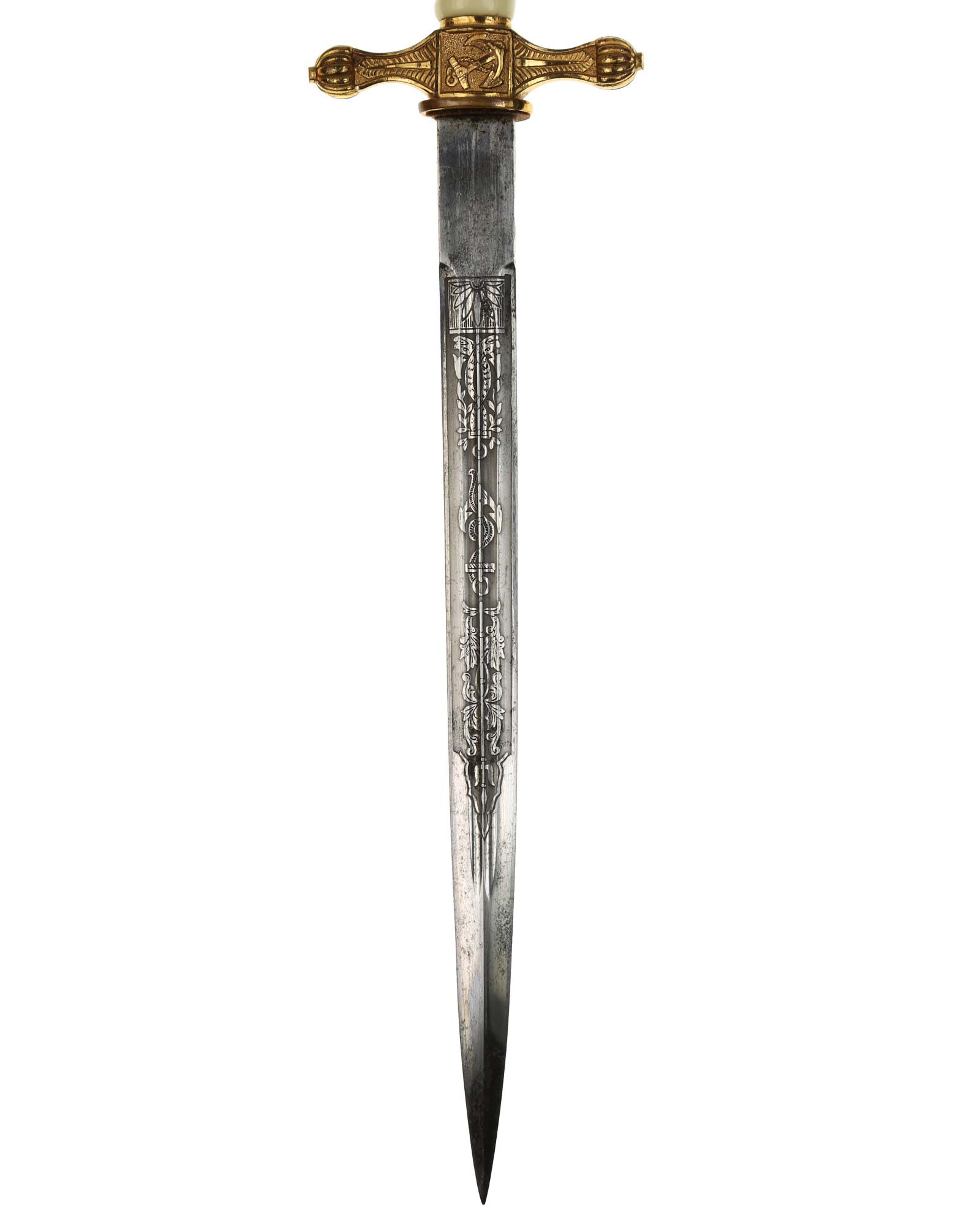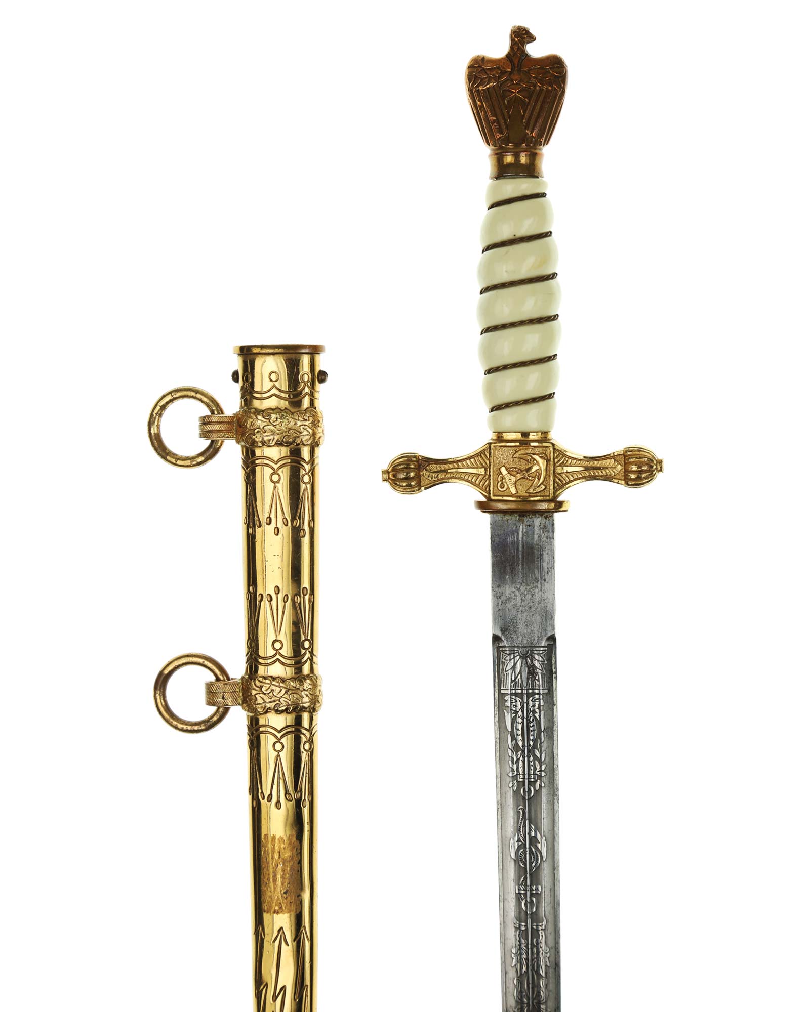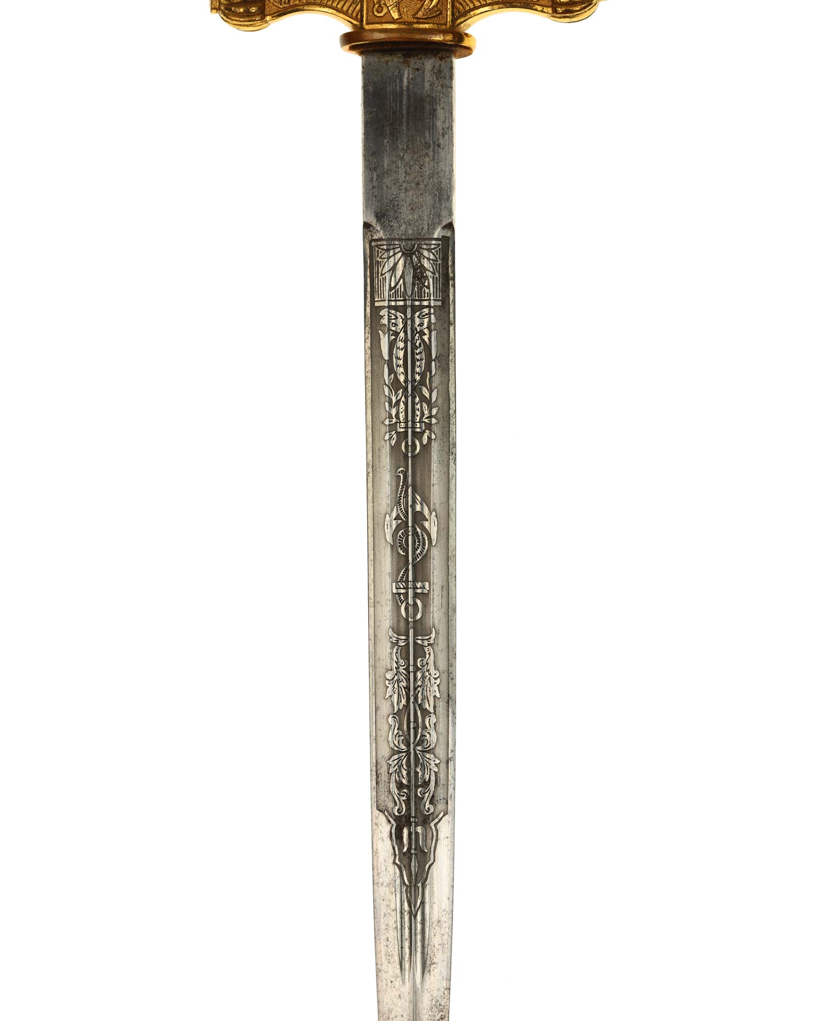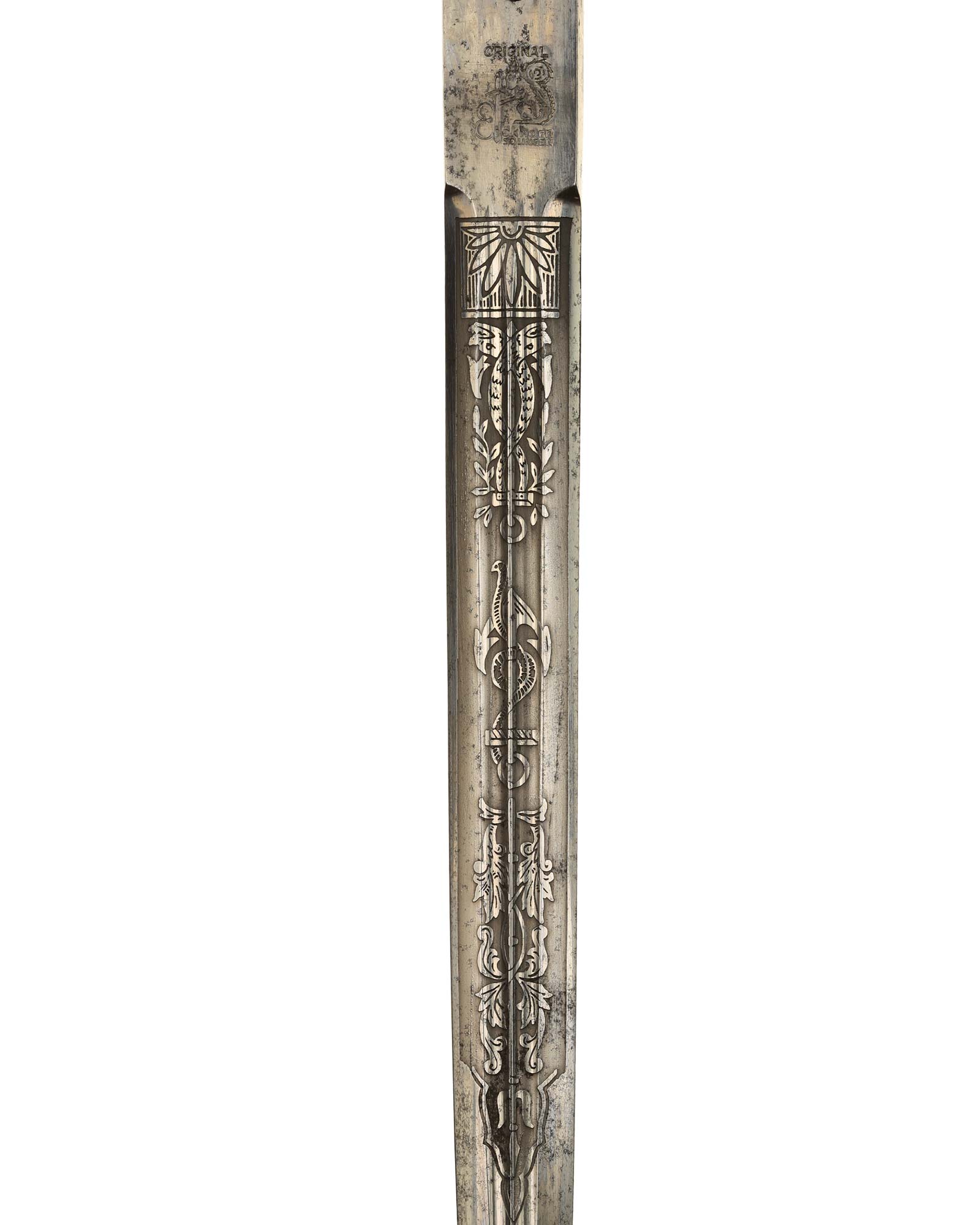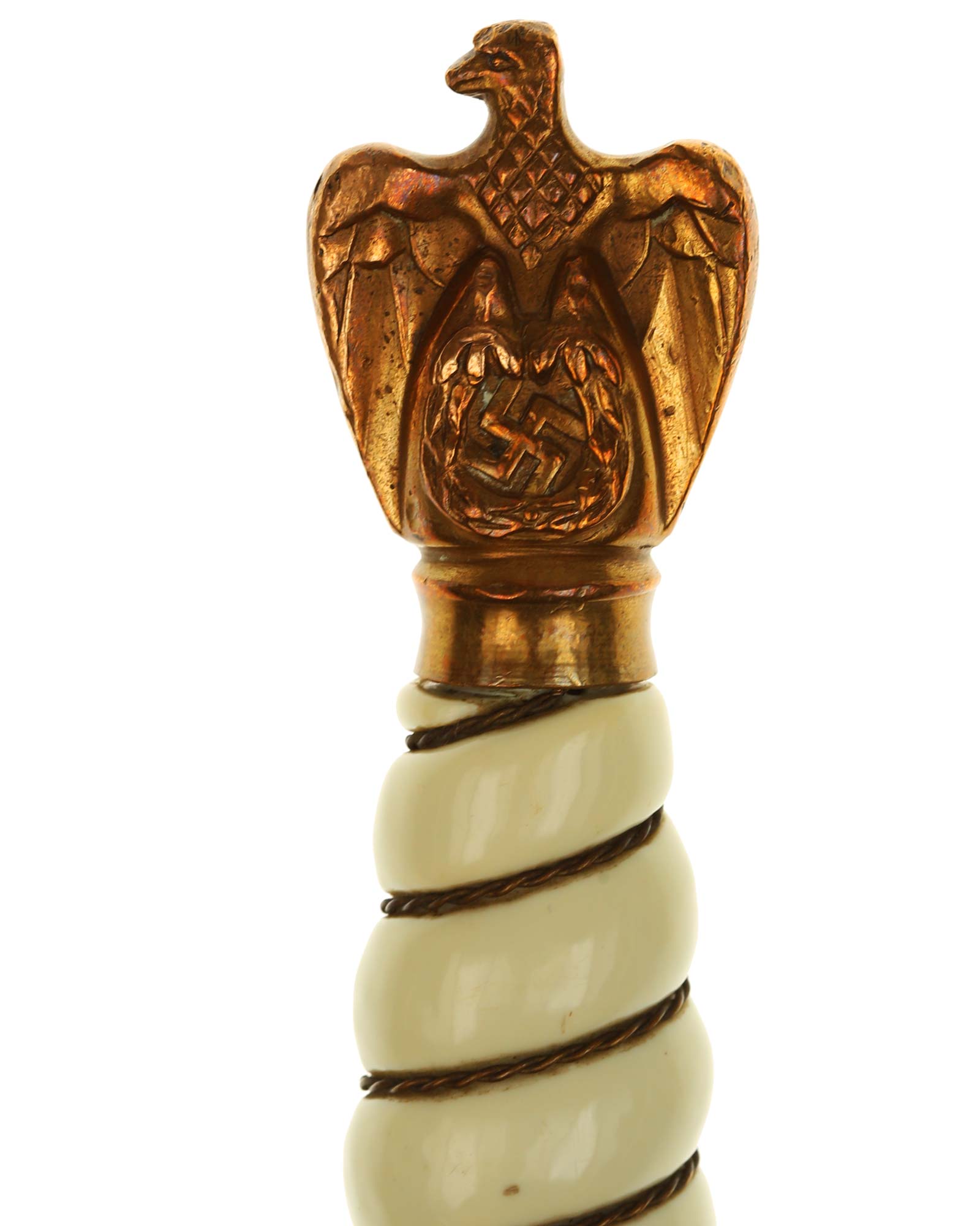 Griff: Heller Griff, verläuft leicht oval. Der Griff ist mit einem Doppeldraht gewickelt. Die Parierstange und der Knauf sind aus Buntmetall gefertigt und vergoldet worden. Unterhalb der Parierstange befindet sich das Stoßleder. Der Knauf ist in Form eines Adlers, der mit seinen Krallen das Hakenkreuz in einem Kranz festhält.