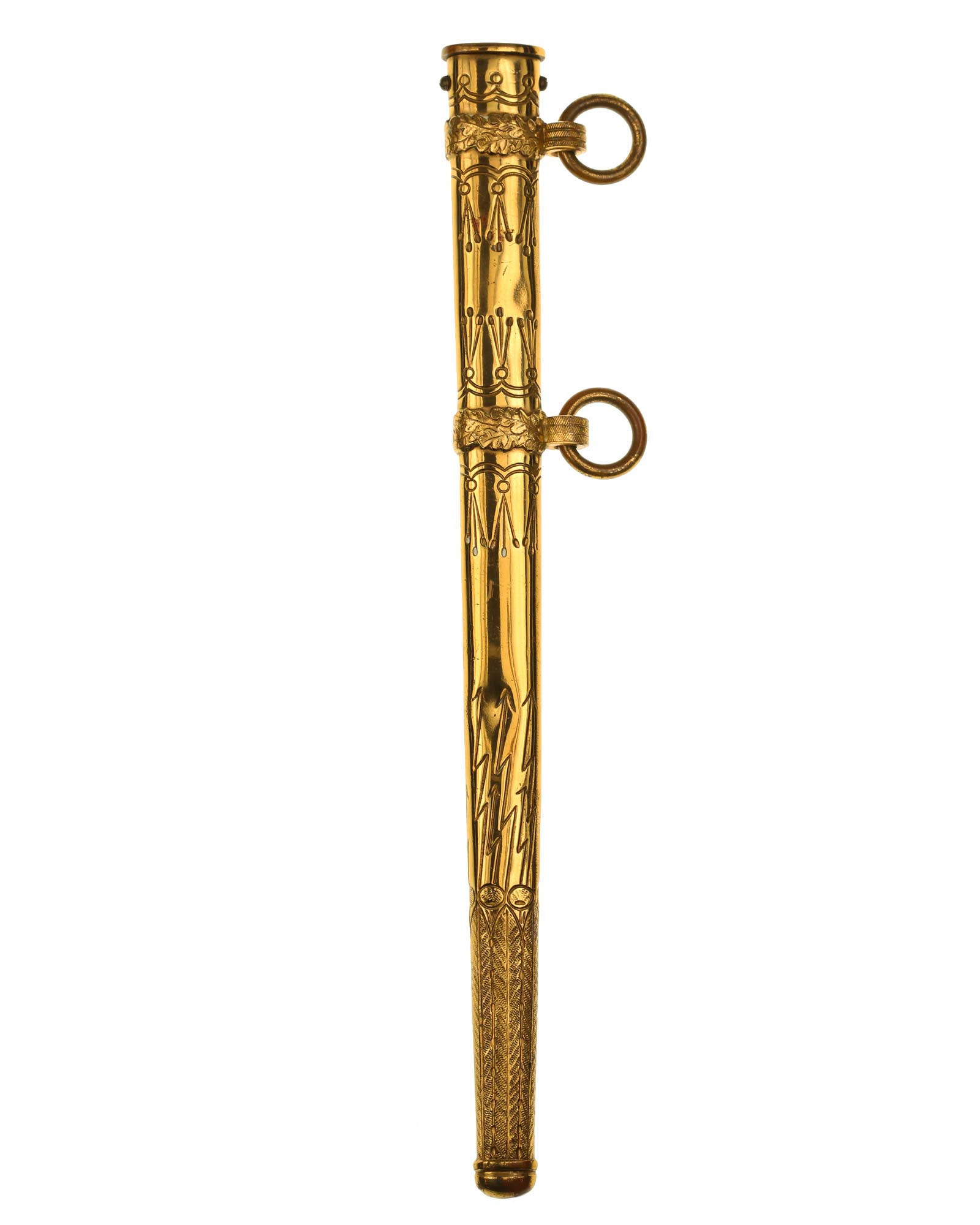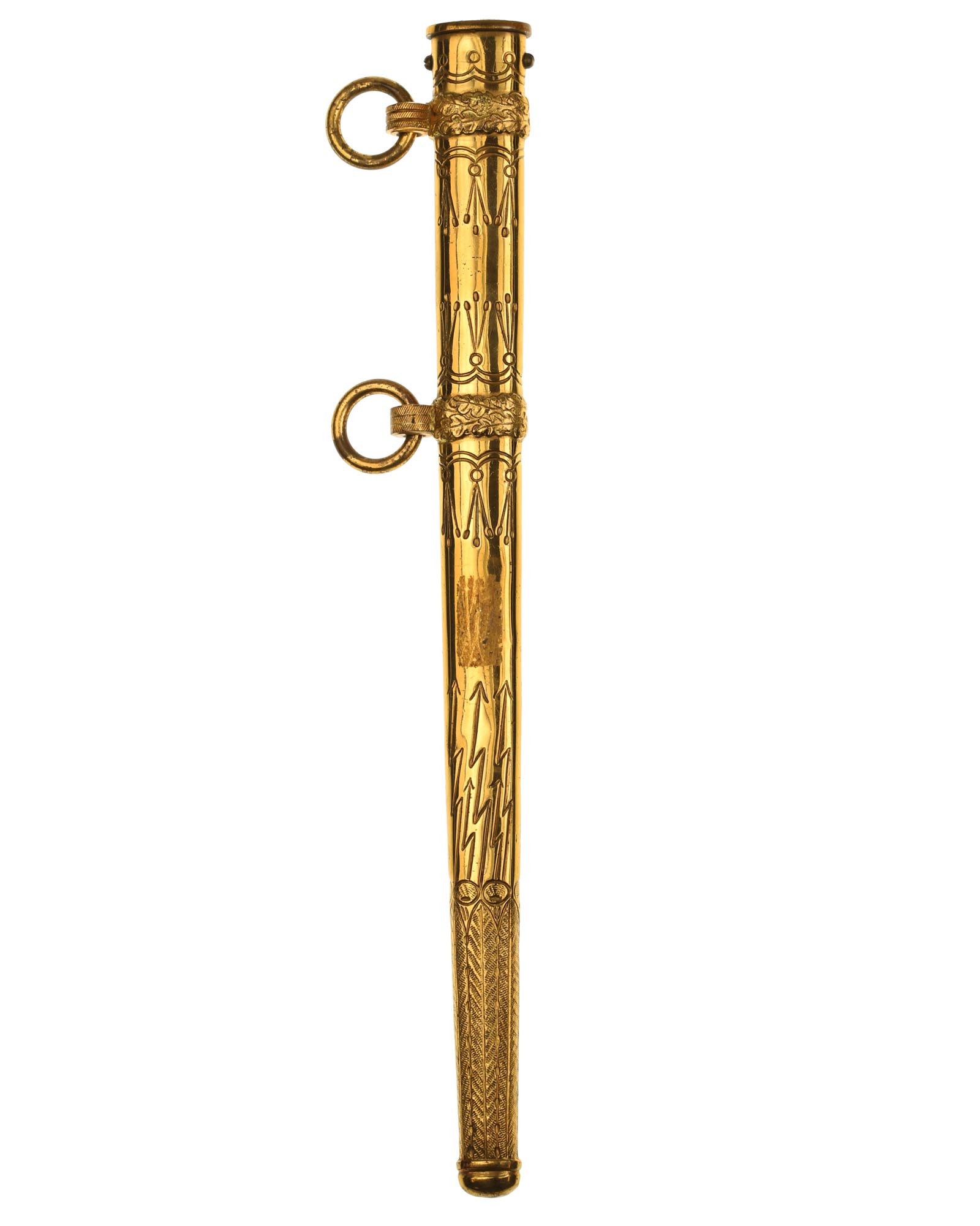 Scheide: Blitzscheide. Die Ringbänder sind mit Eichenlaubdekor. Das Mundblech wird von zwei seitlich, befestigten Schrauben festgehalten. Die beiden Trageringe sind geschlossen.