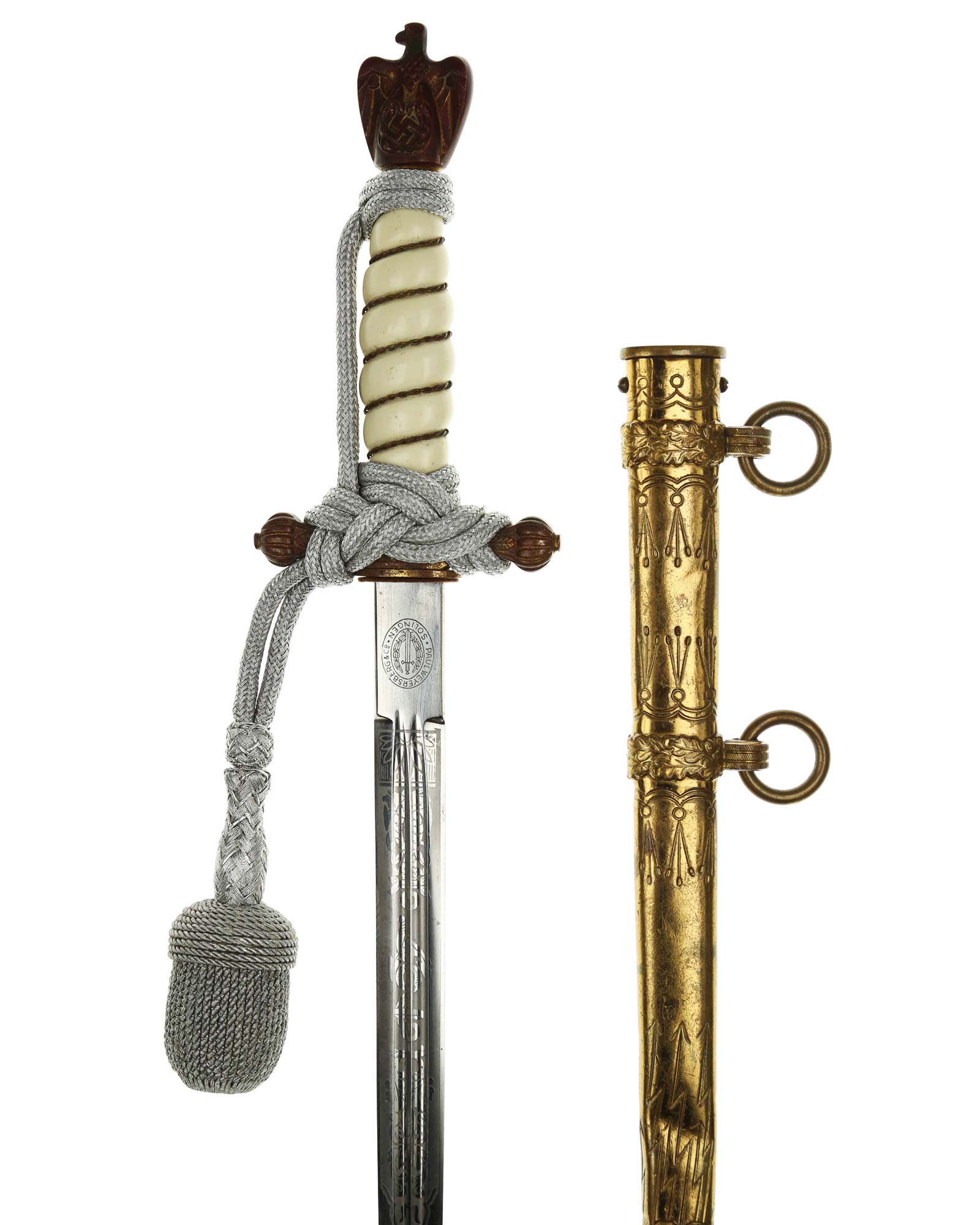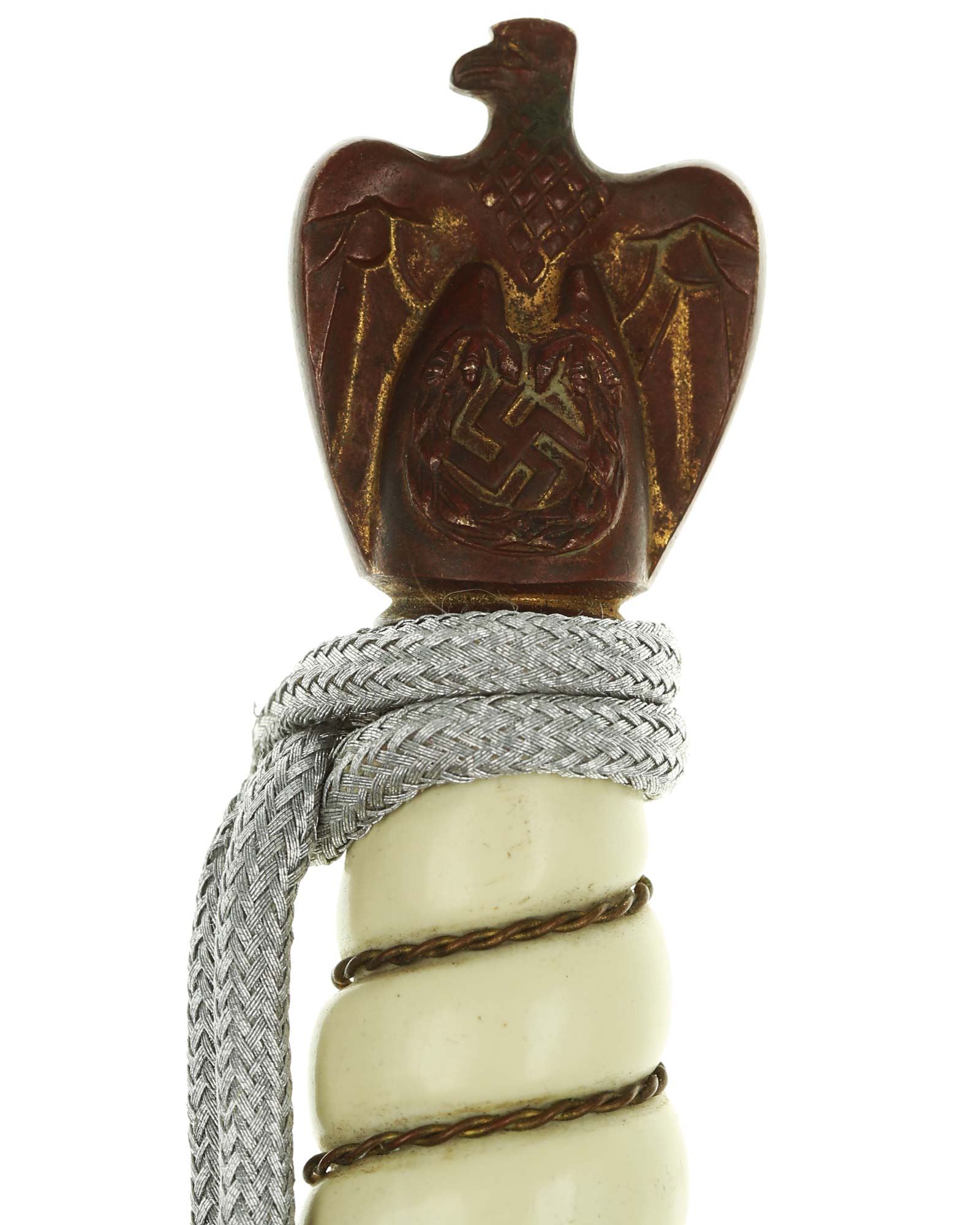 Griff: Heller Griff, verläuft leicht oval. Der Griff ist mit einem Doppeldraht gewickelt. Die Parierstange und der Knauf sind aus Buntmetall gefertigt und vergoldet worden. Unterhalb der Parierstange befindet sich das Stoßleder. Der Druckknopf funktioniert einwandfrei. Der Knauf ist in Form eines Adlers, der mit seinen Krallen das Hakenkreuz in einem Kranz festhält.