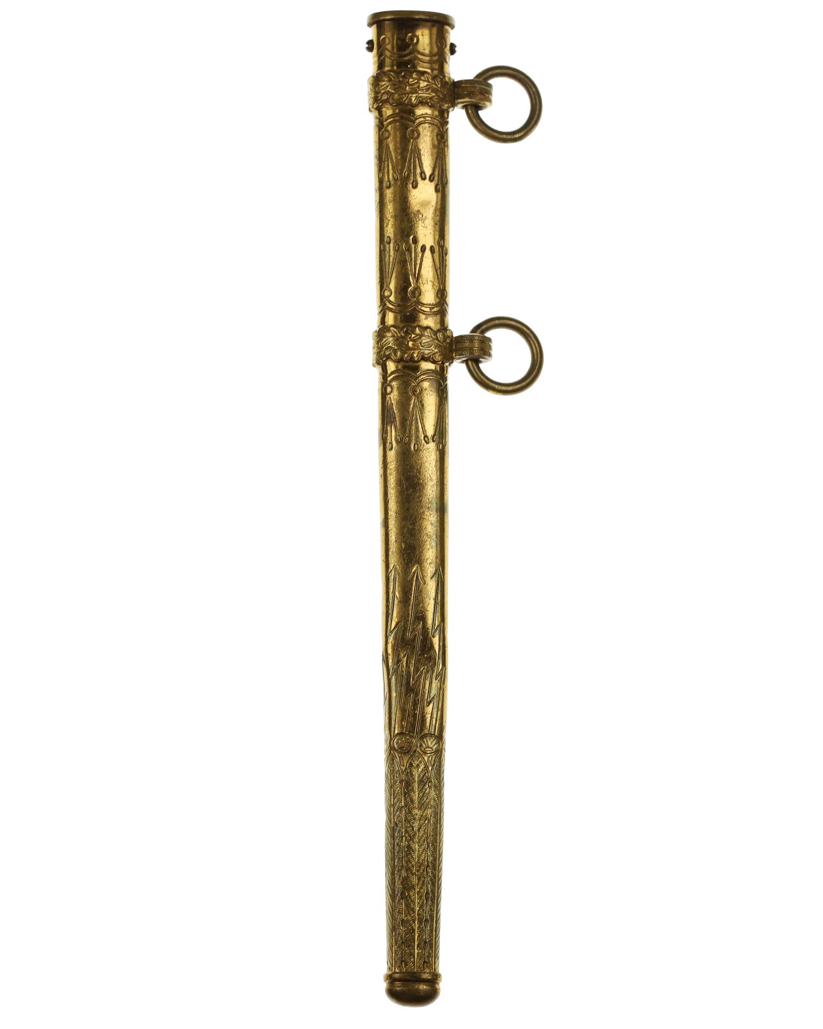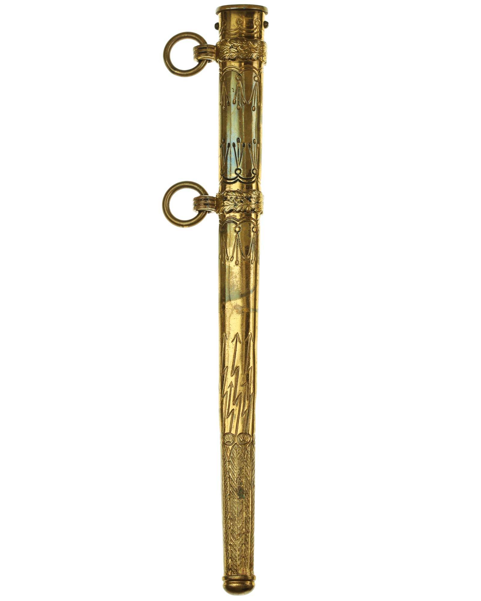 Scheide: Blitzscheide. Die Ringbänder sind mit Eichenlaubdekor. Das Mundblech wird anhand von zwei seitlich befestigten Schrauben festgehalten. Die beiden Trageringe sind geschlossen.