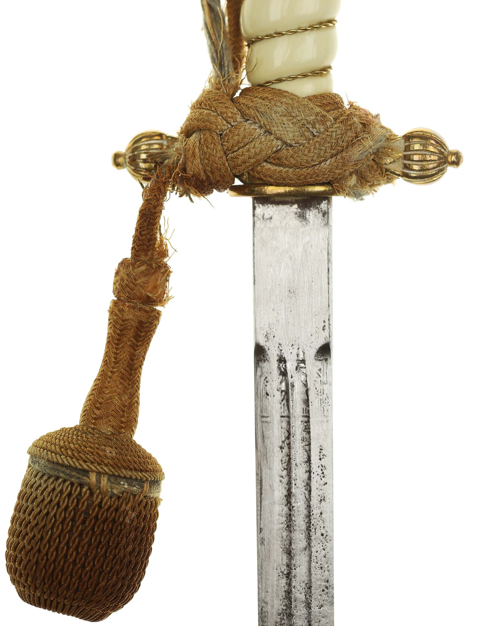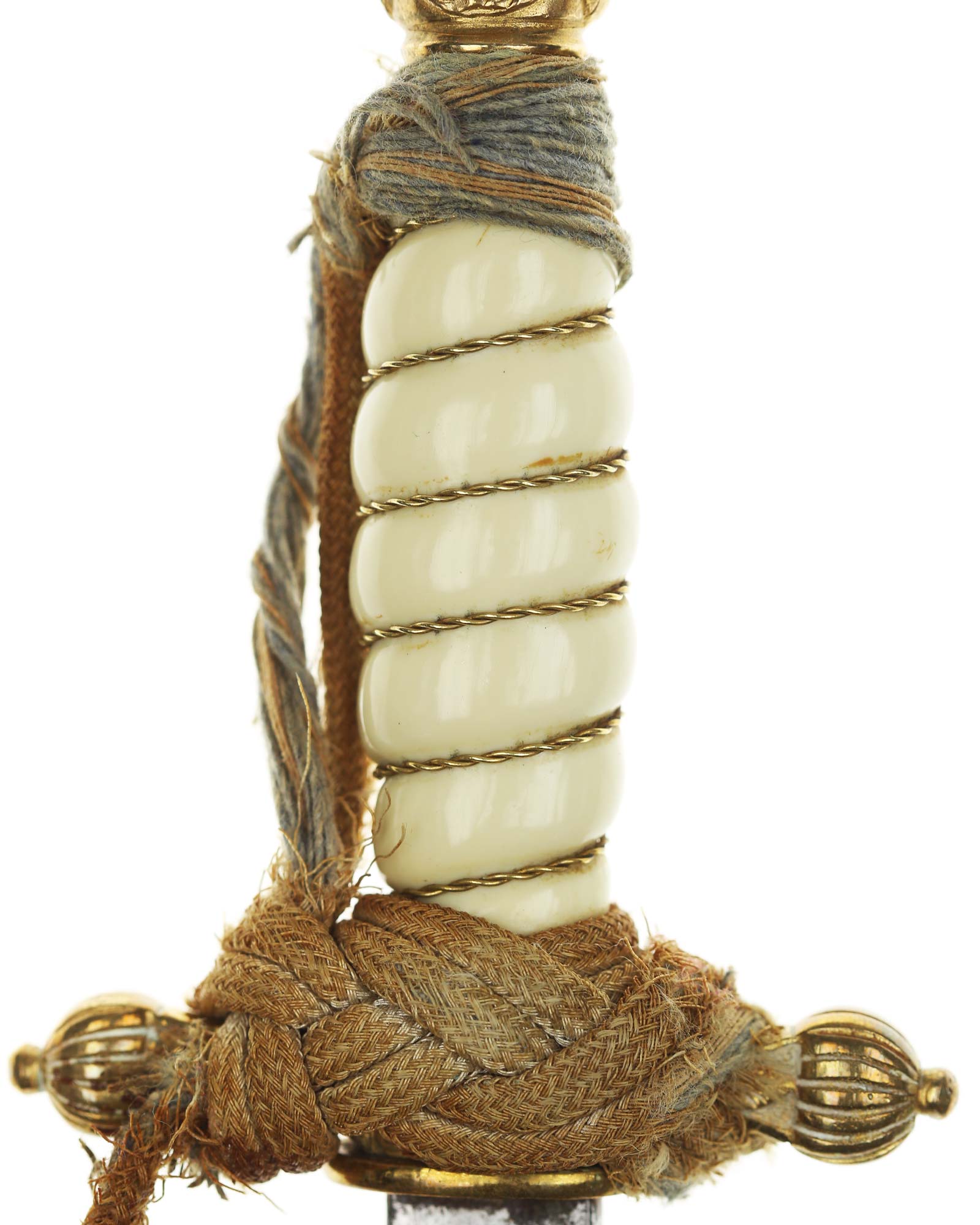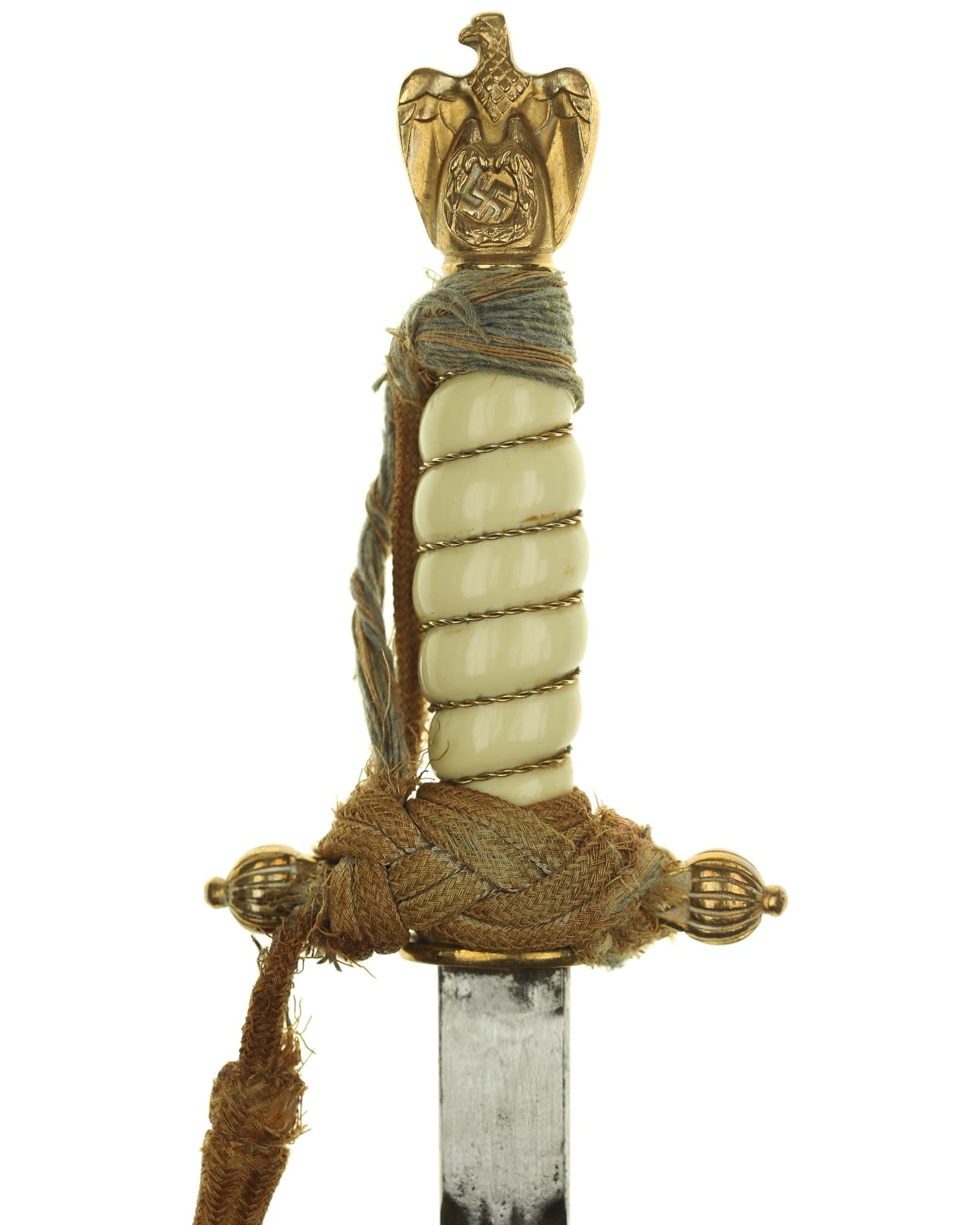 Griff: Heller Griff, verläuft leicht oval. Der Griff ist mit einem Doppeldraht gewickelt. Die Parierstange und der Knauf sind aus Buntmetall gefertigt und vergoldet worden. Der Knauf ist in Form eines Adlers, der mit seinen Krallen das Hakenkreuz in einem Kranz festhält.
