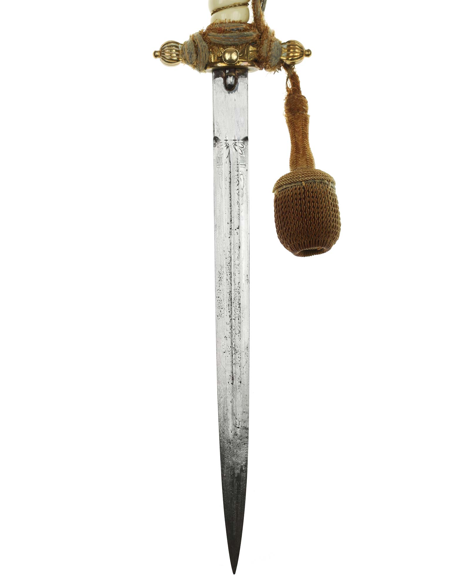 Klinge: Die Klinge wurde beidseitig geschliffen. Die Ätzung ist zum Teil noch sichtbar. Zweischneidige Klinge mit unbeschädigter Spitze.