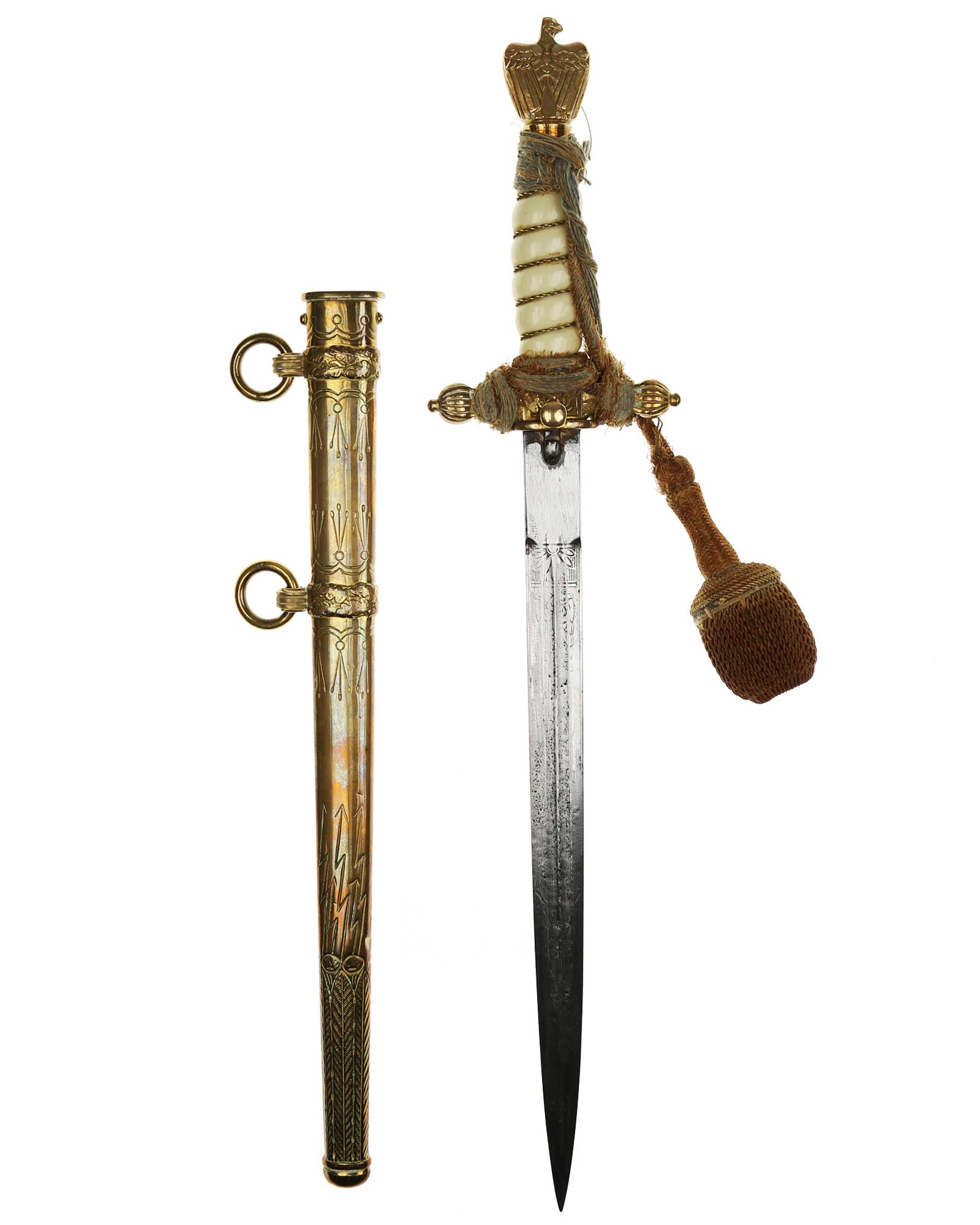 Kriegsmarine Offiziersdolch (Modell 1938) ohne Herstellermarkierung. Gesamtlänge beträgt 41,7 cm. Kriegsmarine Dolch mit dazugehörigem Portepee.