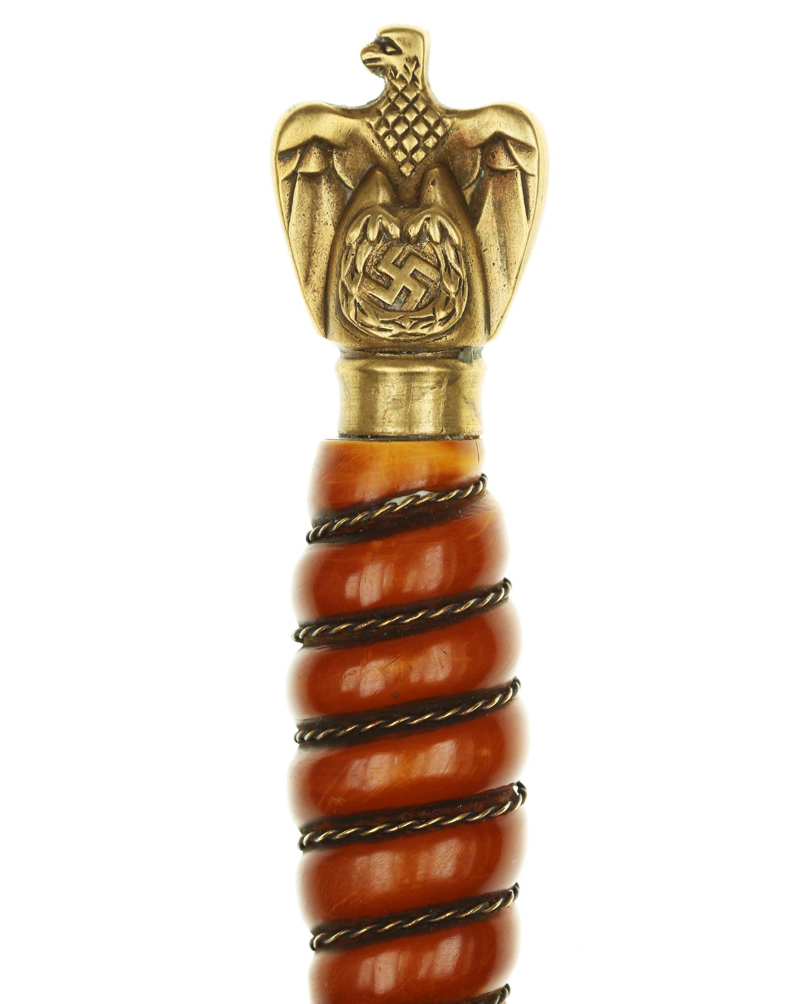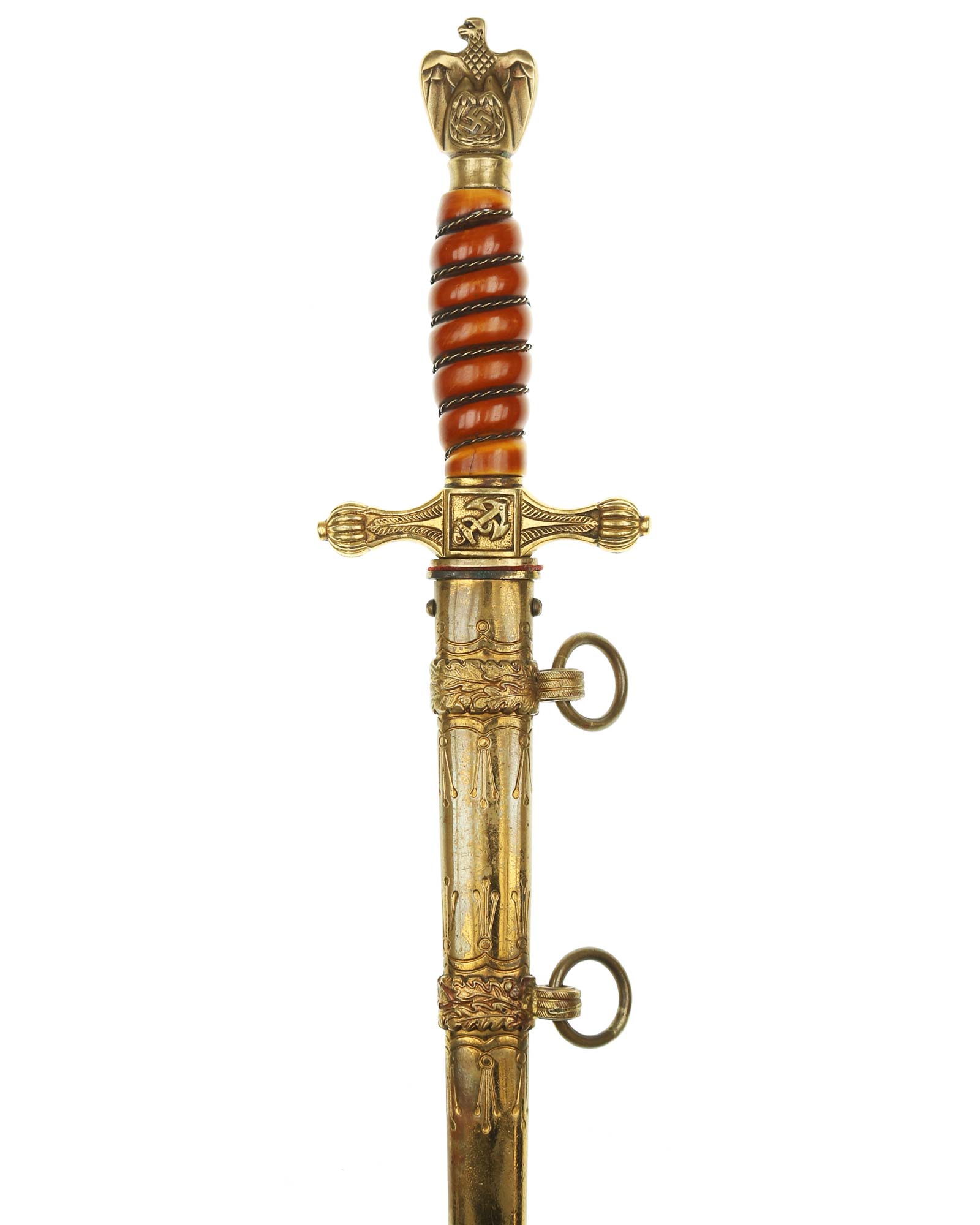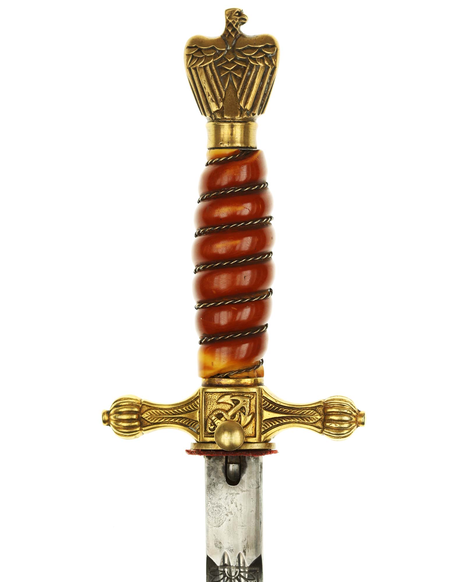 Griff: Dunkler Griff, verläuft leicht oval. Der Griff ist mit einem Doppeldraht neu gewickelt worden. Die Parierstange und der Knauf sind aus Buntmetall gefertigt. Unterhalb der Parierstange befindet sich das Stoßleder. Der Druckknopf funktioniert. Der Knauf ist in Form eines Adlers, der mit seinen Krallen das Hakenkreuz in einem Kranz festhält.