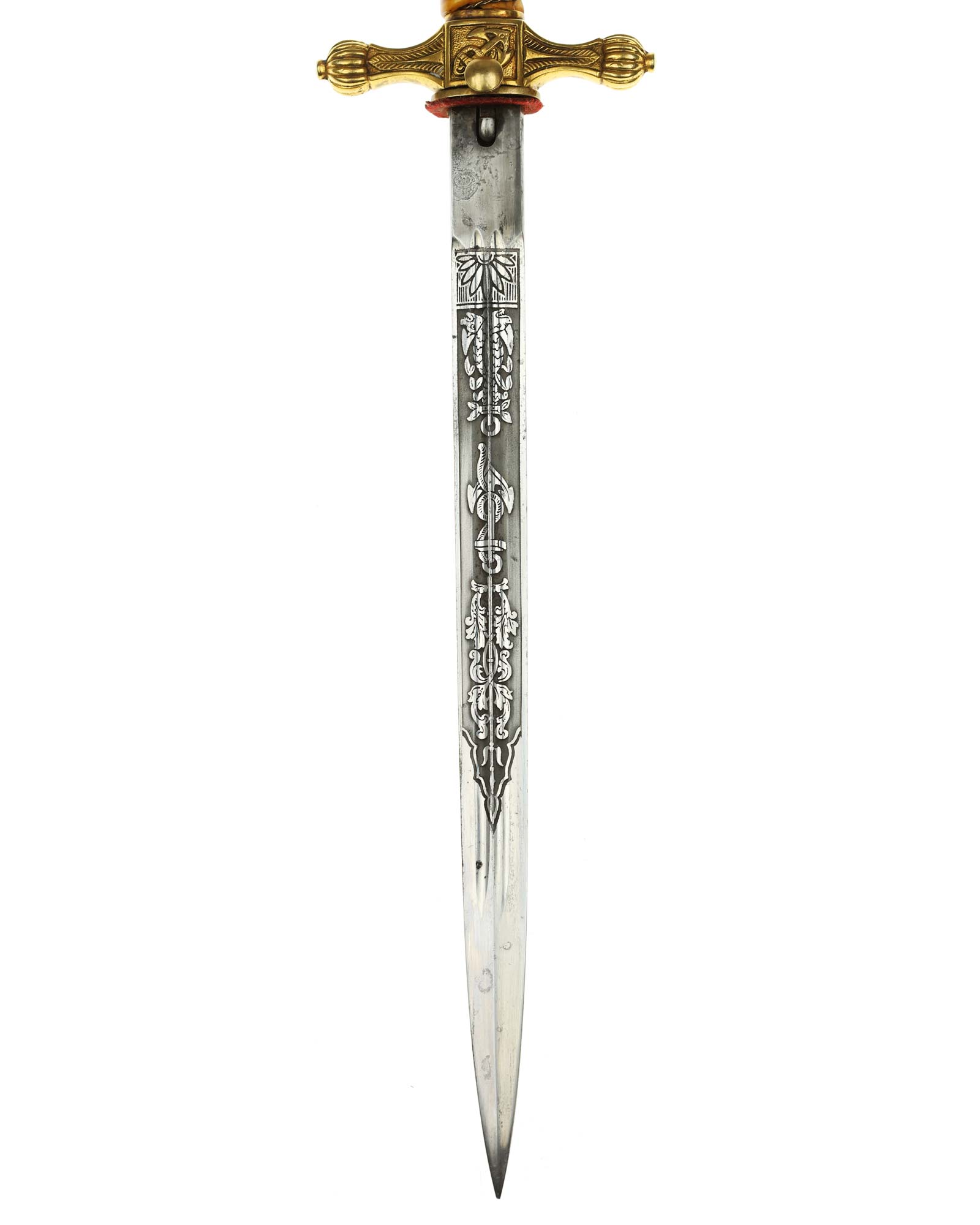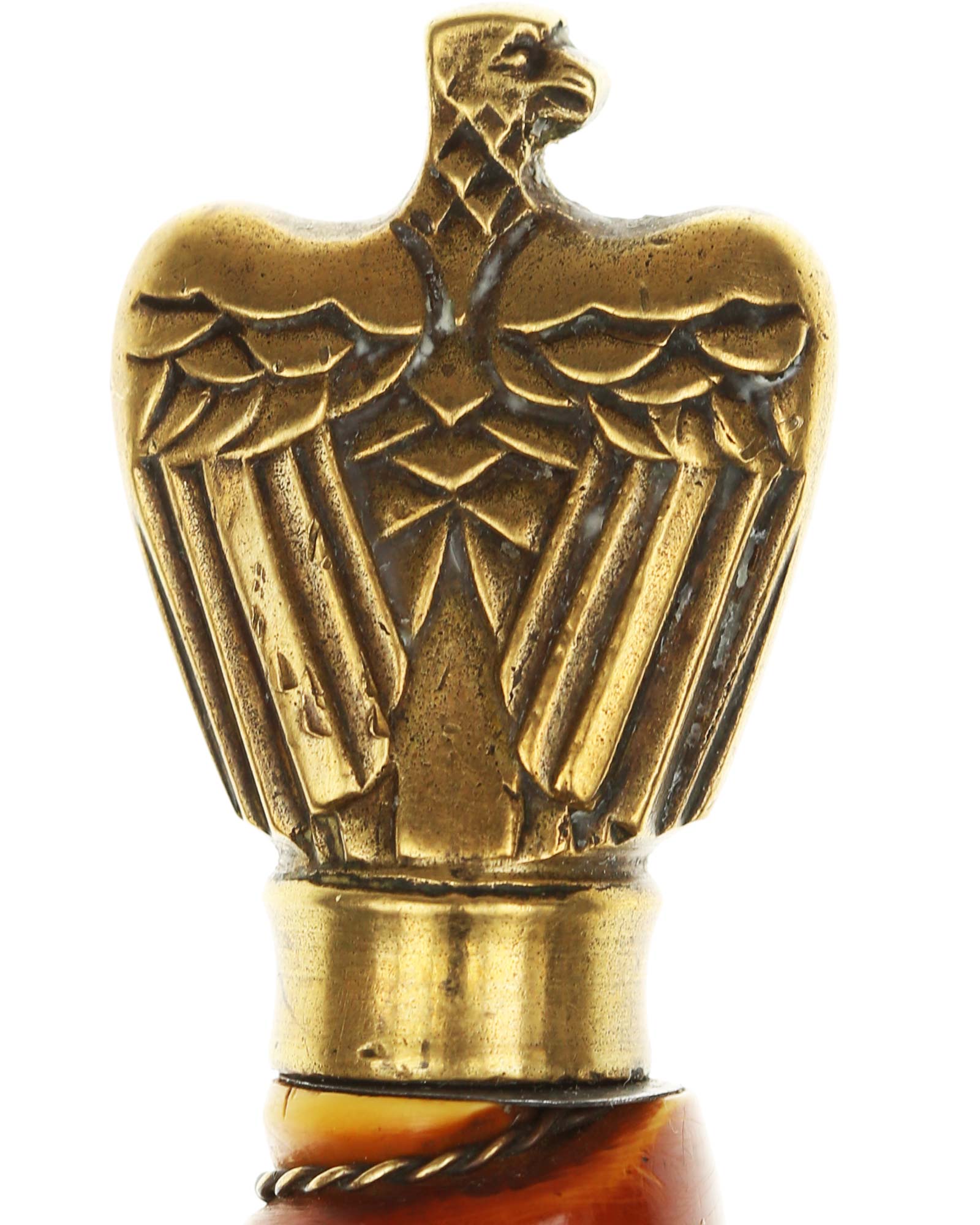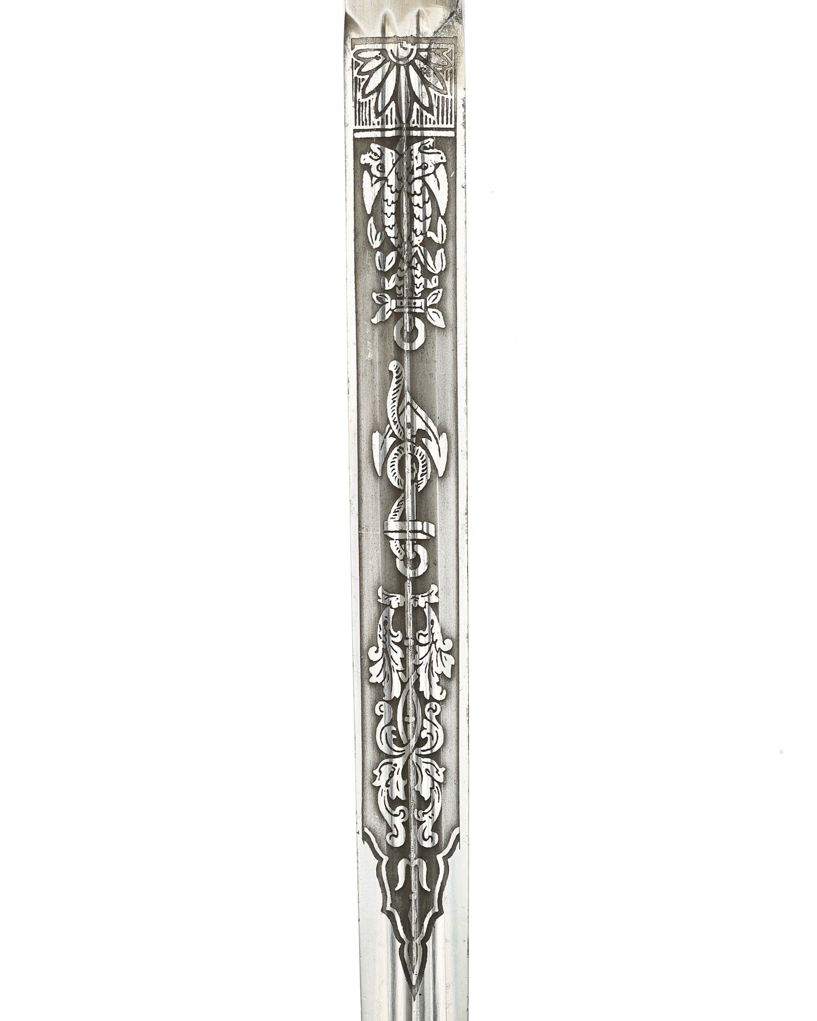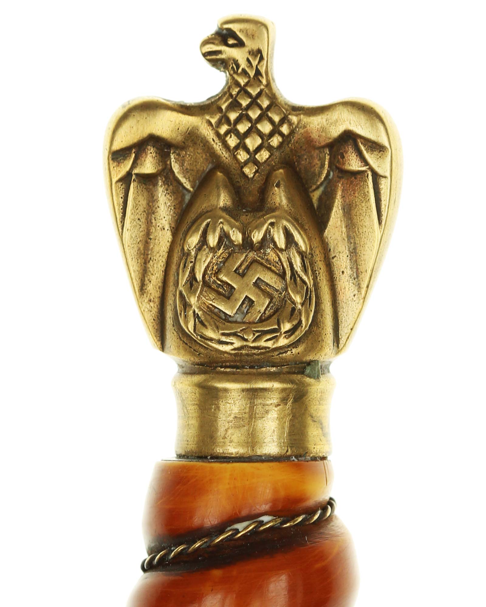 Griff: Dunkler Griff, verläuft leicht oval. Der Griff ist mit einem Doppeldraht neu gewickelt worden. Die Parierstange und der Knauf sind aus Buntmetall gefertigt. Unterhalb der Parierstange befindet sich das Stoßleder. Der Druckknopf funktioniert. Der Knauf ist in Form eines Adlers, der mit seinen Krallen das Hakenkreuz in einem Kranz festhält.