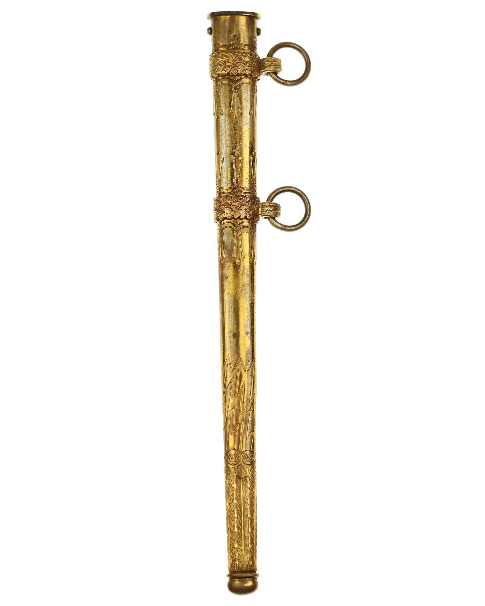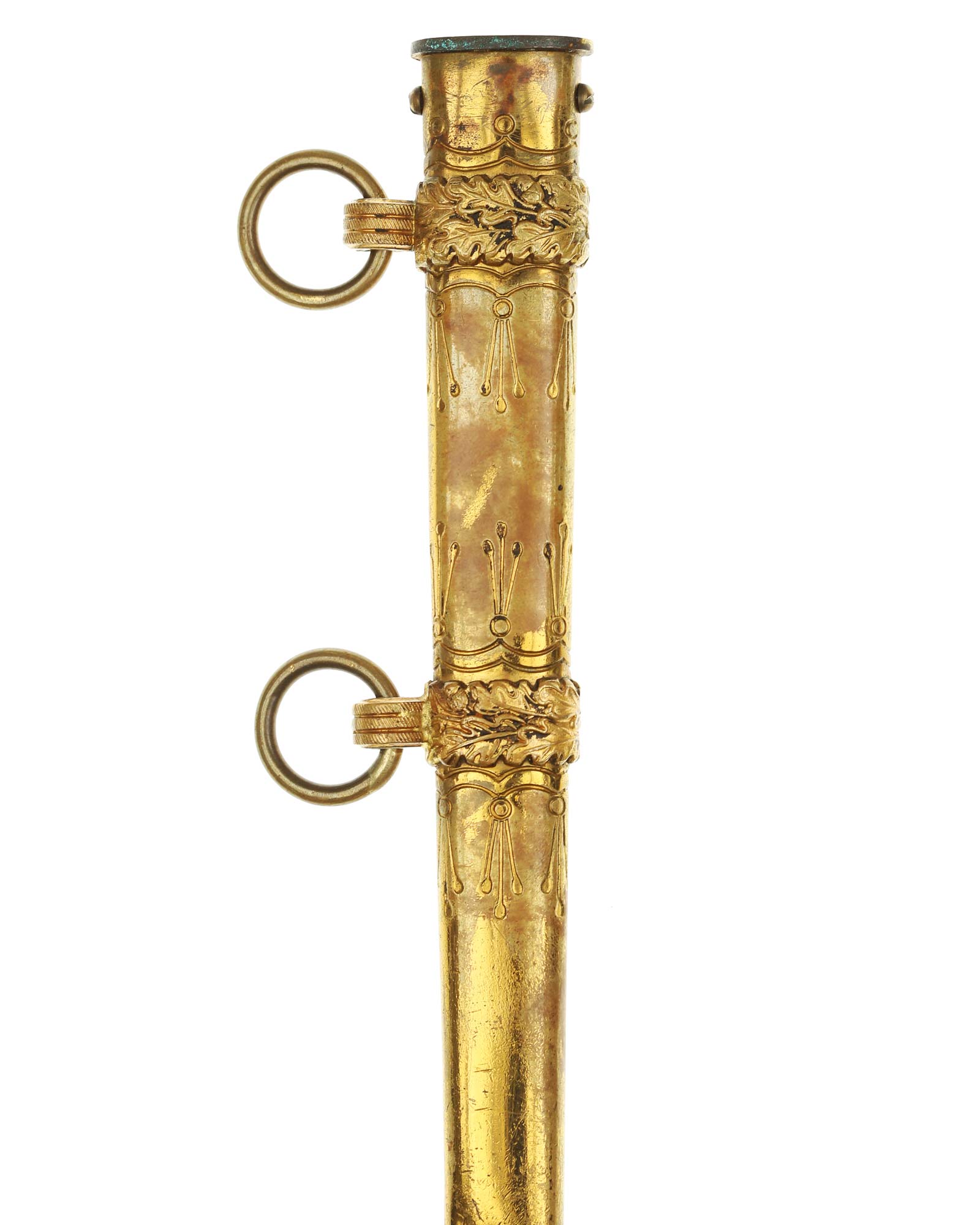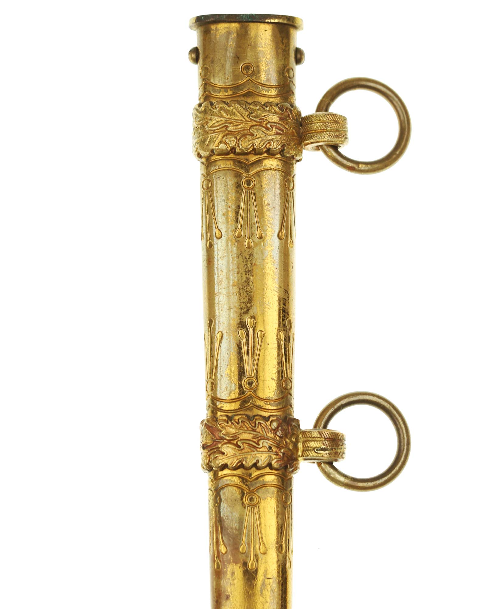 Scheide: Blitzscheide. Die Ringbänder sind mit Eichenlaubdekor. Das Mundblech wird anhand von zwei seitlich befestigten Schrauben festgehalten. Die beiden Trageringe sind geschlossen.