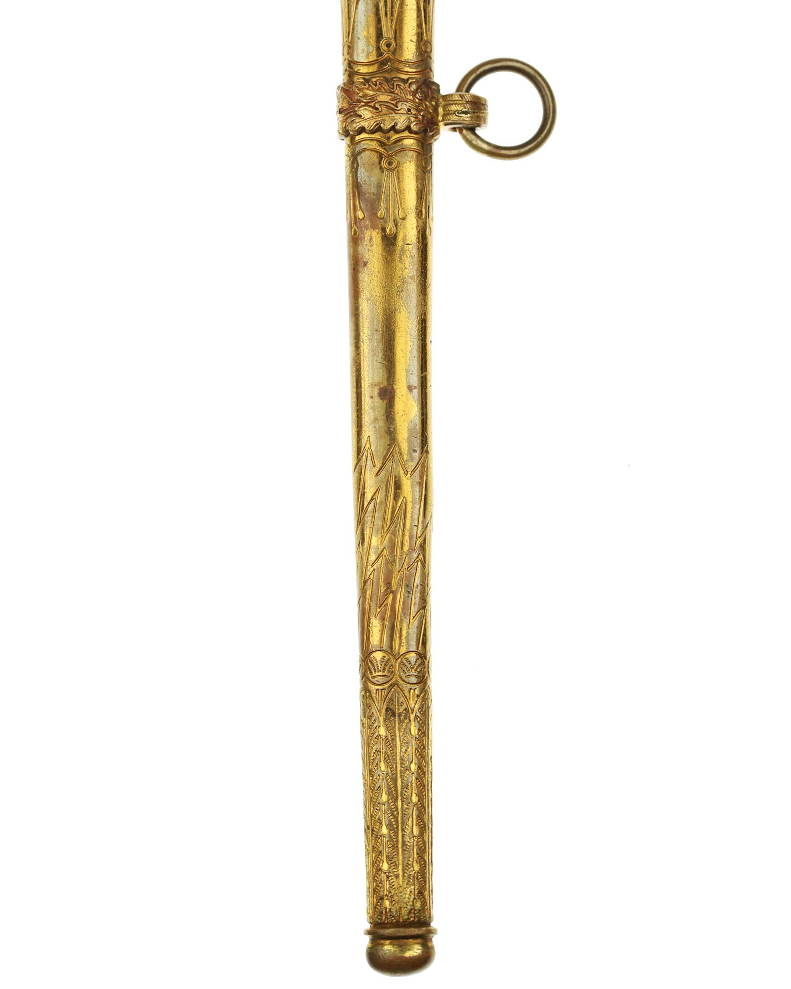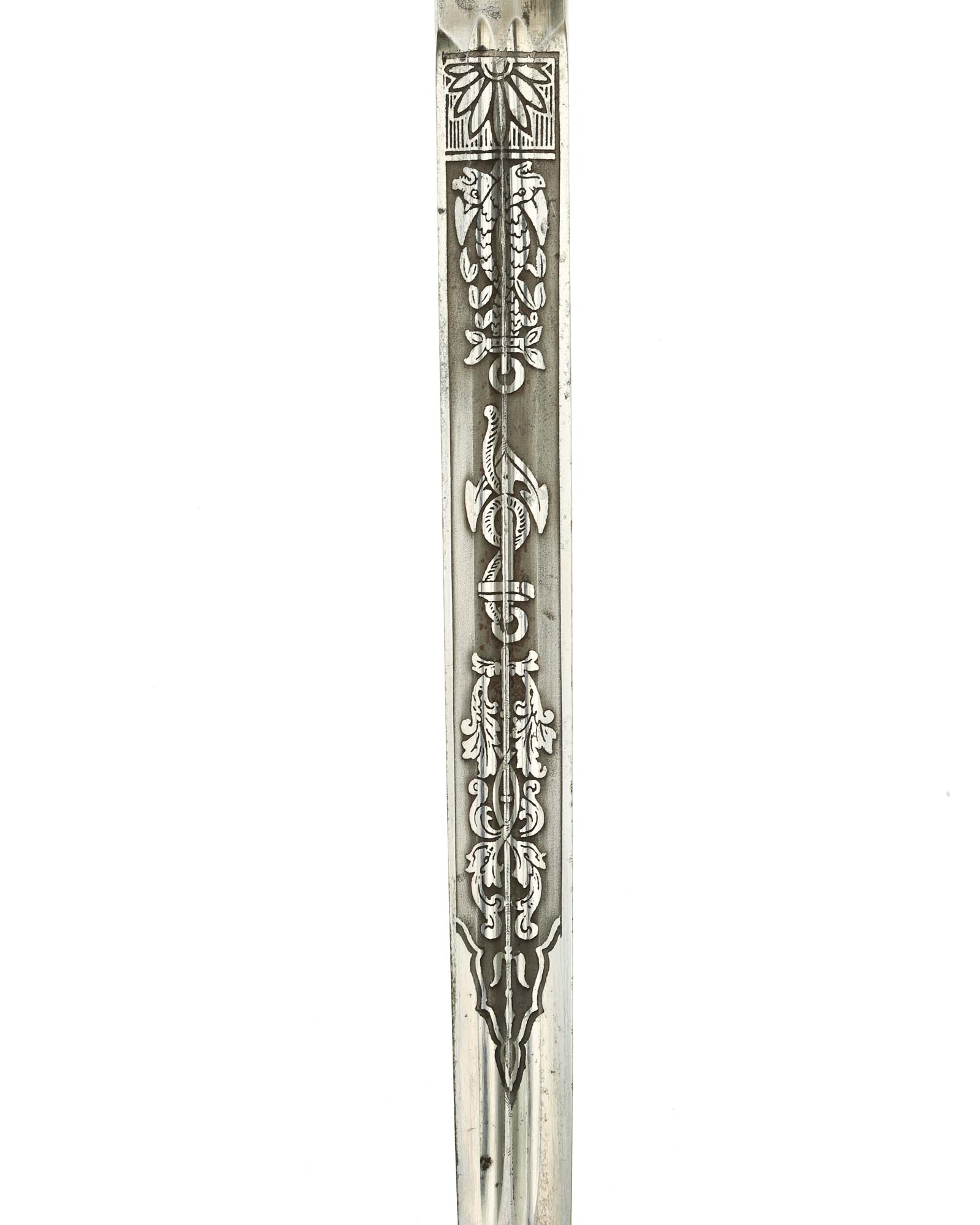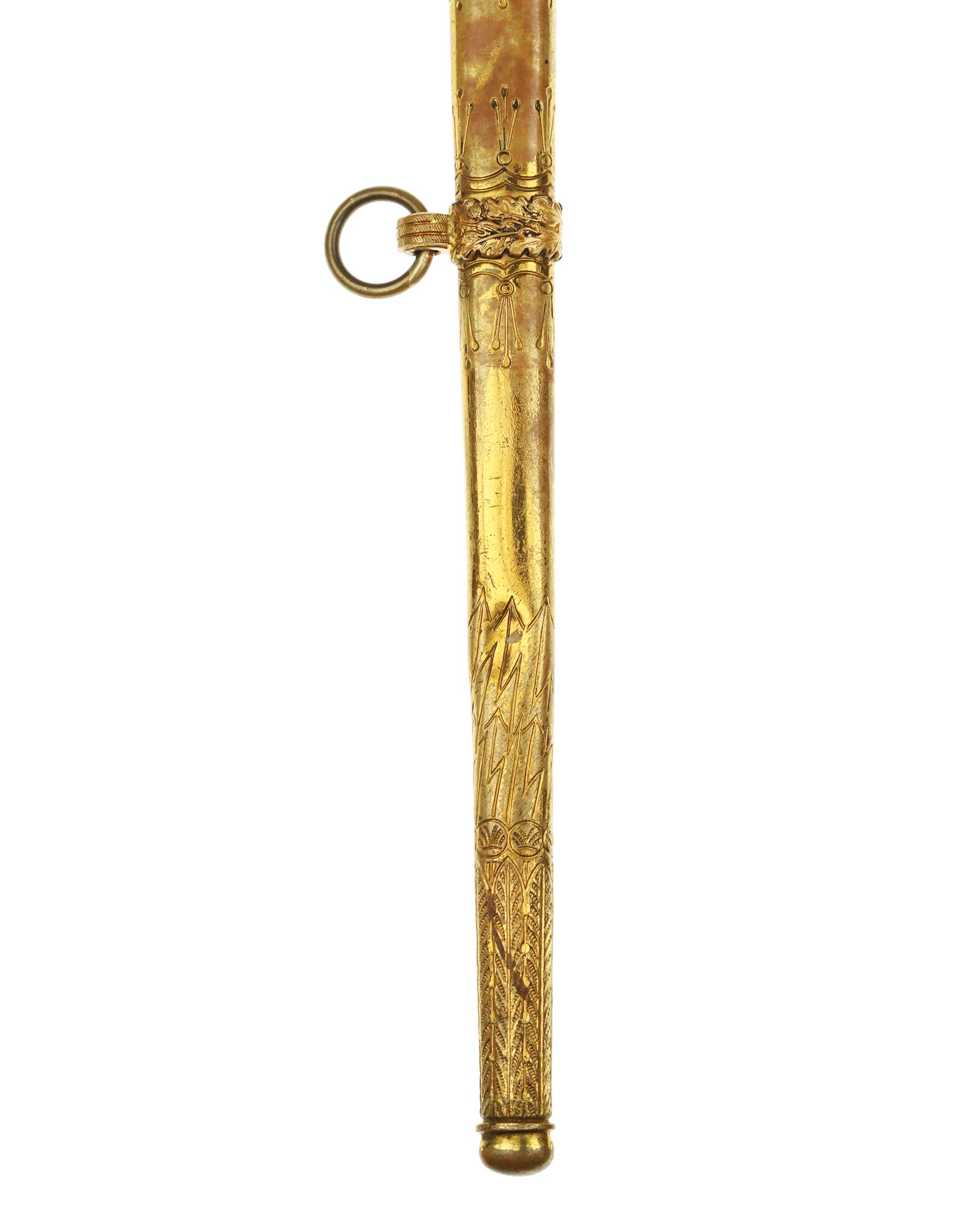 Scheide: Blitzscheide. Die Ringbänder sind mit Eichenlaubdekor. Das Mundblech wird anhand von zwei seitlich befestigten Schrauben festgehalten. Die beiden Trageringe sind geschlossen.