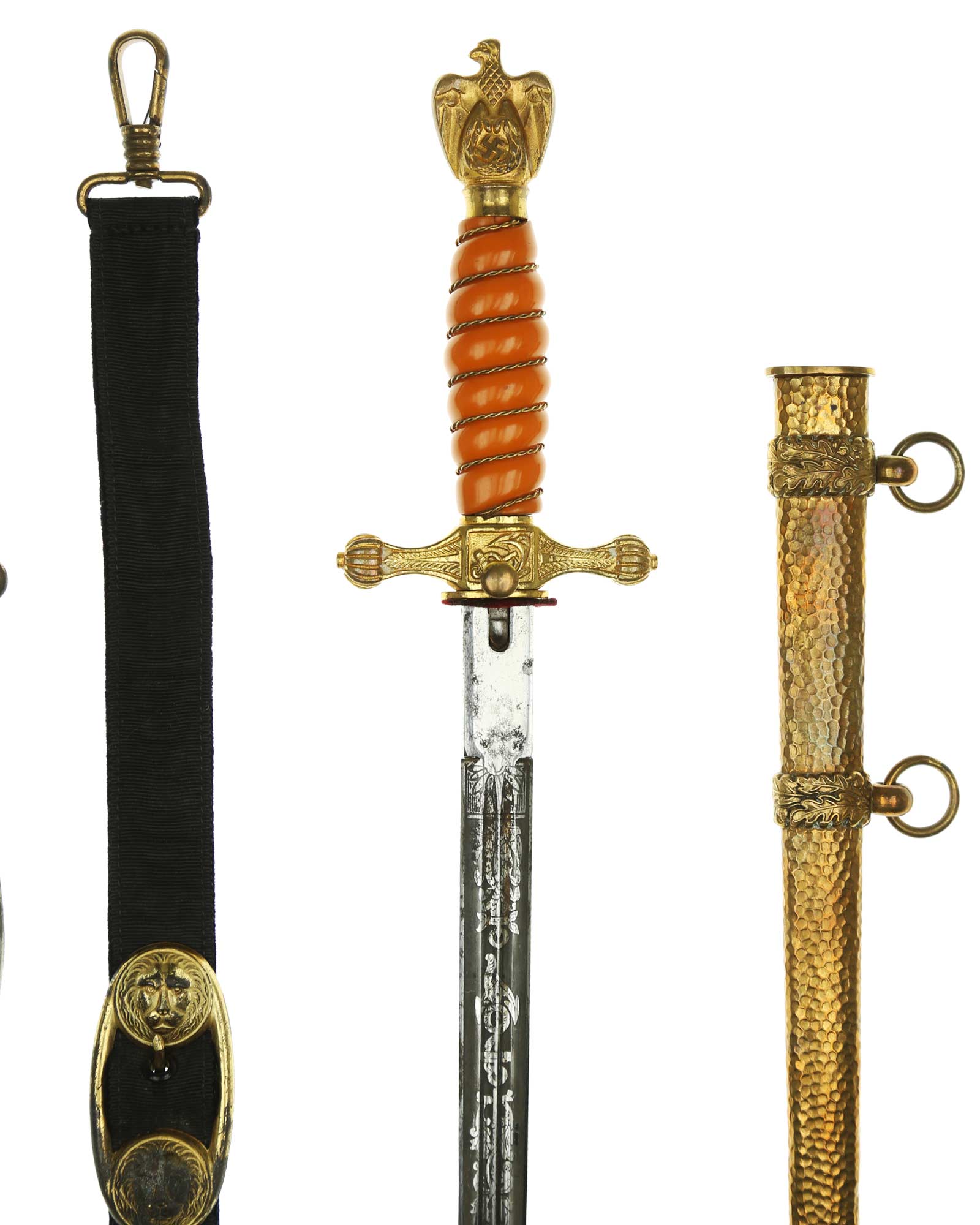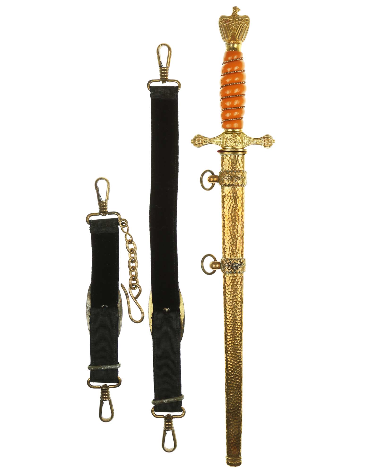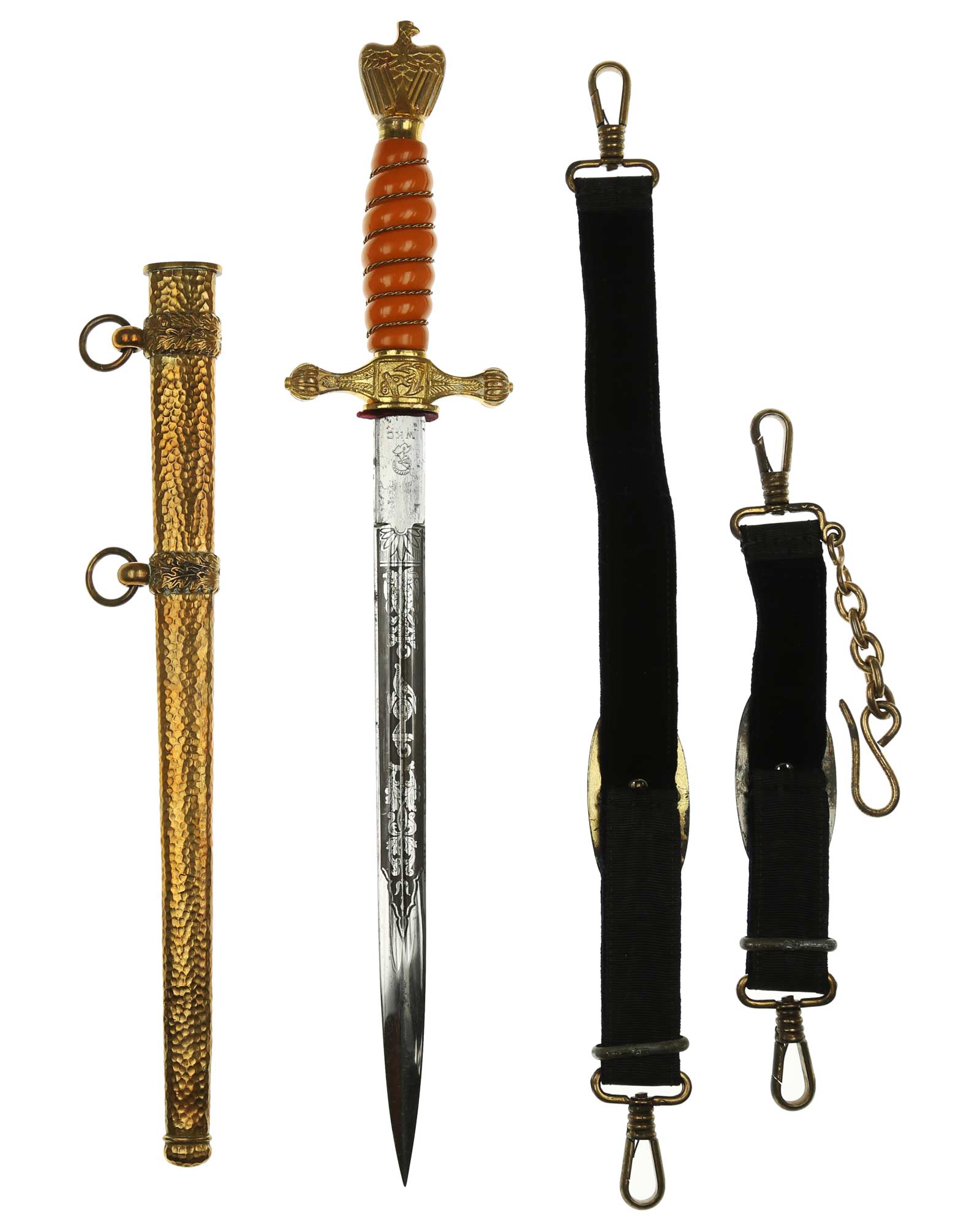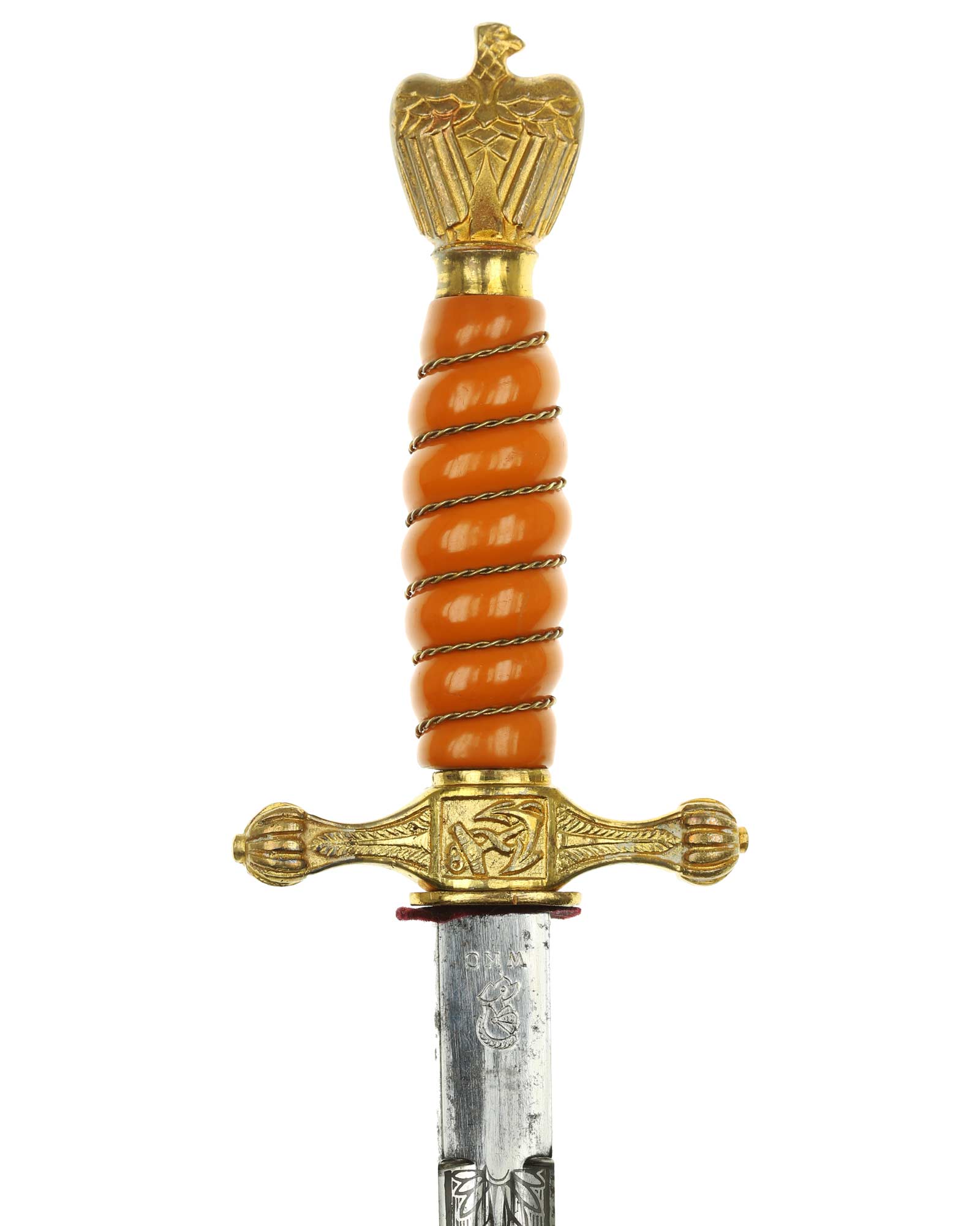 Kriegsmarine Offiziersdolch Modell 1938 mit dem Hersteller WKC Solingen und zweiteiligem Gehänge. Gesamtlänge beträgt 41,9 cm.