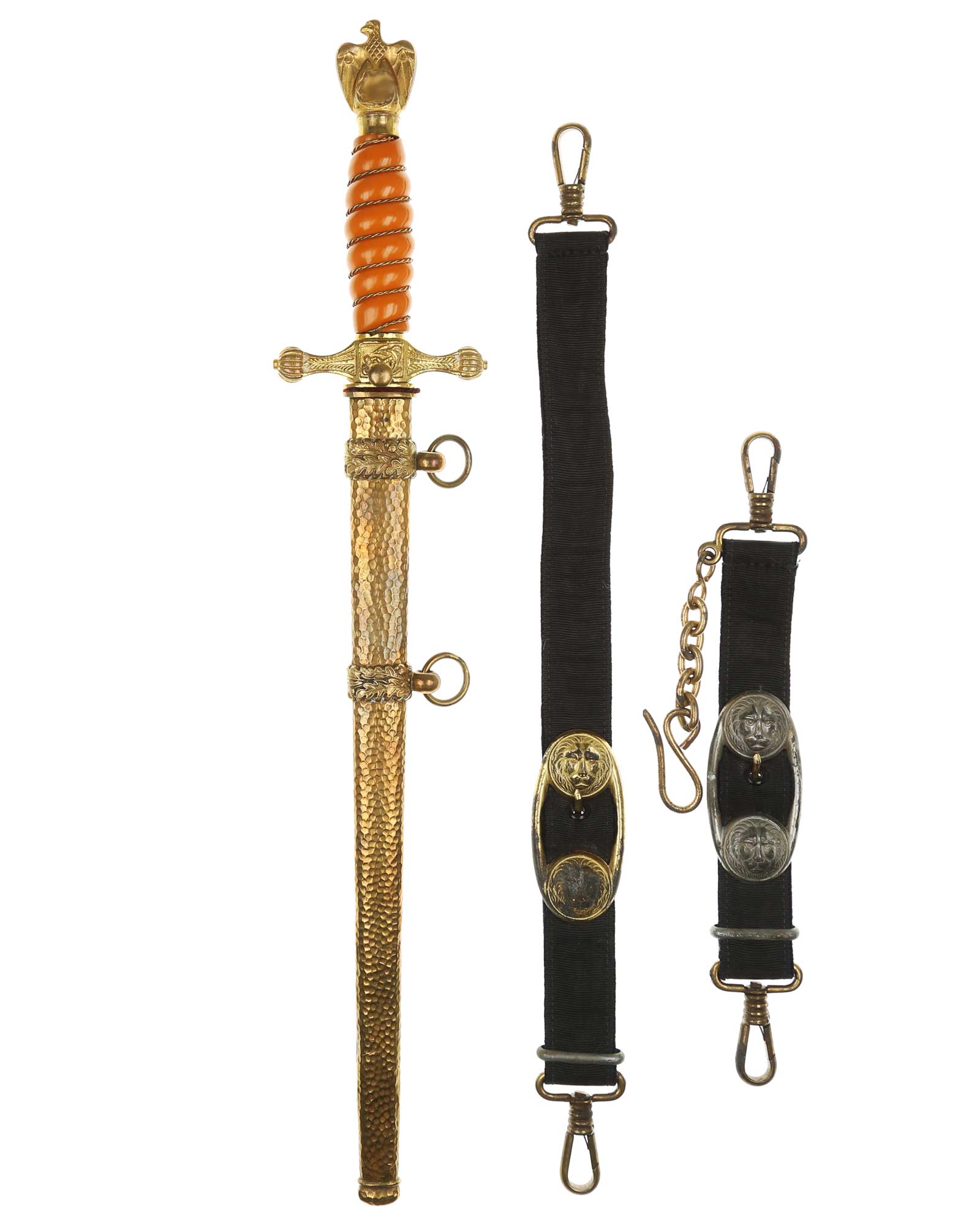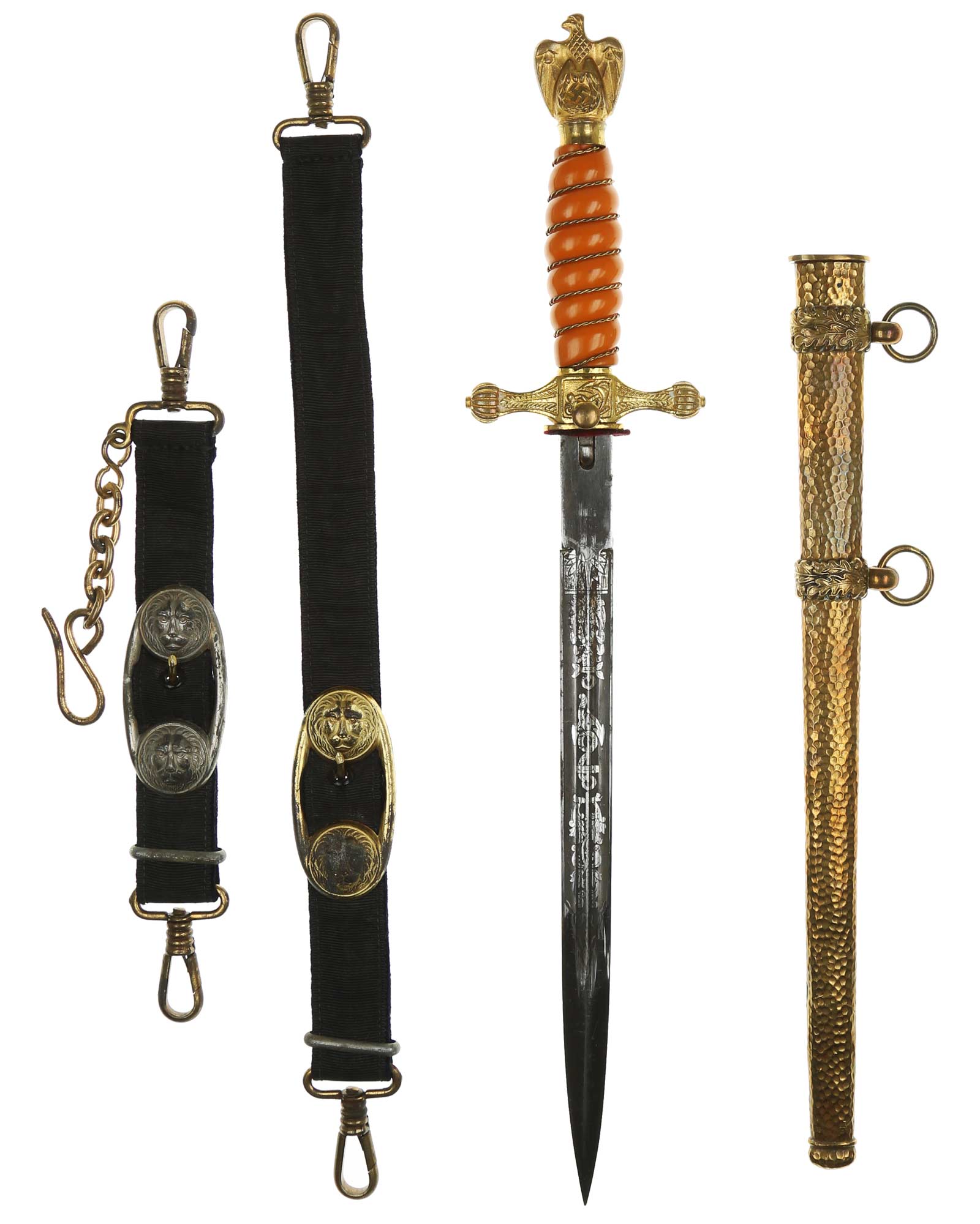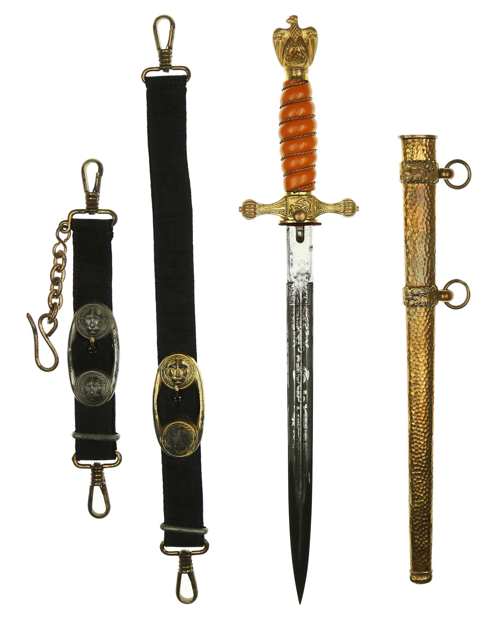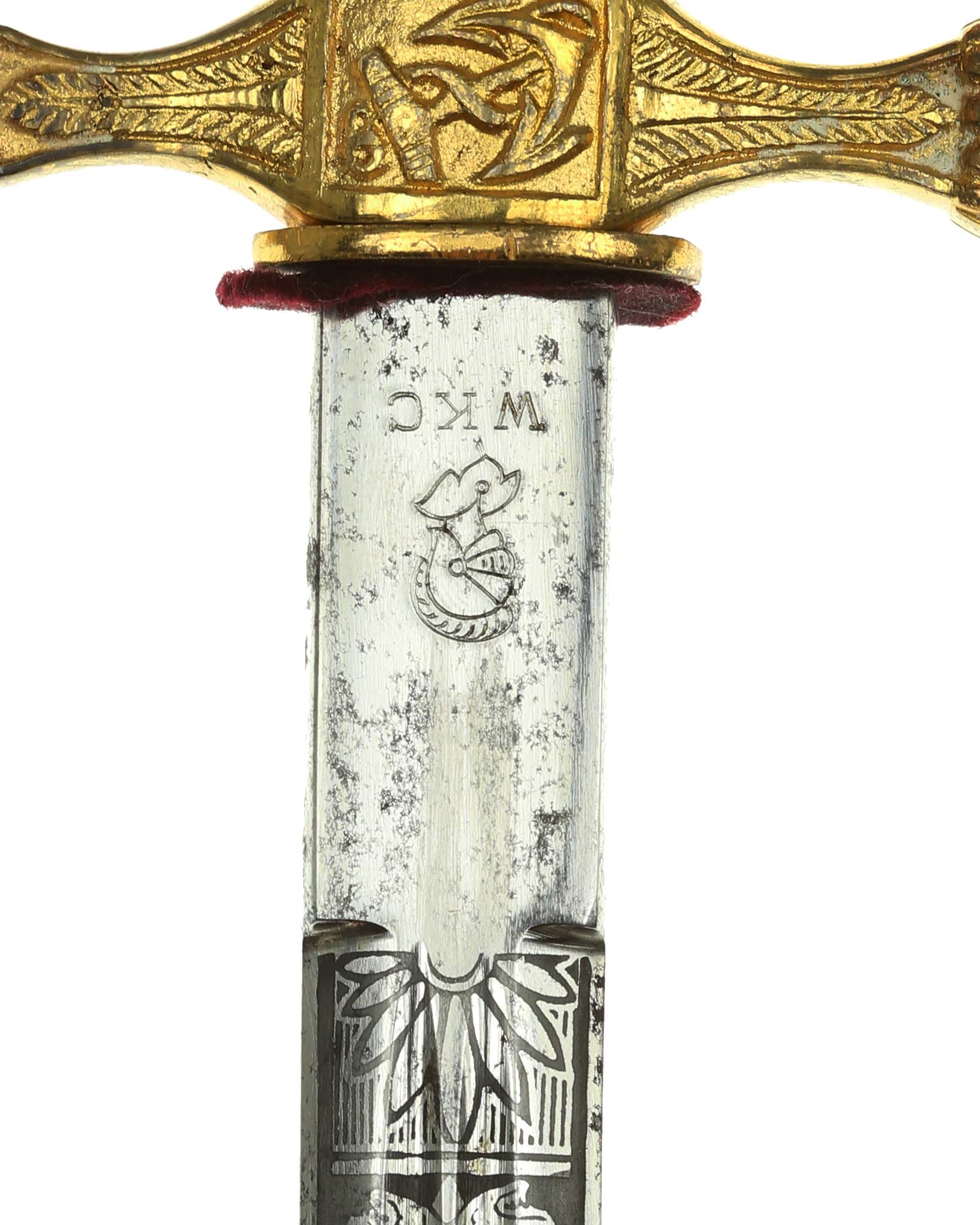 Kriegsmarine Offiziersdolch Modell 1938 mit dem Hersteller WKC Solingen und zweiteiligem Gehänge. Gesamtlänge beträgt 41,9 cm.