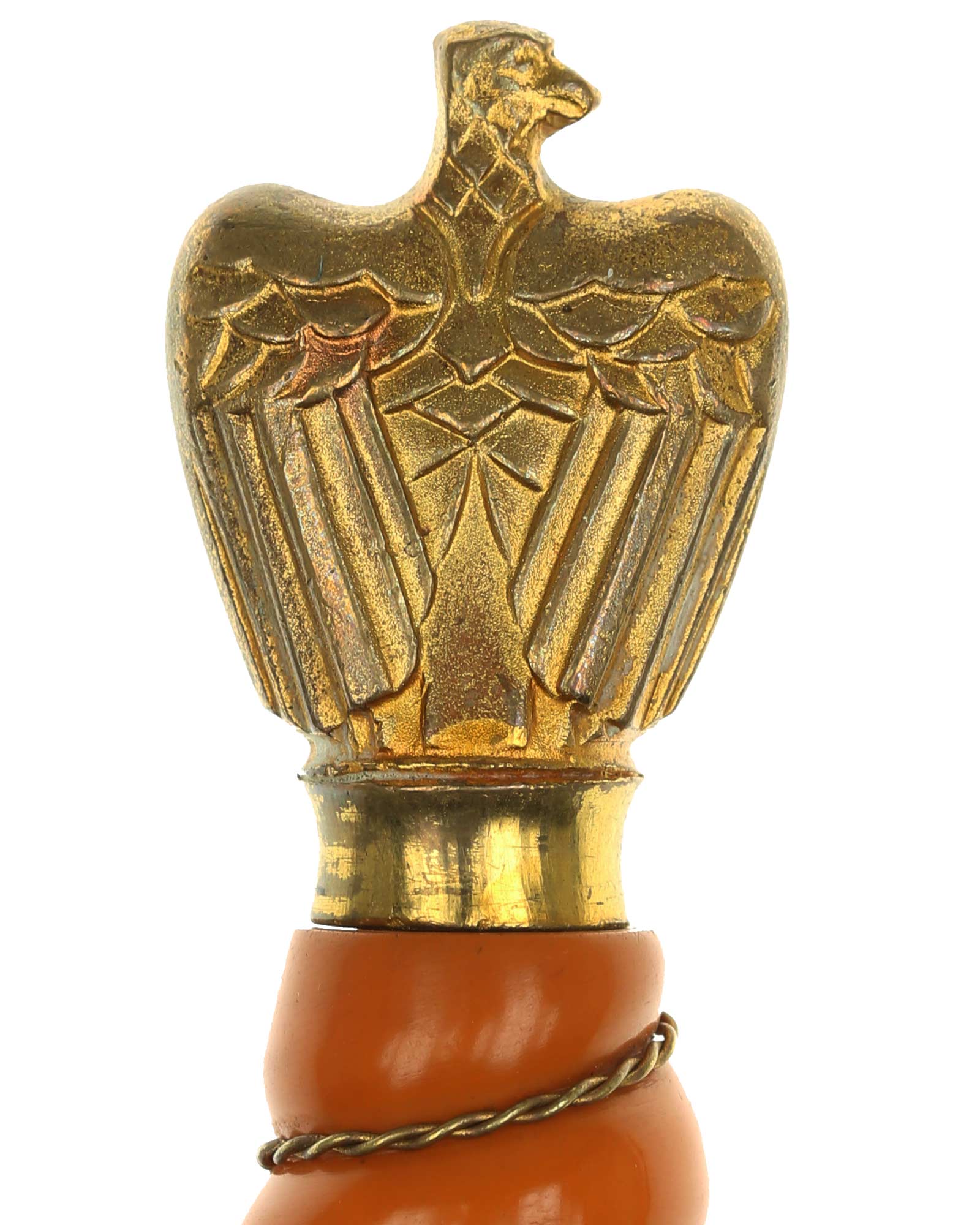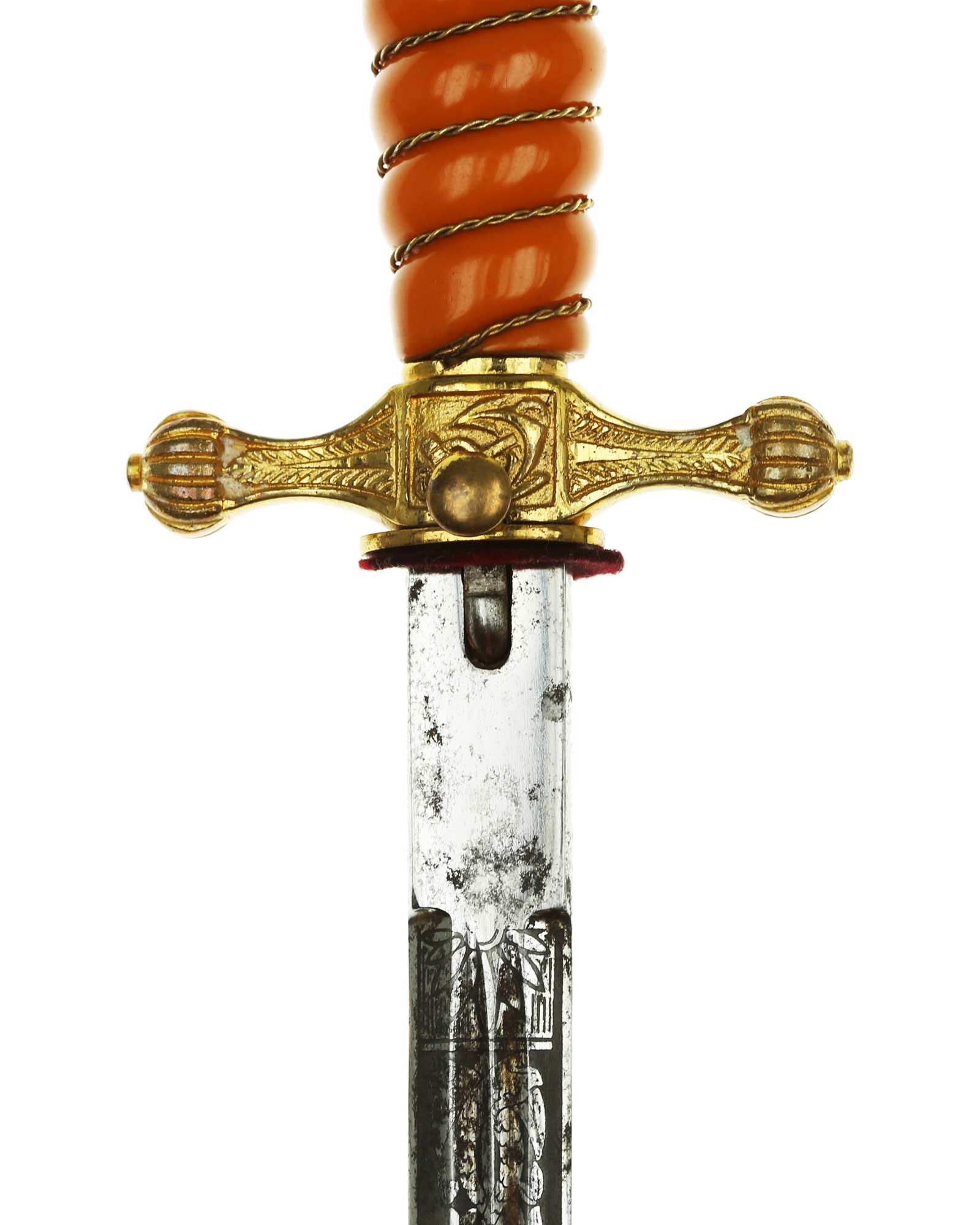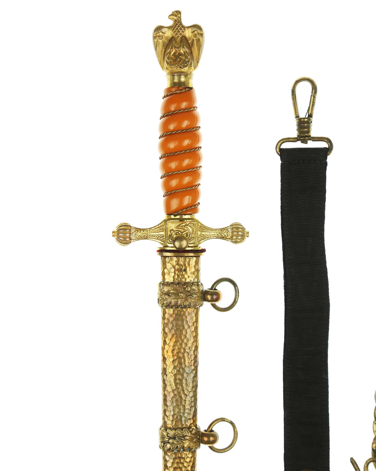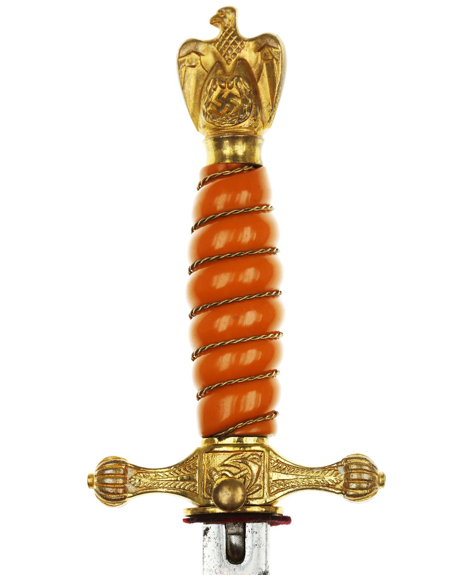 Griff: Griff, verläuft leicht oval. Der Griff ist mit einem Doppeldraht gewickelt. Die Parierstange und der Knauf sind aus Buntmetall gefertigt und vergoldet worden. Unterhalb der Parierstange befindet sich der Stoßfilz. Der Knauf ist in Form eines Adlers, der mit seinen Krallen das Hakenkreuz in einem Kranz festhält.