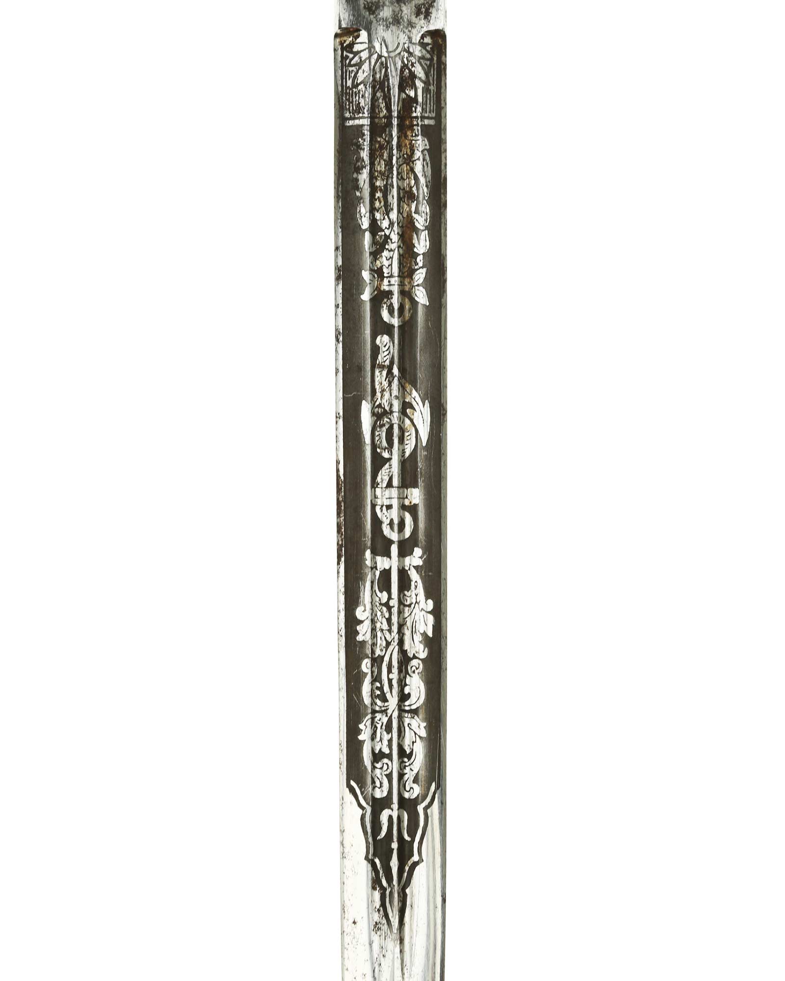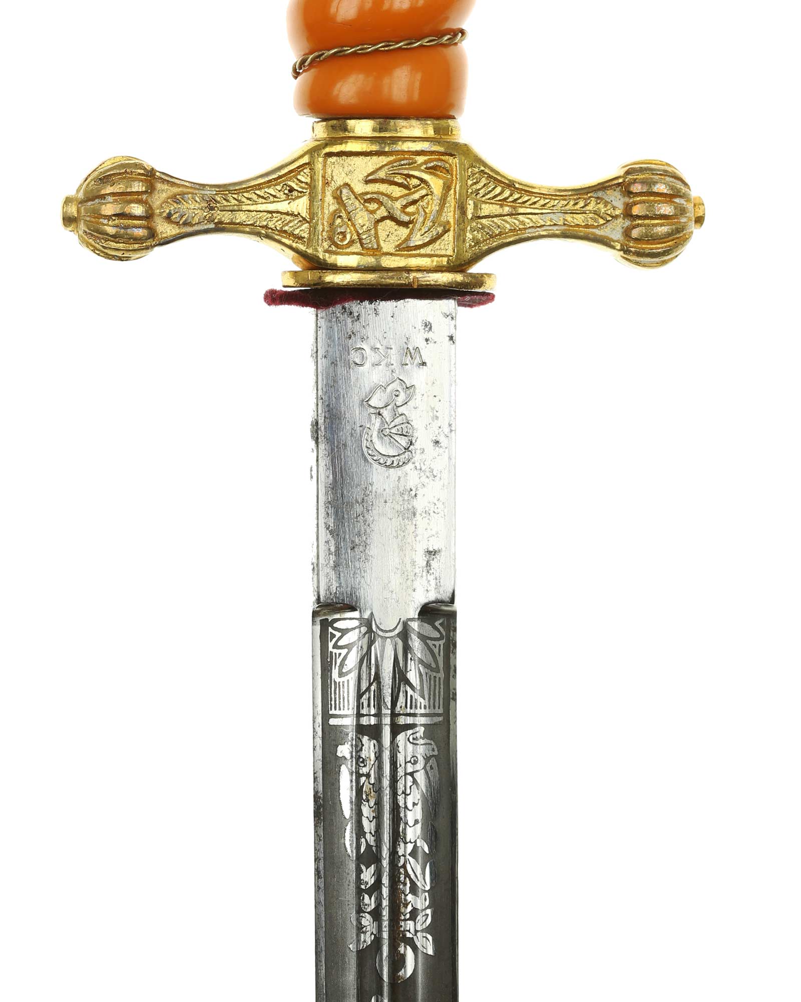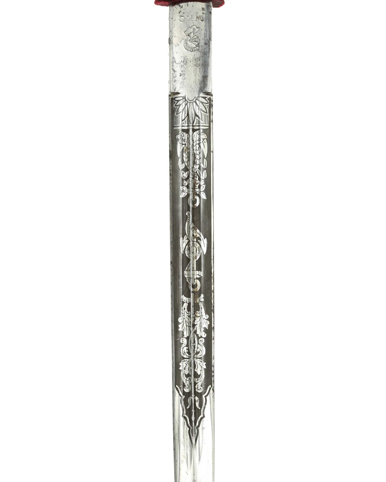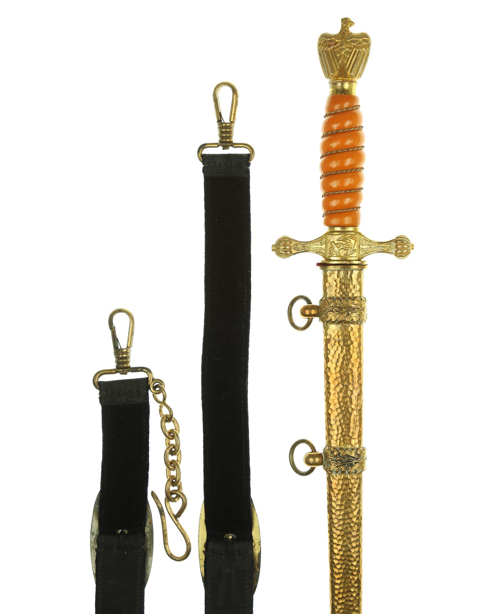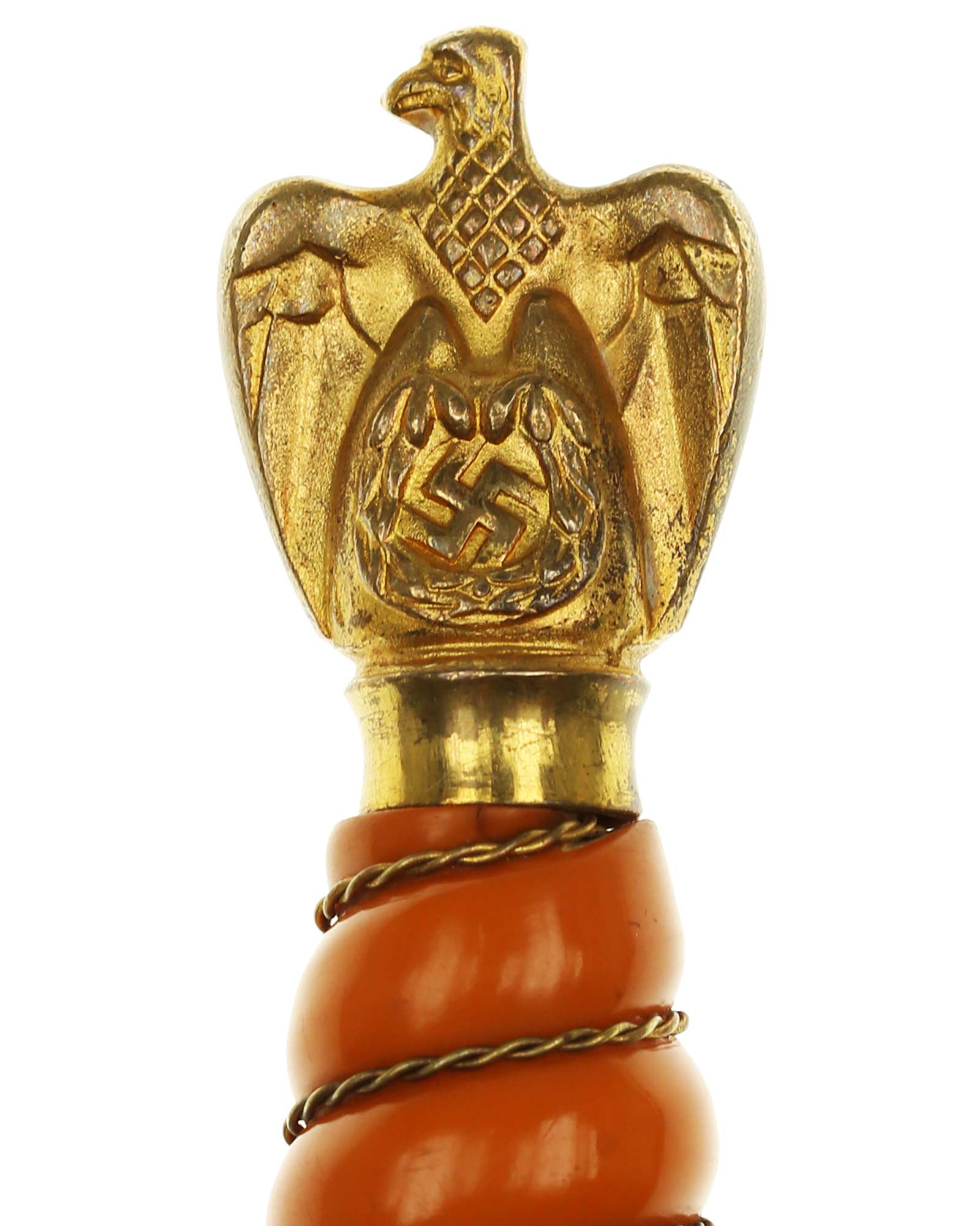 Griff: Griff, verläuft leicht oval. Der Griff ist mit einem Doppeldraht gewickelt. Die Parierstange und der Knauf sind aus Buntmetall gefertigt und vergoldet worden. Unterhalb der Parierstange befindet sich der Stoßfilz. Der Knauf ist in Form eines Adlers, der mit seinen Krallen das Hakenkreuz in einem Kranz festhält.