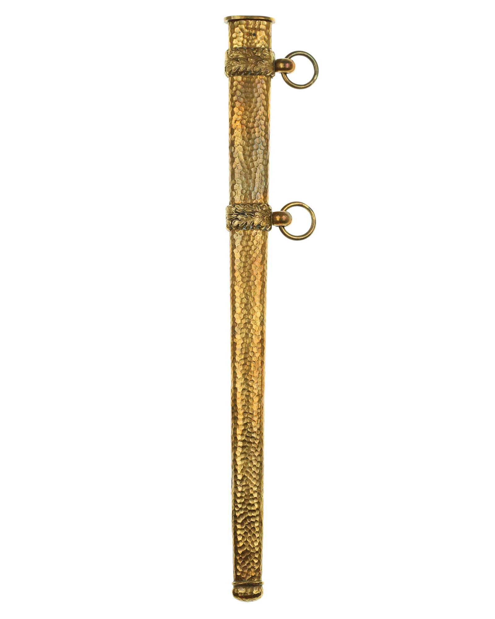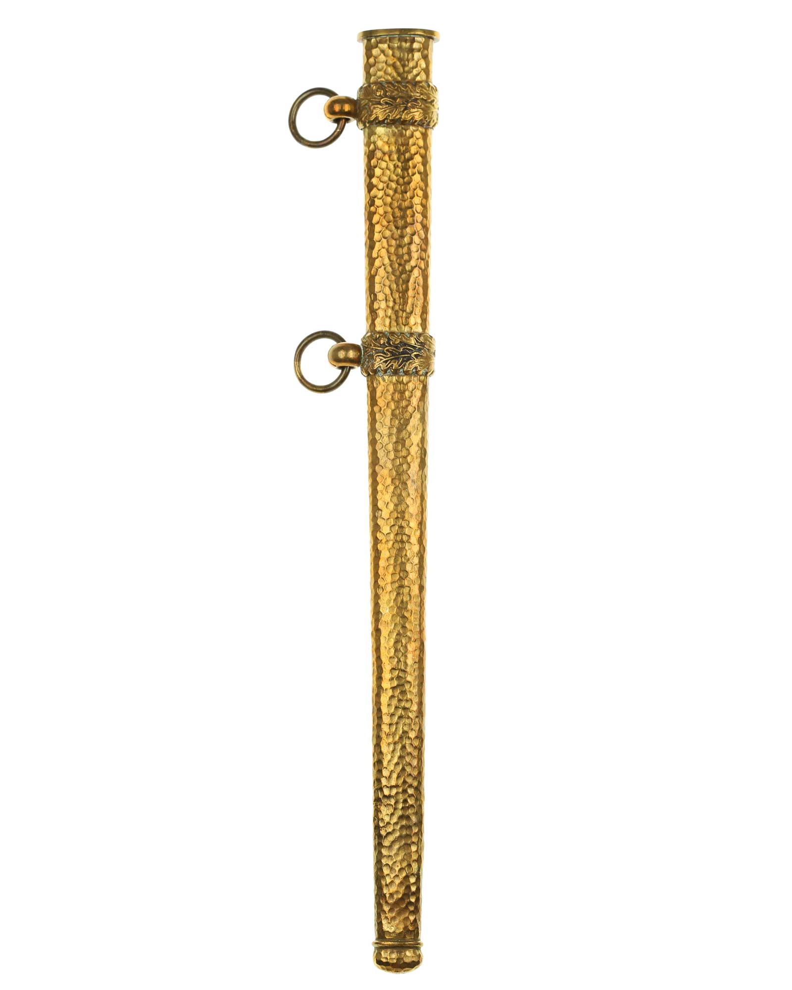 Scheide: Gehämmerte Scheide. Die Ringbänder sind mit Eichenlaubdekor. Die beiden Trageringe sind geschlossen. Die Scheide geht saugend in den Dolch rein.
