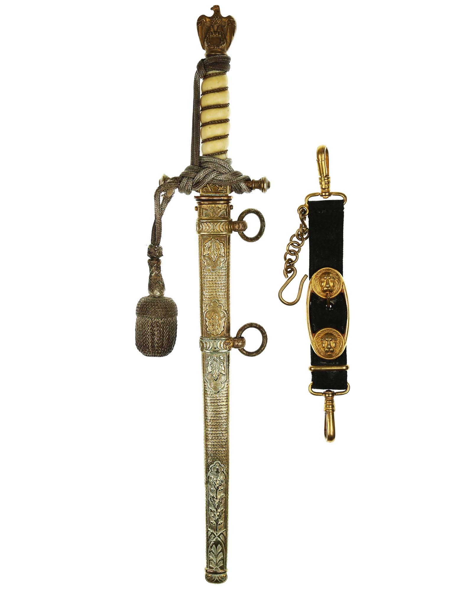 Griff: Heller Griff, verläuft leicht oval. Elfenbeingriff mit Messingdrahtwicklung. Die Parierstange und der Knauf sind aus Buntmetall gefertigt und vergoldet worden. Unterhalb der Parierstange befindet sich das Stoßleder. Der Knauf ist in Form eines Adlers, der mit seinen Krallen das Hakenkreuz in einem Kranz festhält. Komplett mit dem original geknoteten Portepee.