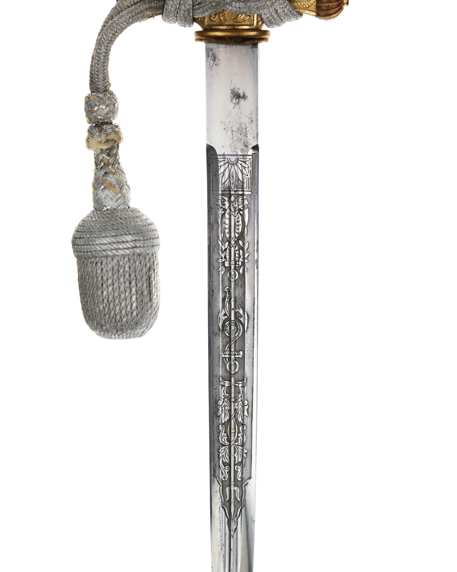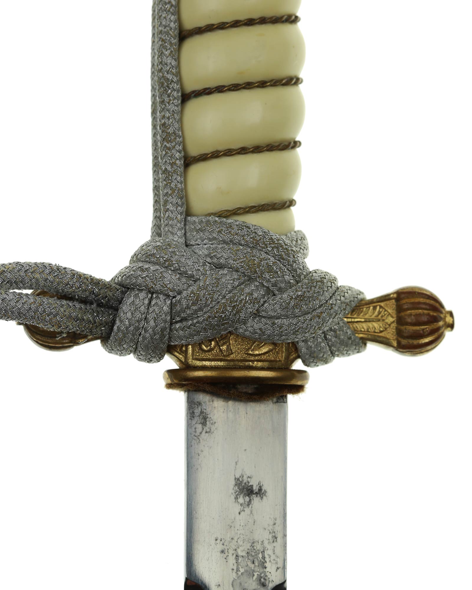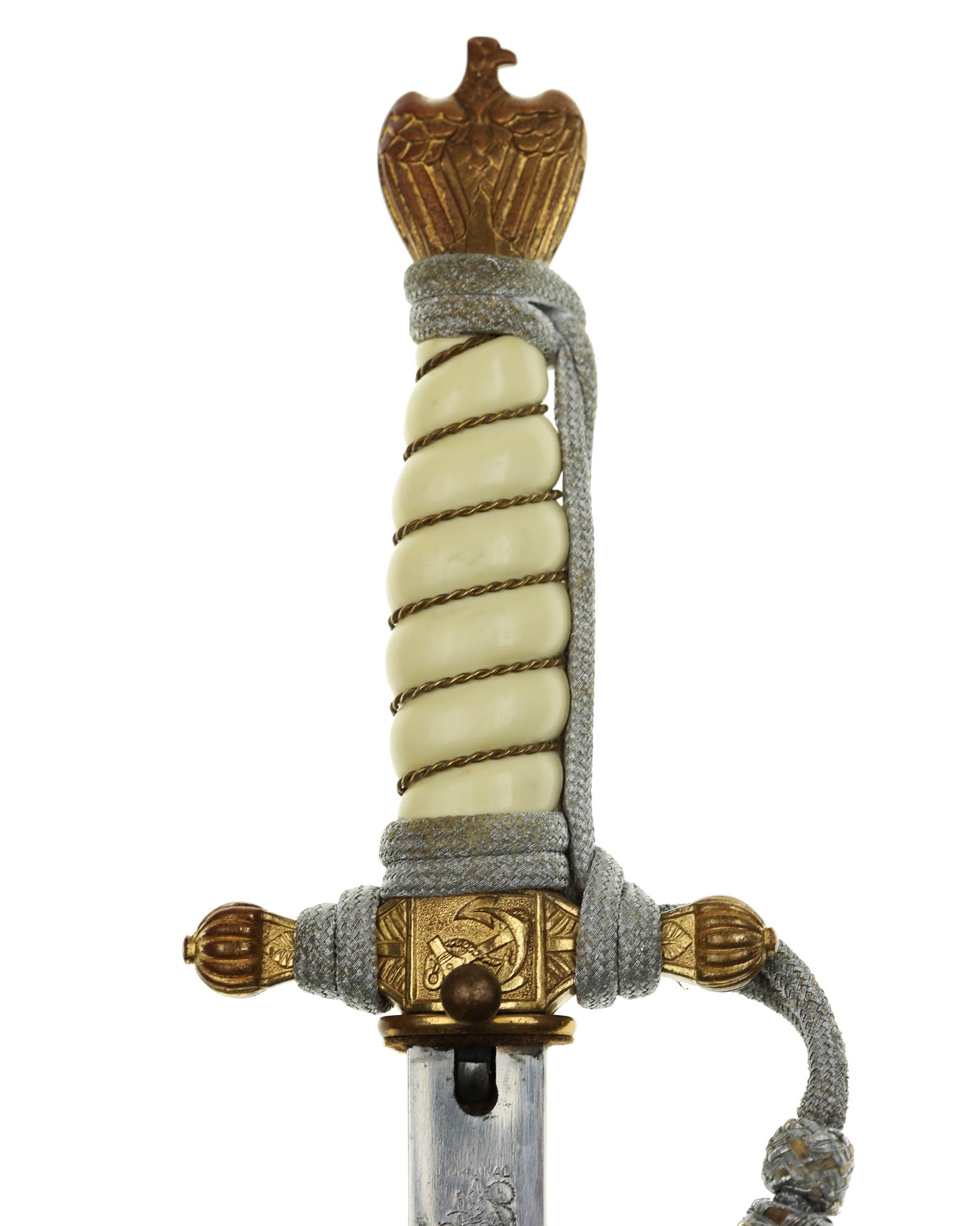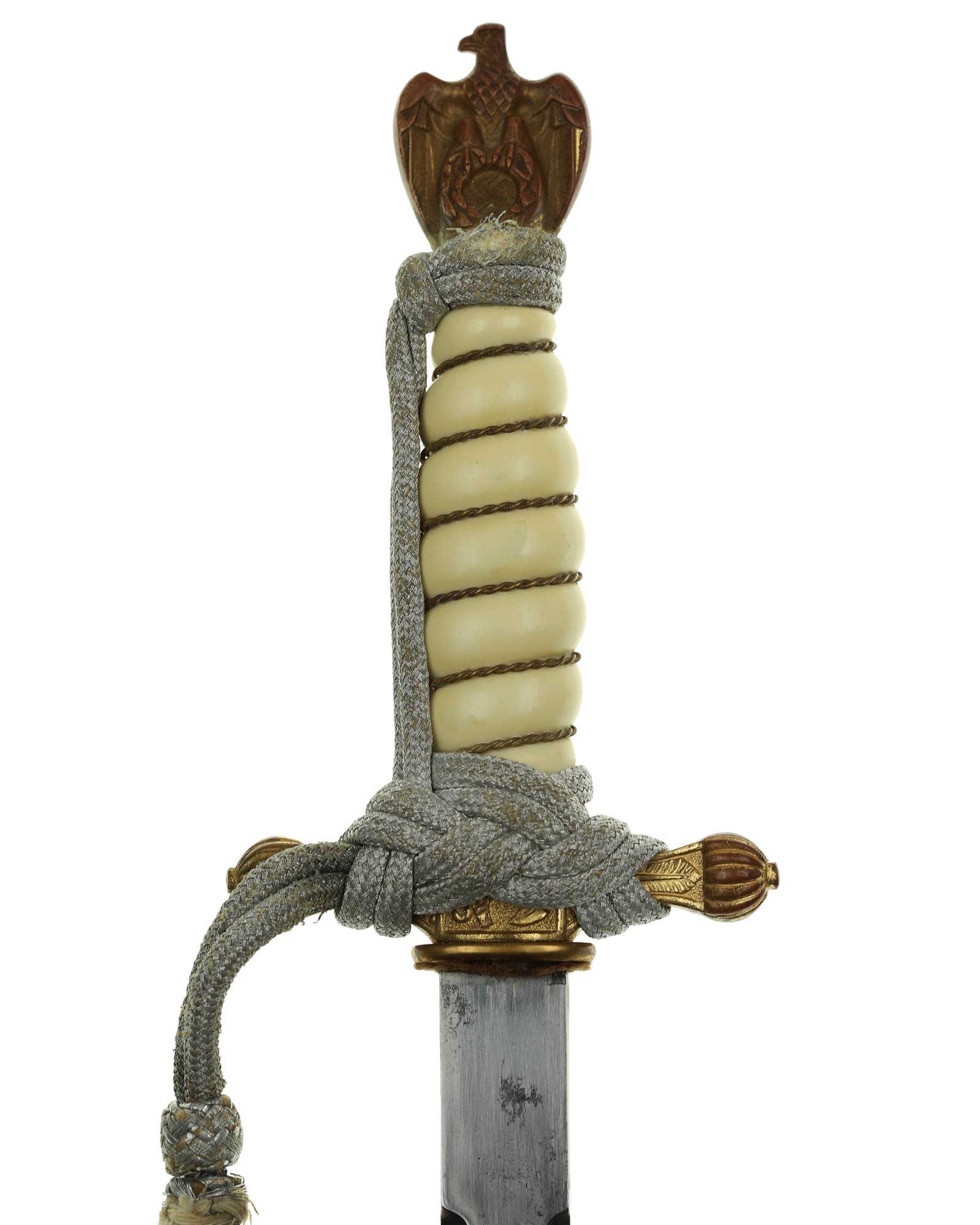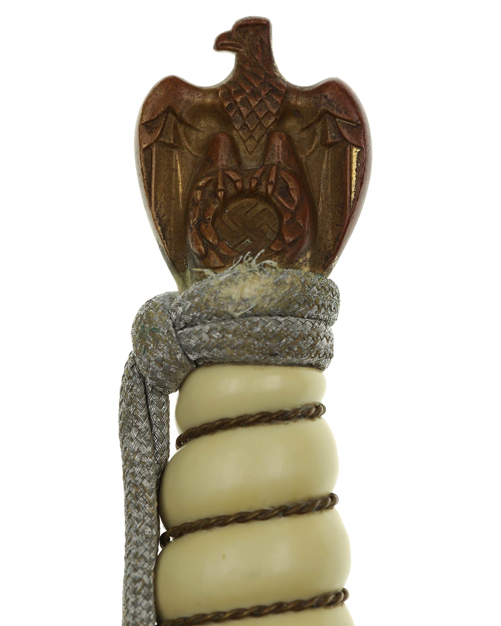 Griff: Heller Griff, verläuft leicht oval. Der Griff besteht aus einem Holzkern und ist mit Zelluloid überzogen. Der Griff ist mit einem Doppeldraht gewickelt. Die Parierstange und der Knauf sind aus Buntmetall gefertigt und vergoldet worden. Der Knauf, Parierstange und die Scheide haben eine gleiche Patina. Unterhalb der Parierstange befindet sich das Stoßleder. Der Druckknopf funktioniert einwandfrei. Der Knauf ist in Form eines Adlers, der mit seinen Krallen das Hakenkreuz in einem Kranz festhält.