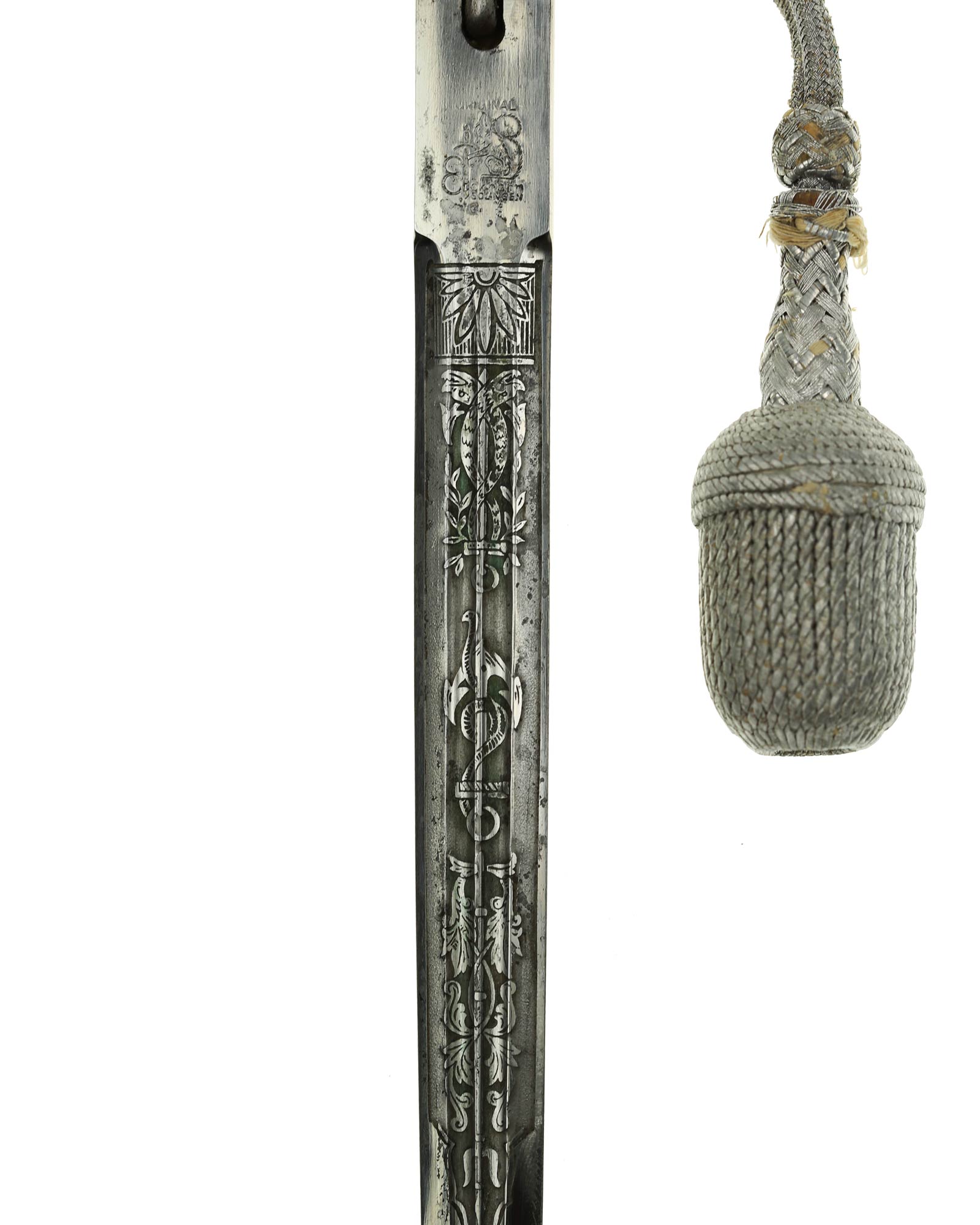 Scheide: Blitzscheide. Die Ringbänder sind mit Eichenlaubdekor. Das Mundblech wird anhand von zwei seitlich befestigten Schrauben festgehalten. Die beiden Trageringe sind geschlossen.