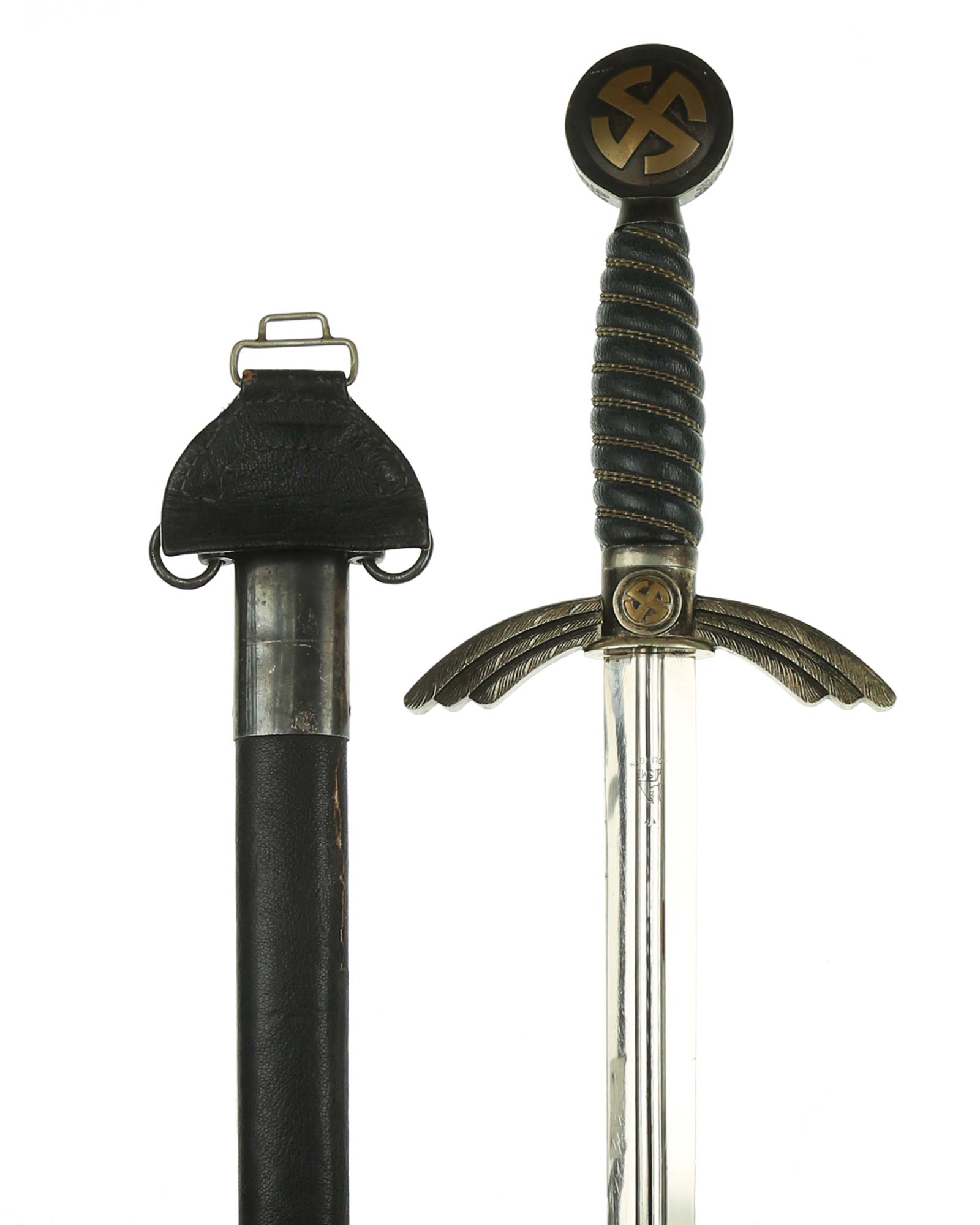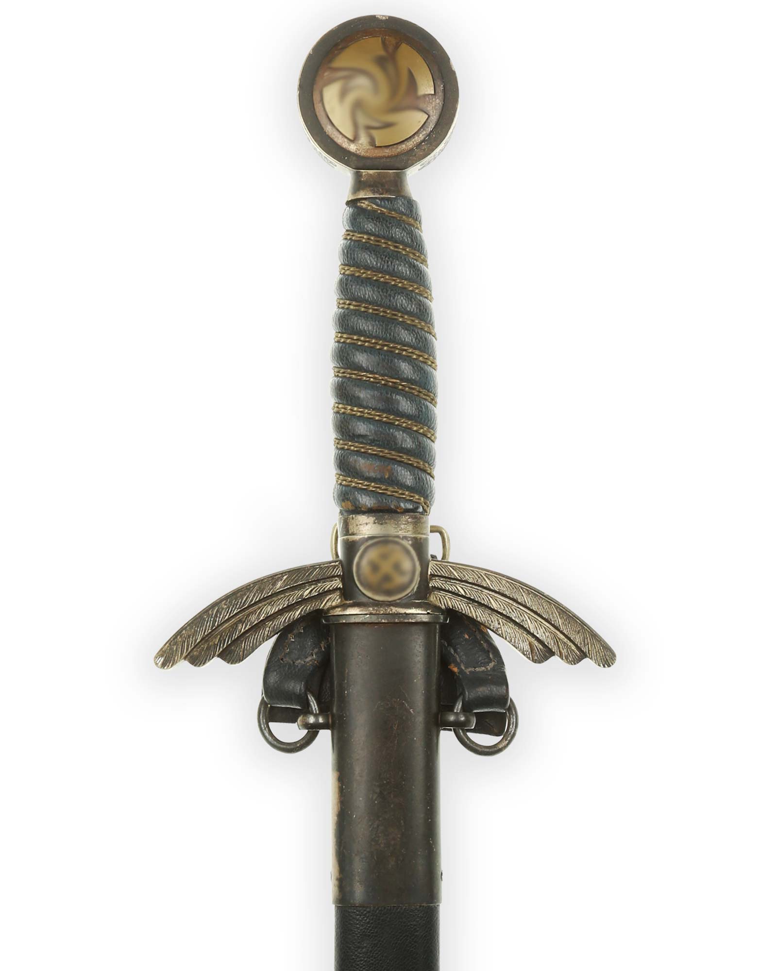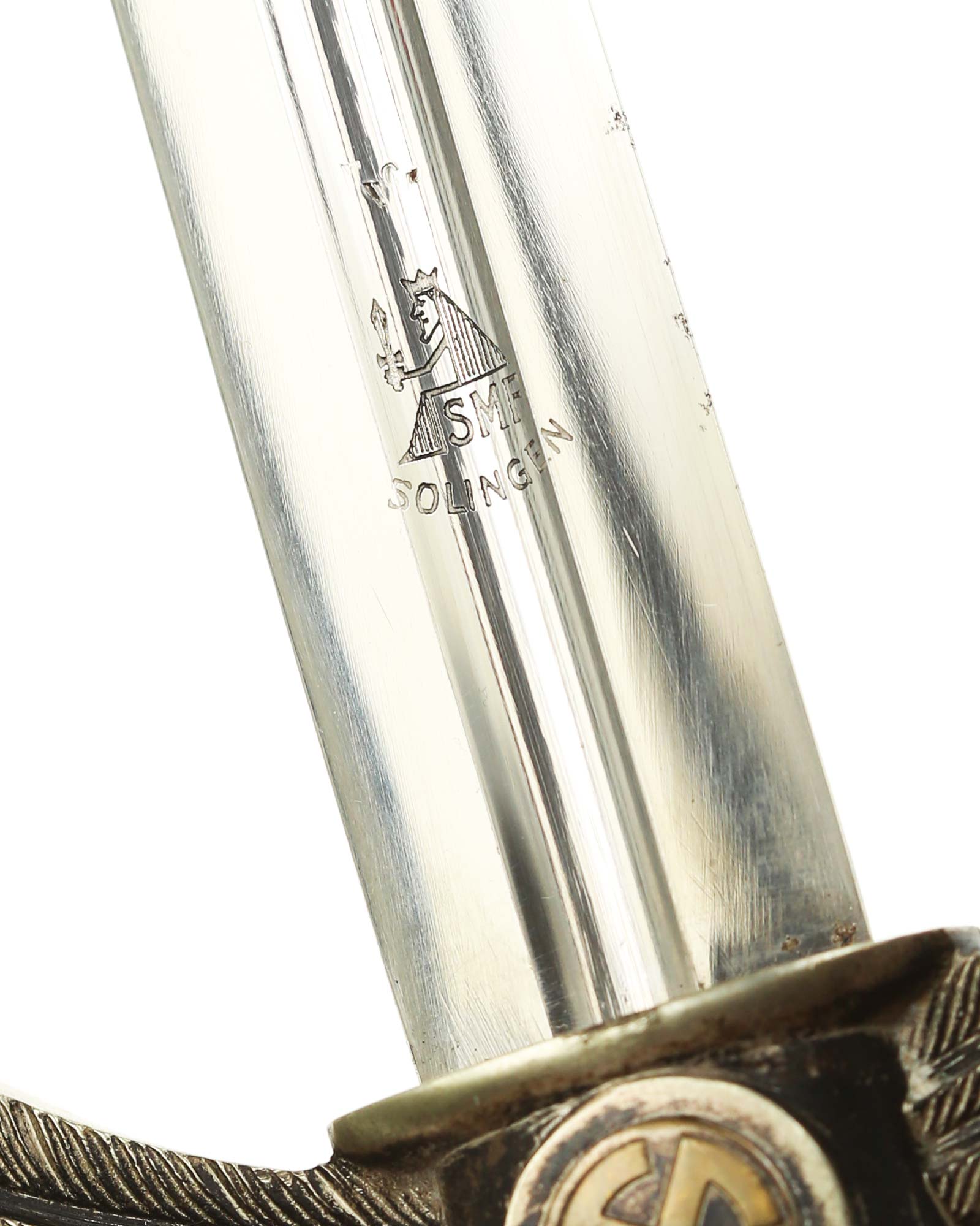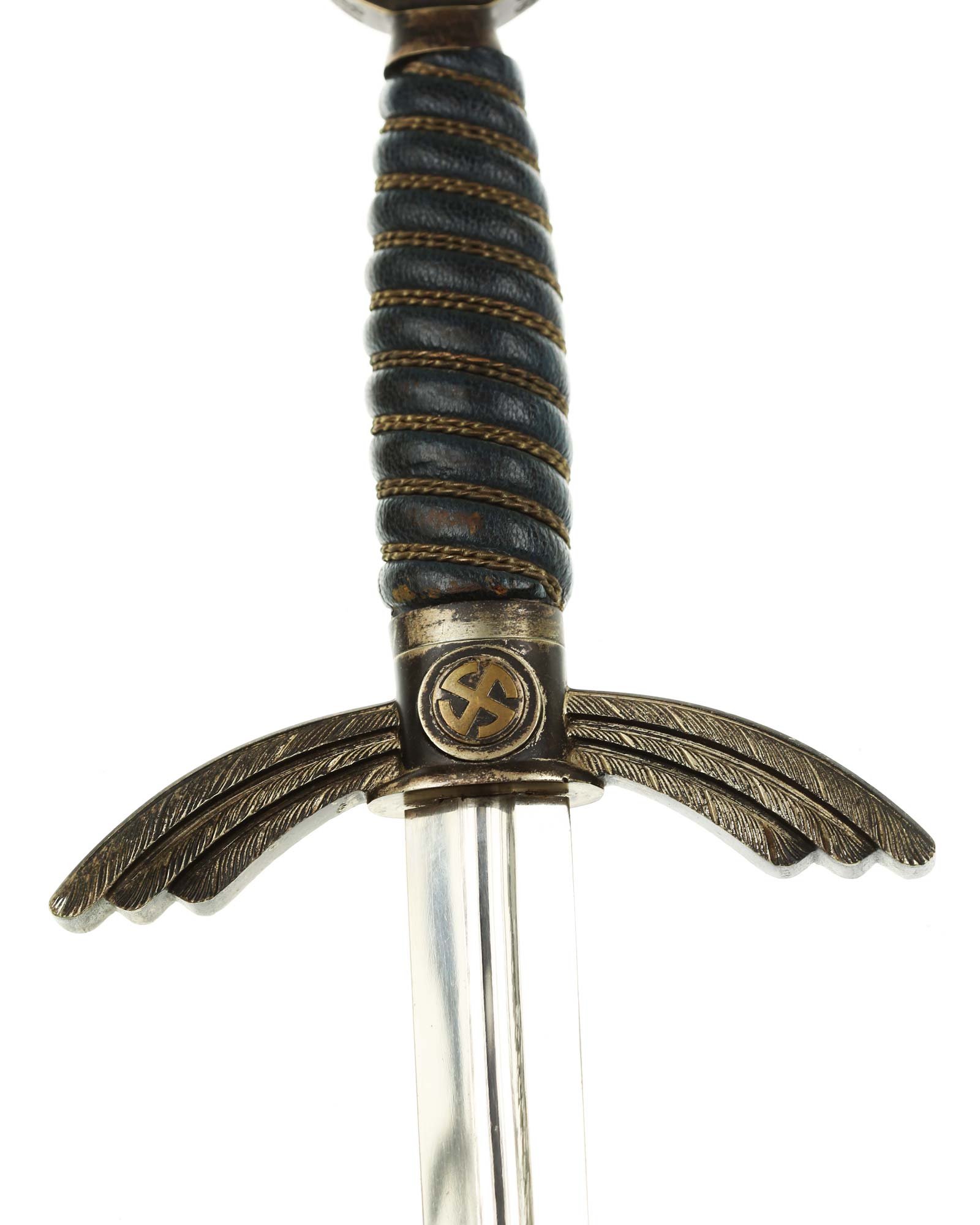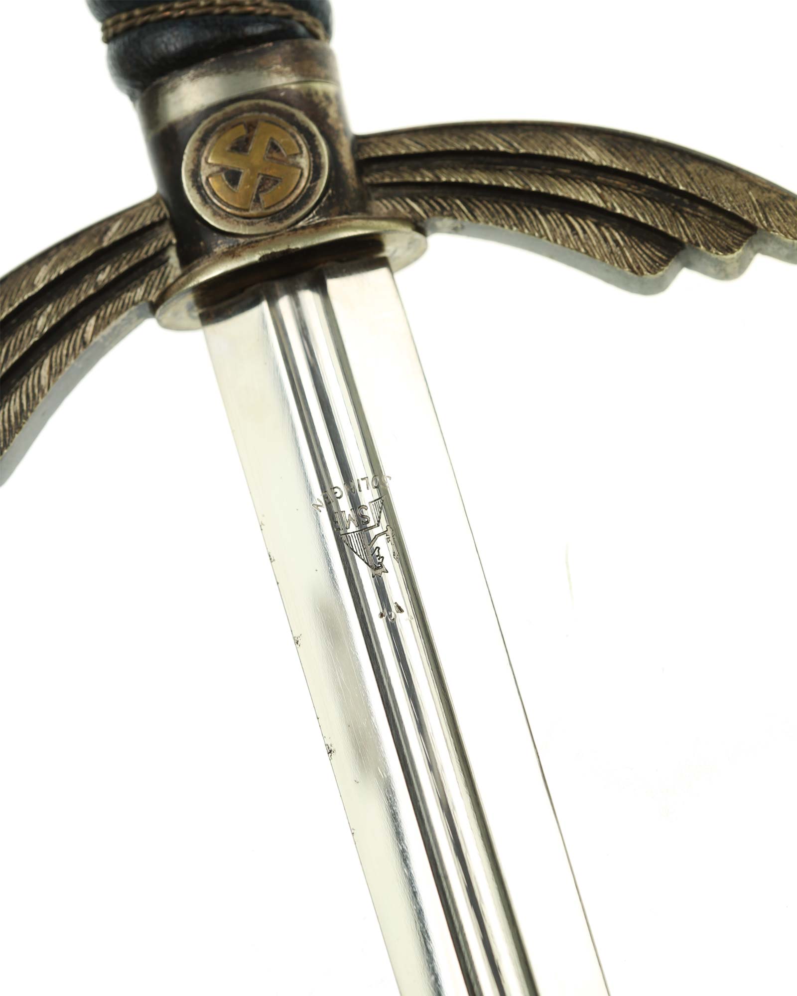 Fliegerschwert der Luftwaffe [Modell 1935] in früher Fertigung. Die Gesamtlänge beträgt 93,5 cm. Die Rückseite der Klinge ist mit Hersteller: SMF Solingen.