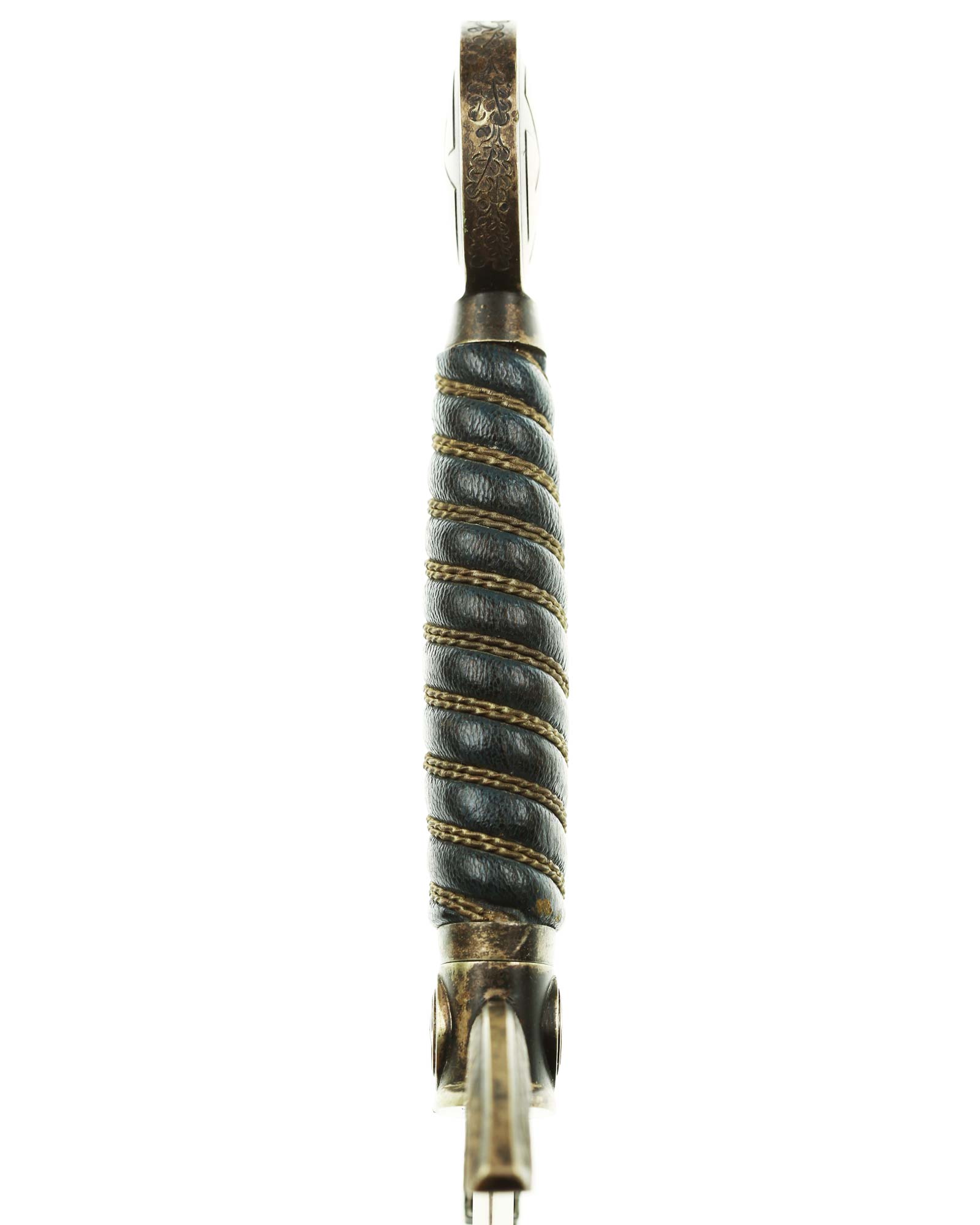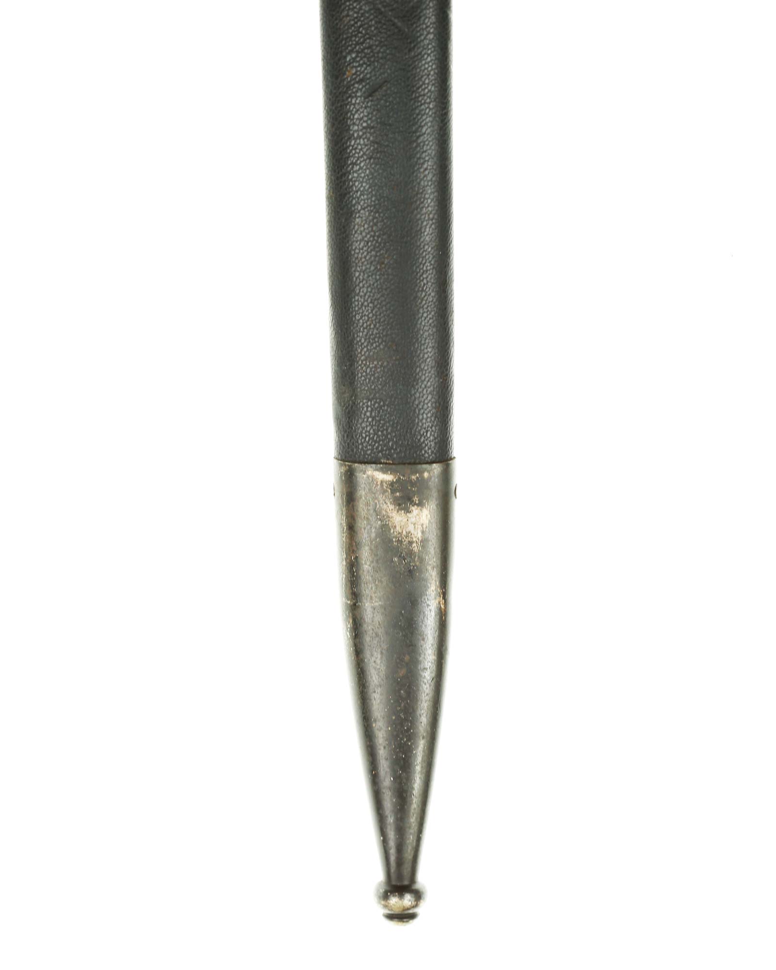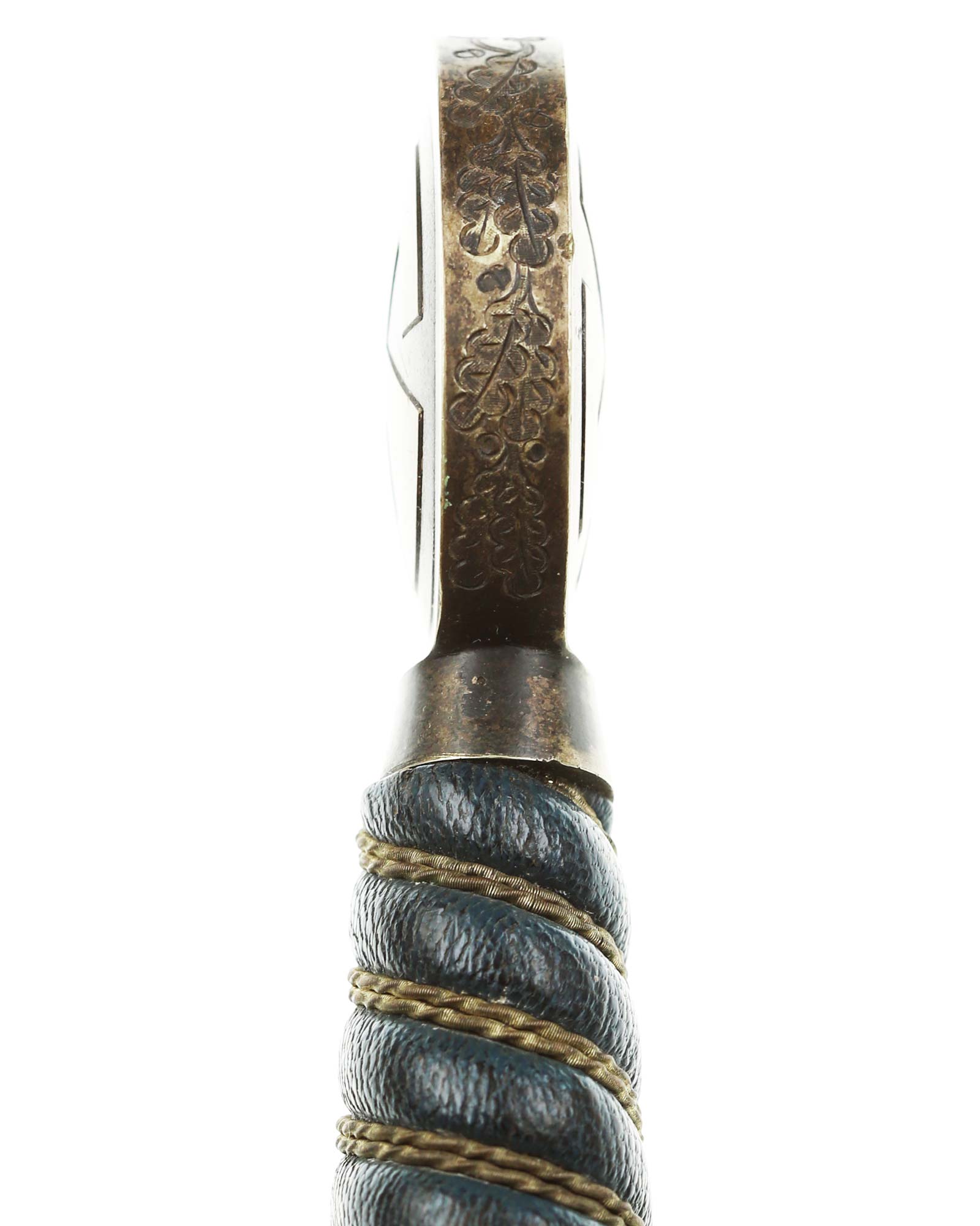 Scheide: Die Scheide ist gerade und ohne Dellen oder Beulen, ebenfalls mit blauen Saffianleder umwickelt. Gleichmäßige Patina über gesamtes Fliegerschwert.