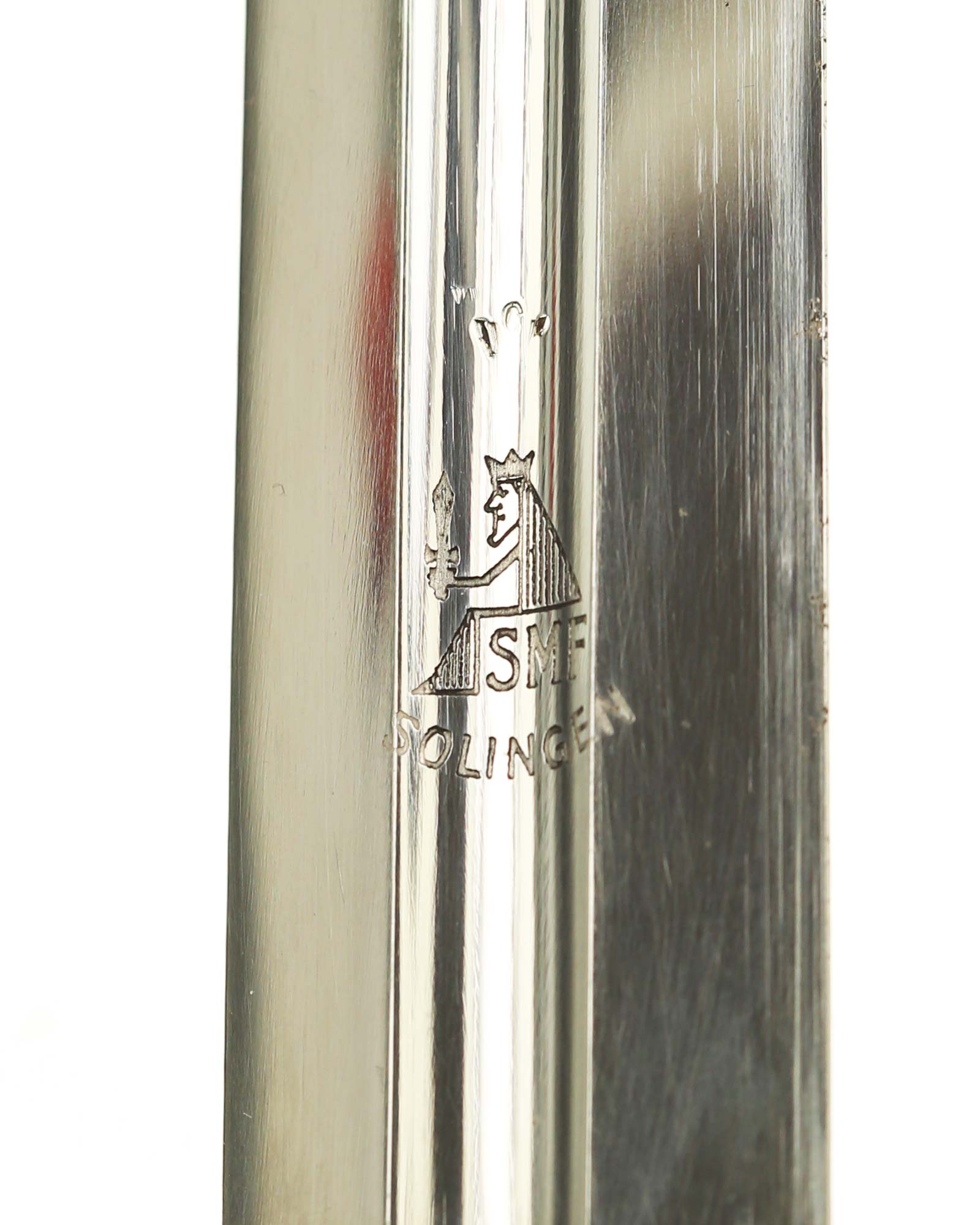 Klinge: Die Klinge ist vernickelt mit Herstellerloge SMF Solingen und Luftwaffenabnahmestempel. Die Schultern der Klinge passen perfekt auf die Parierstange. Blaues Stoßleder vorhanden.