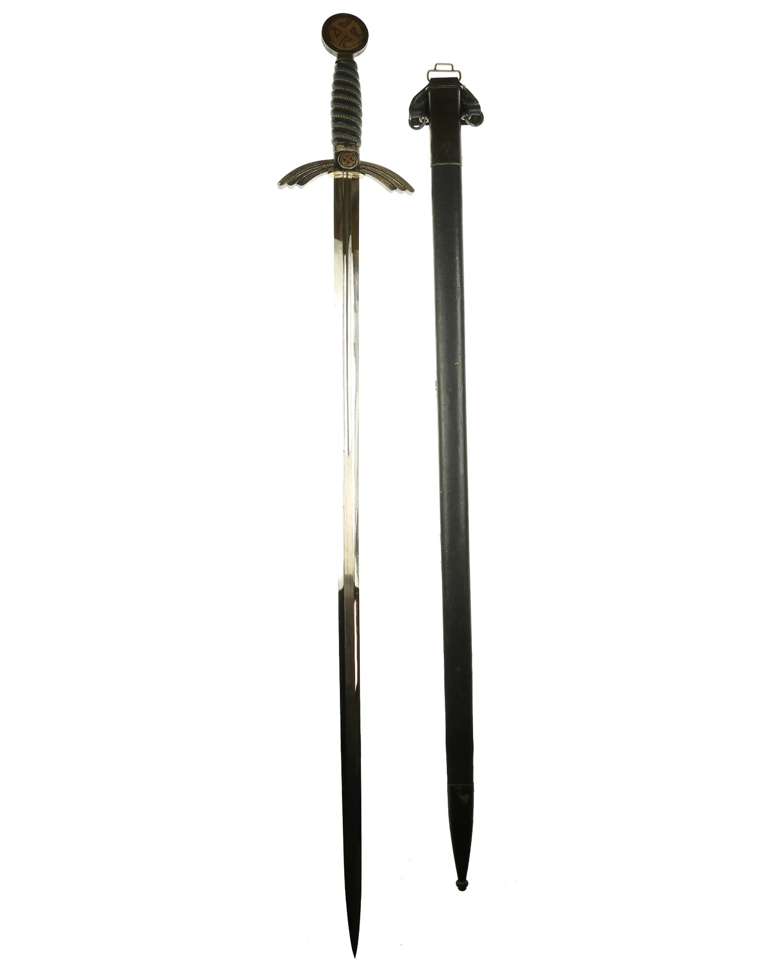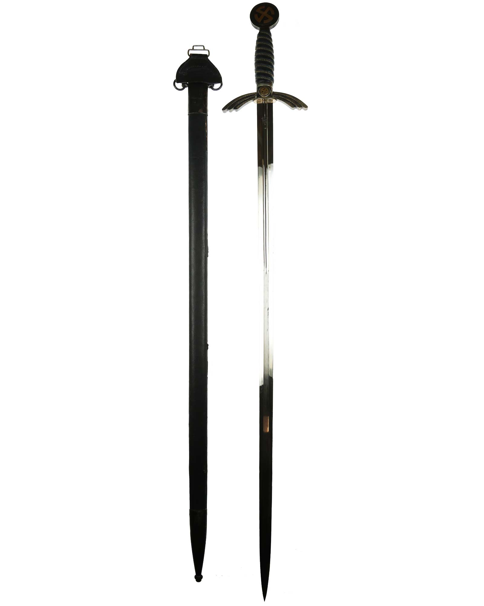 Griff: Der Griff besteht aus einem Holzkern, dieser ist mit einem blauen Saffianleder umwickelt. Die Griffwicklung ist noch sehr gut erhalten ohne Schäden. Der Knauf ist beidseitig mit vergoldeten Hakenkreuzen, dieser ist auf die Klingenangel festgeschraubt.