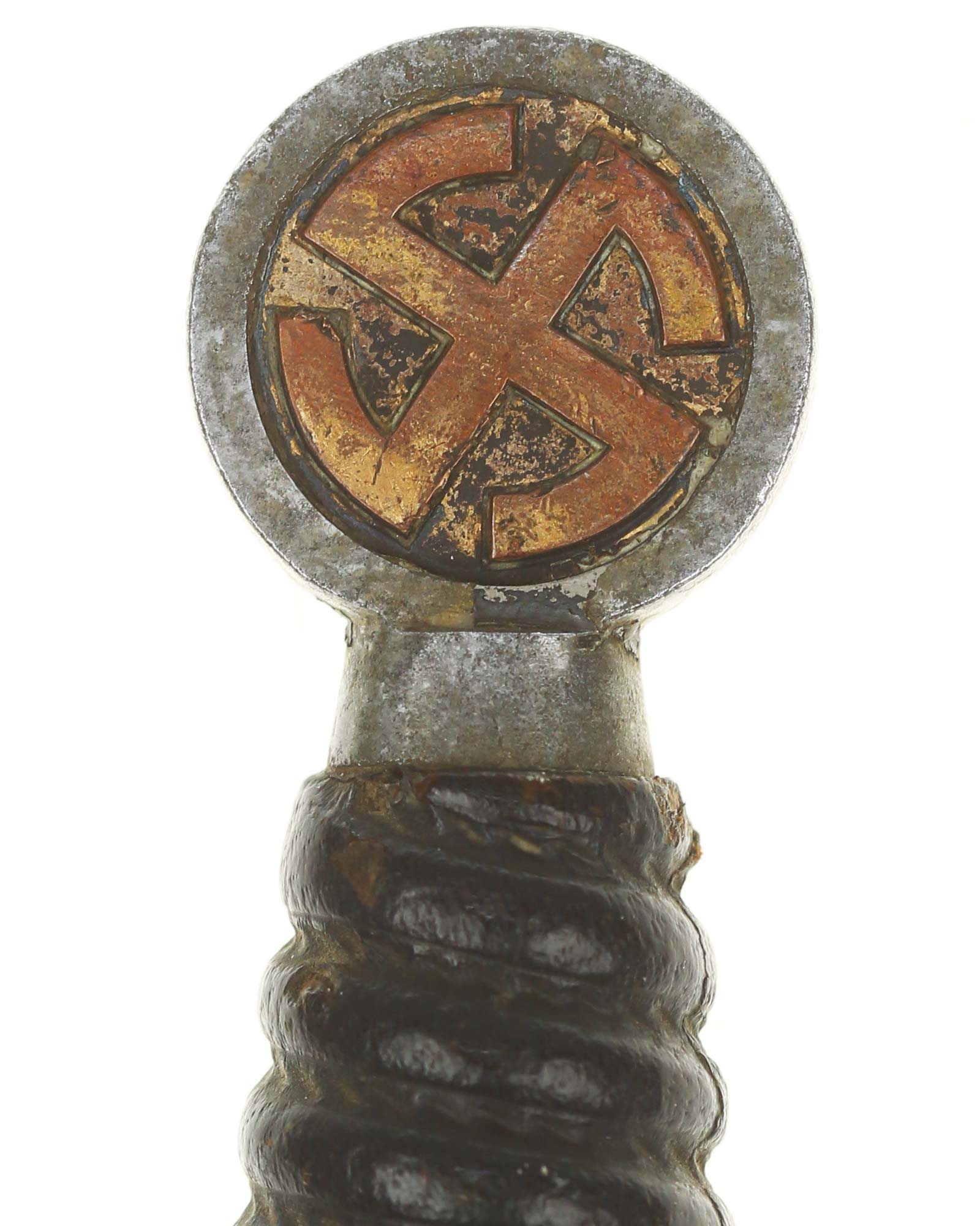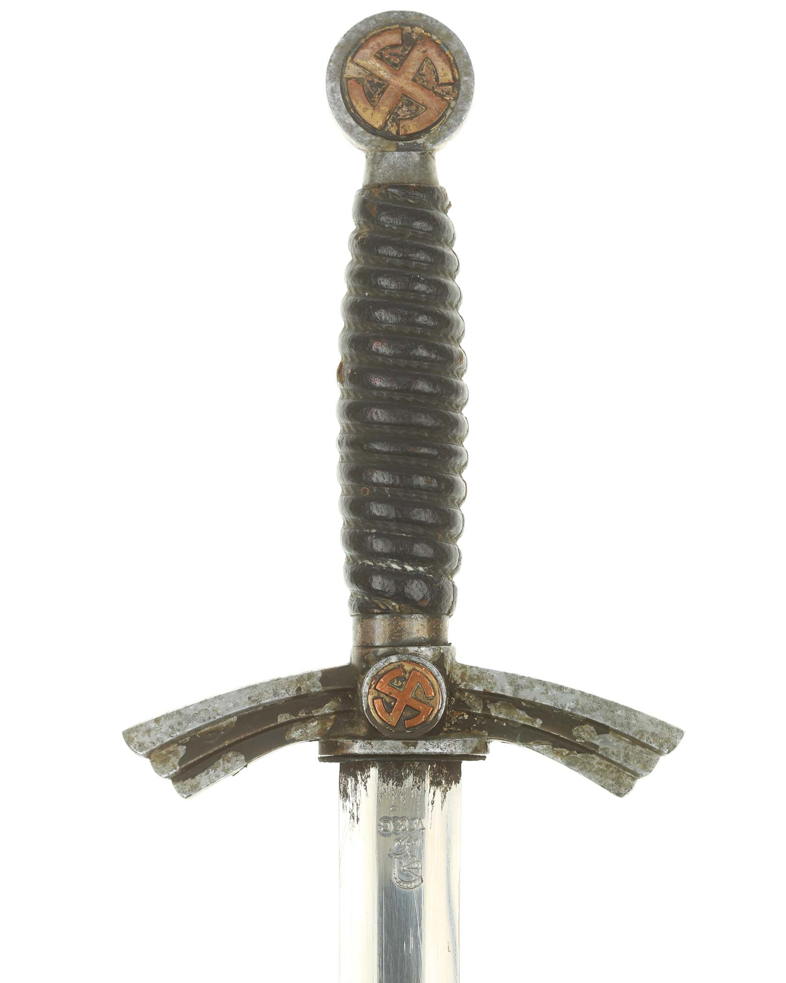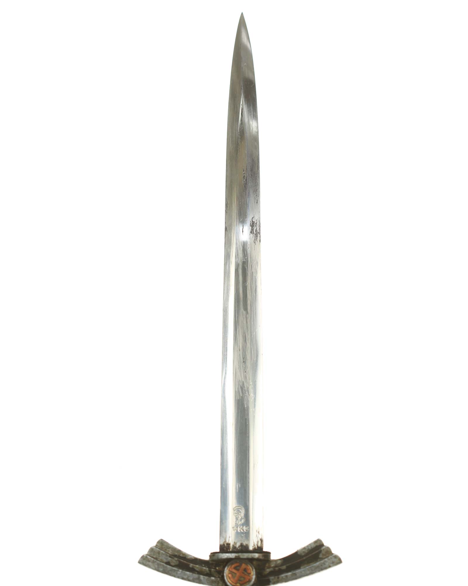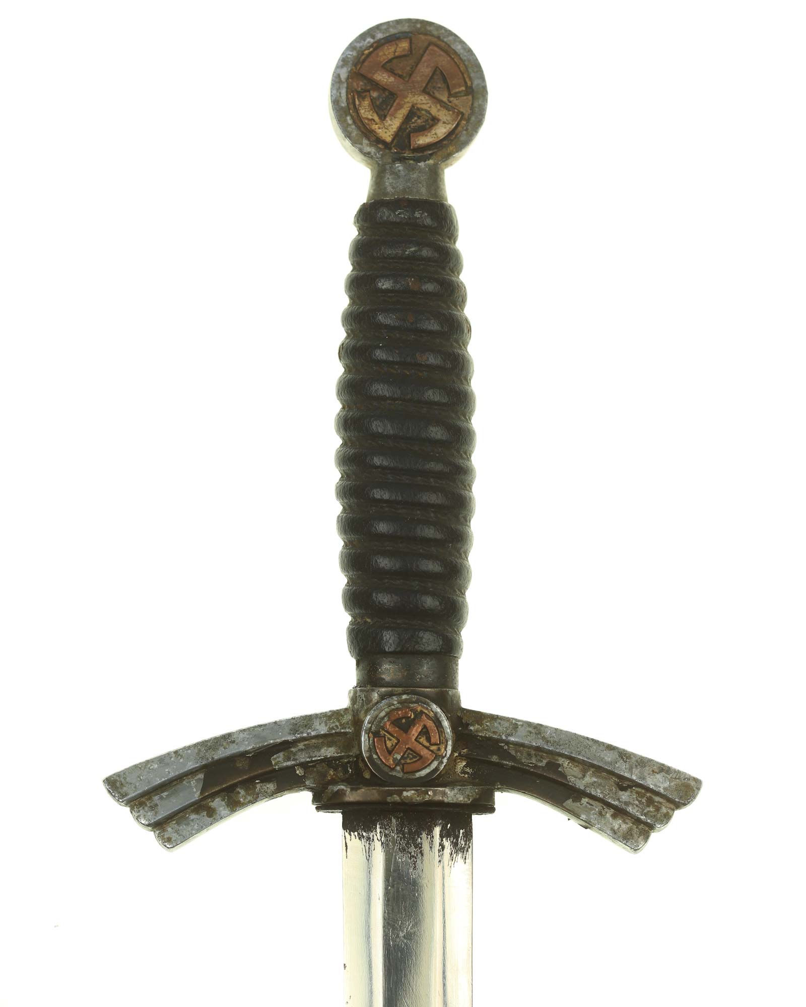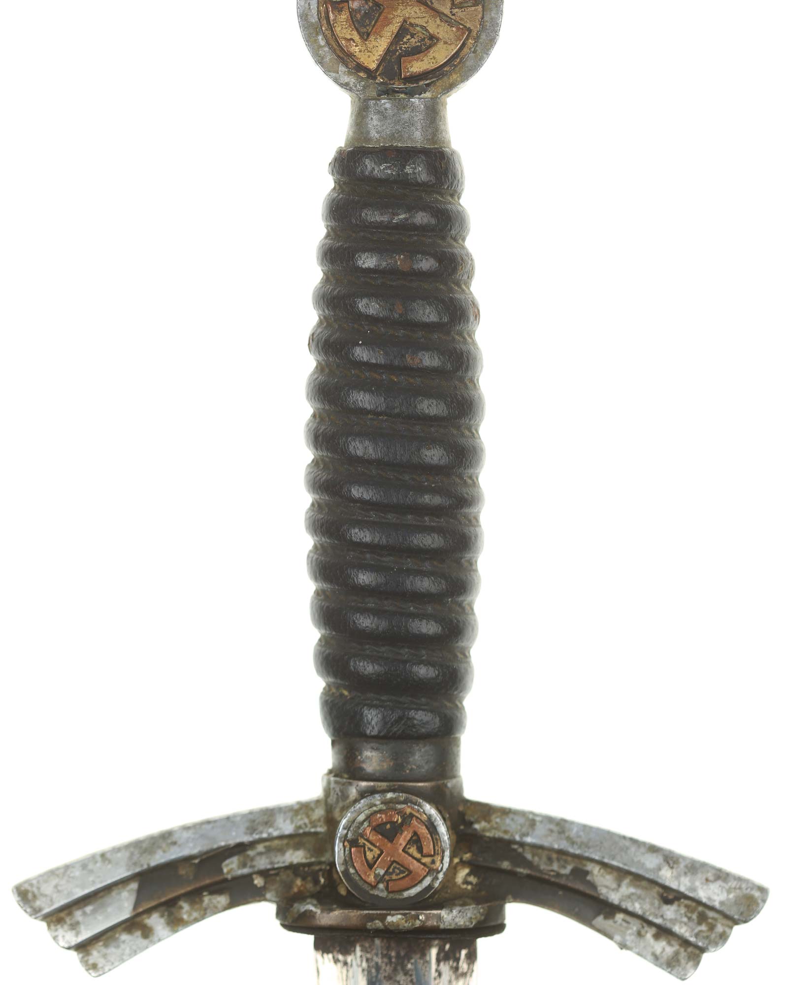 Griff: Der Griff besteht aus einem Holzkern, dieser ist mit einem blauem Saffianleder umwickelt. Die Griffwicklung fehlt. Der Knauf ist beidseitig mit Sonnenrädern, dieser ist auf die Klingenangel festgeschraubt.