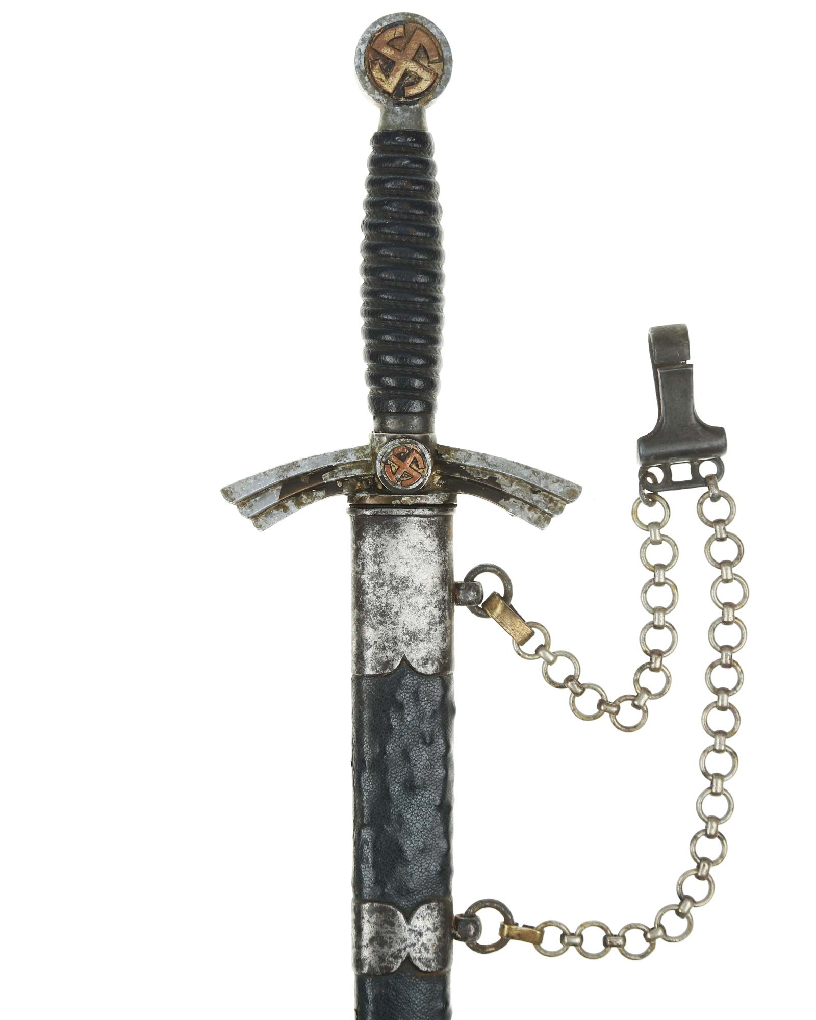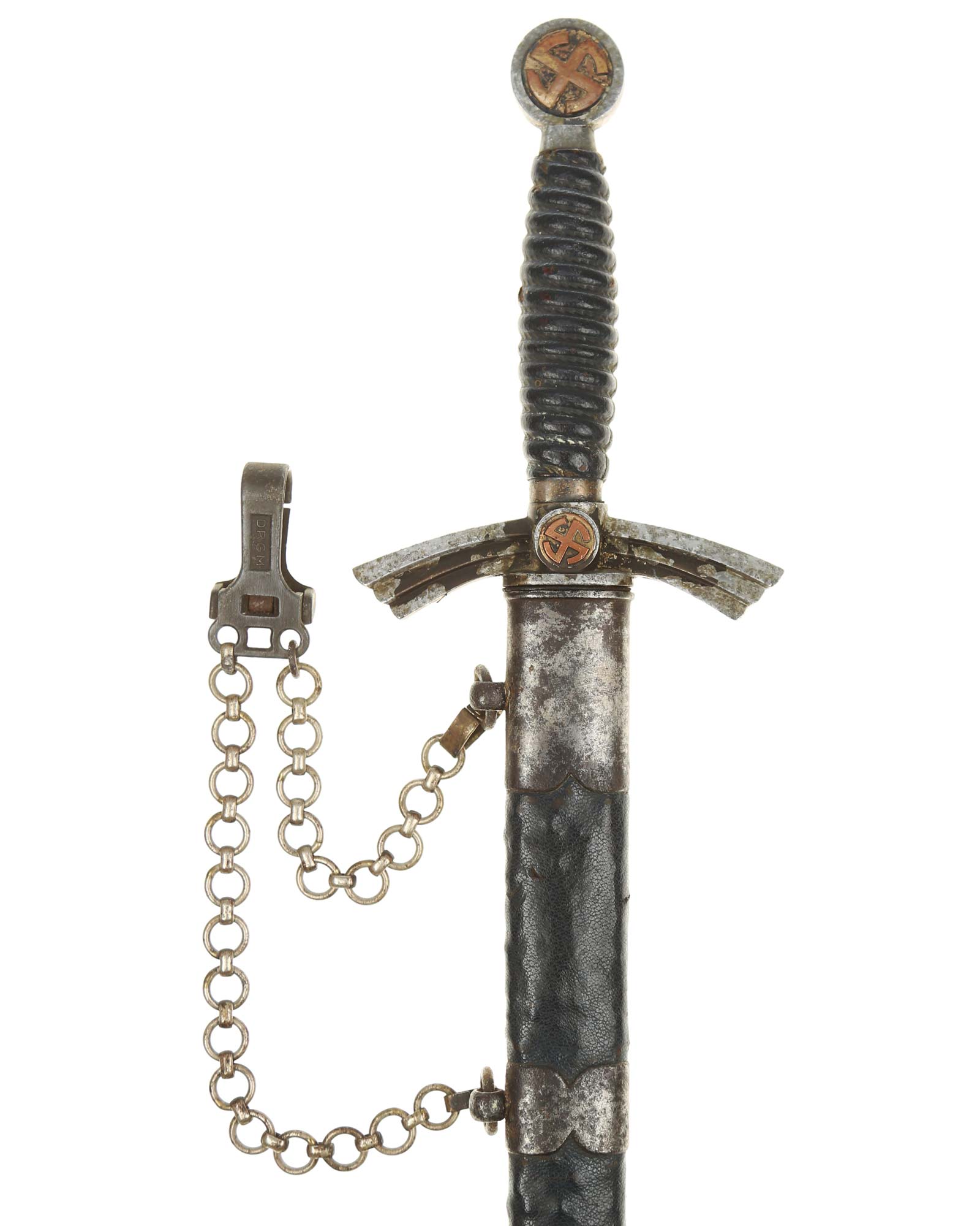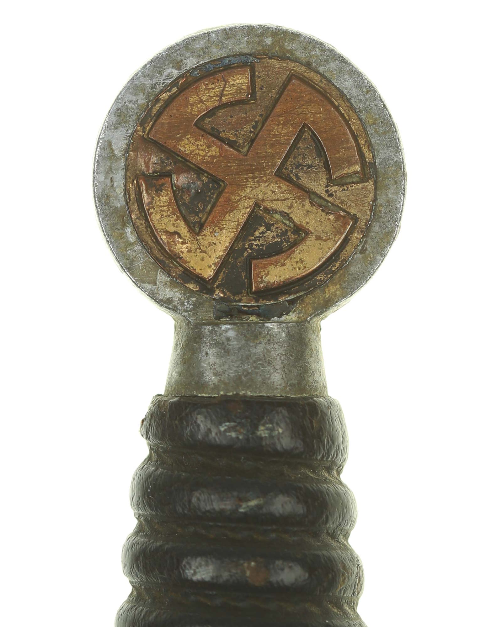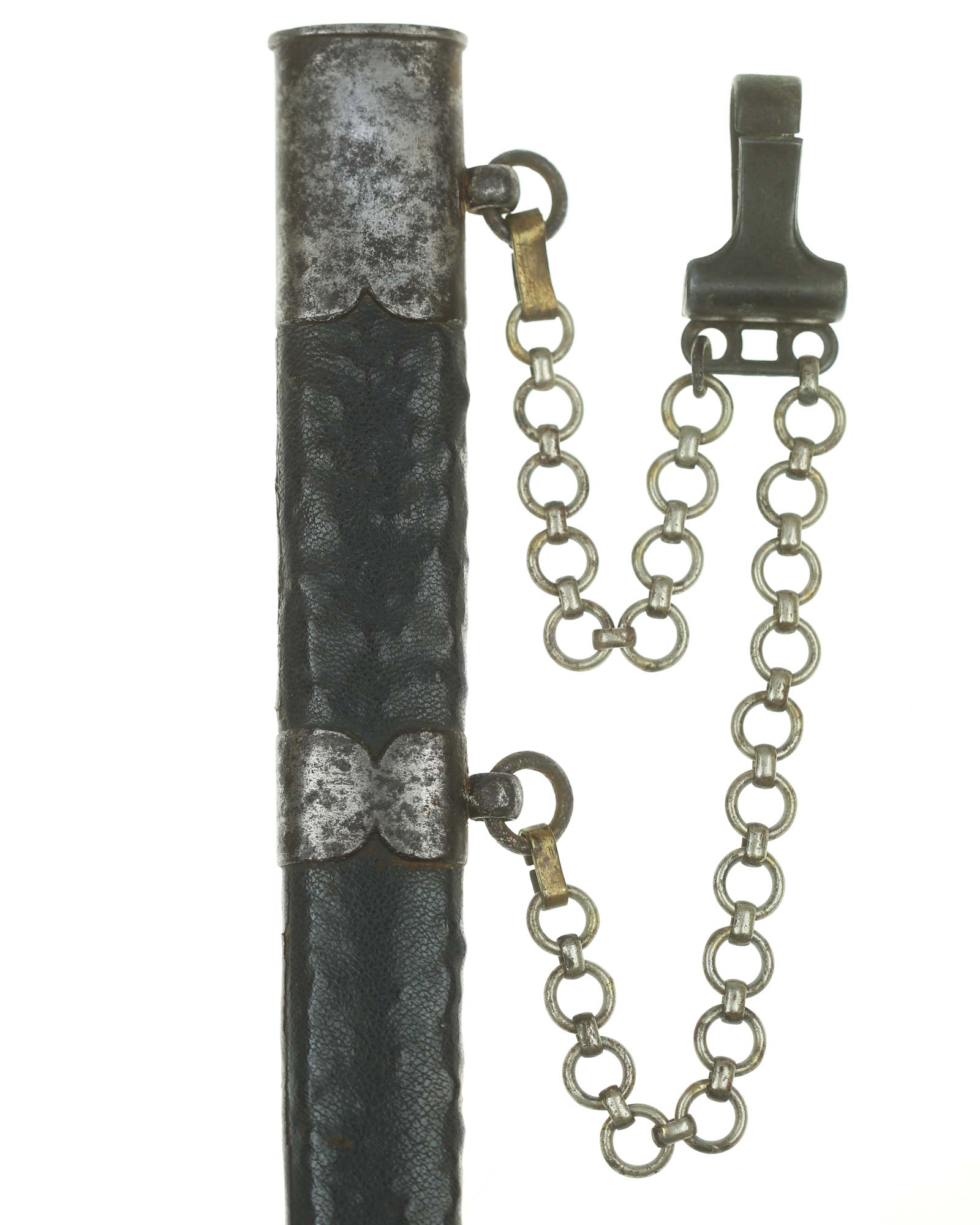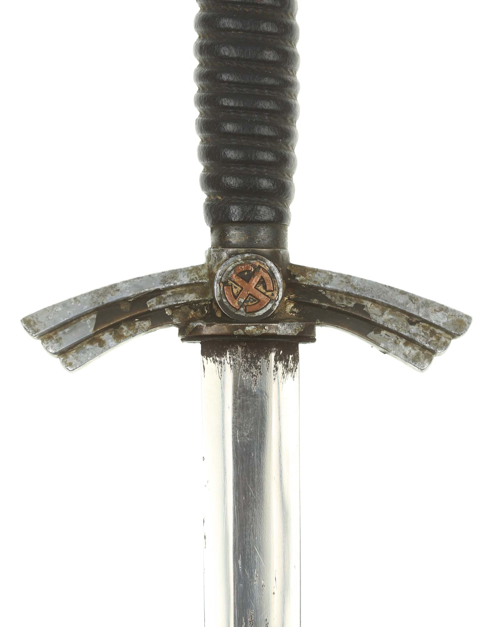 Griff: Der Griff besteht aus einem Holzkern, dieser ist mit einem blauem Saffianleder umwickelt. Die Griffwicklung fehlt. Der Knauf ist beidseitig mit Sonnenrädern, dieser ist auf die Klingenangel festgeschraubt.