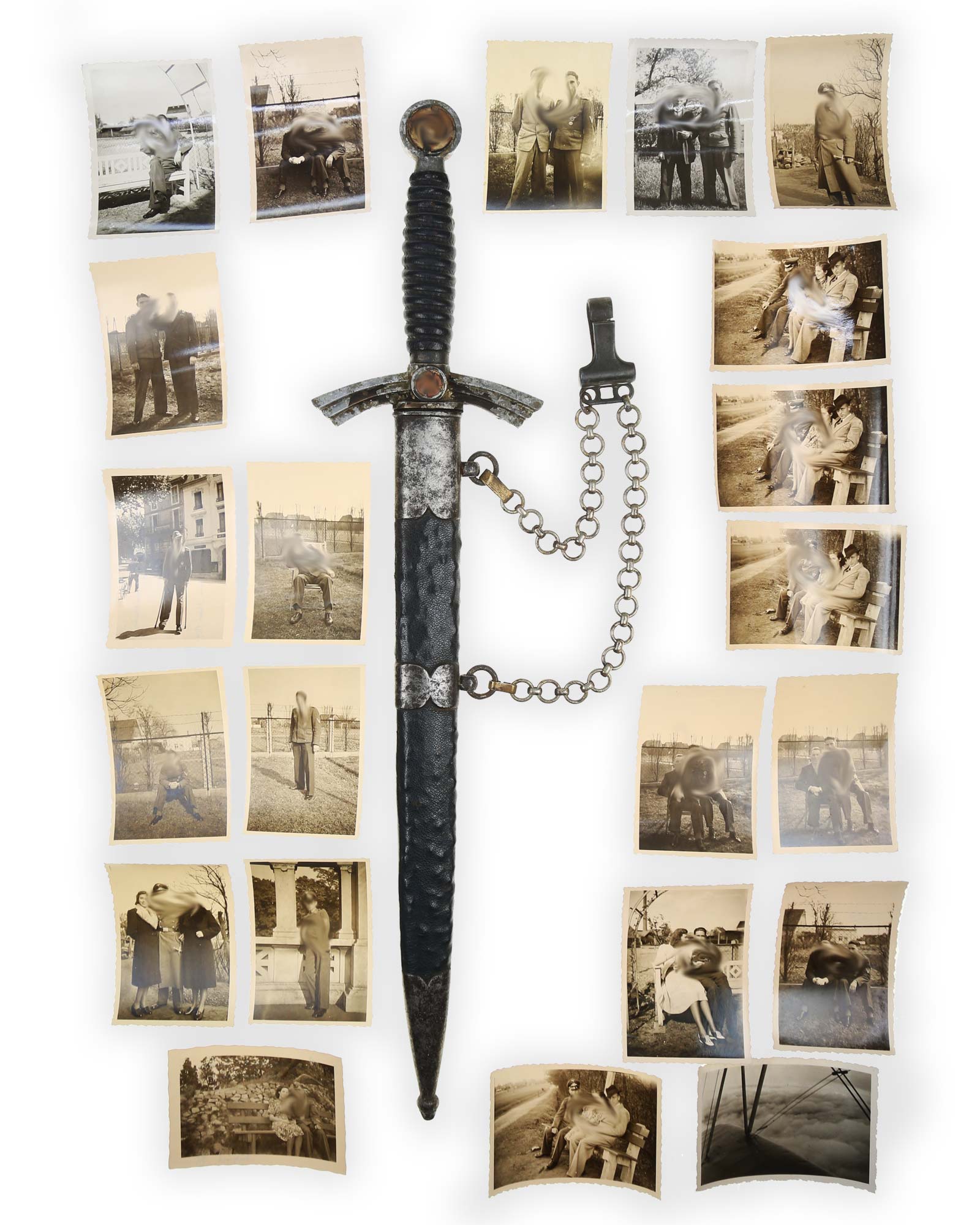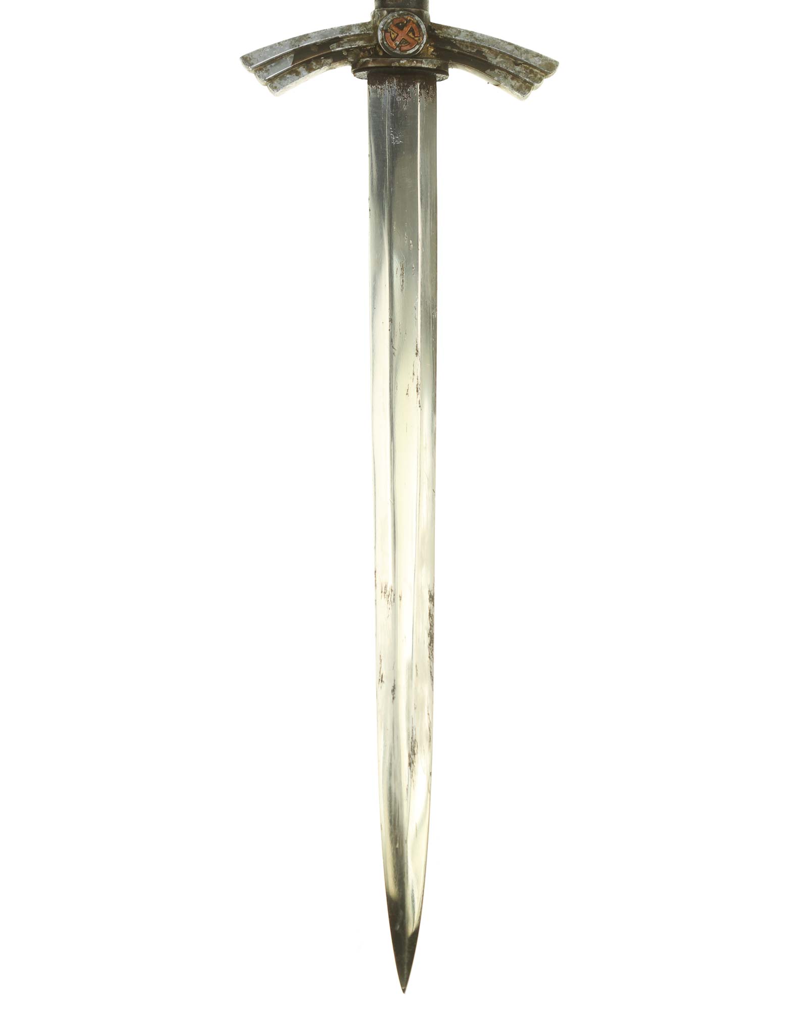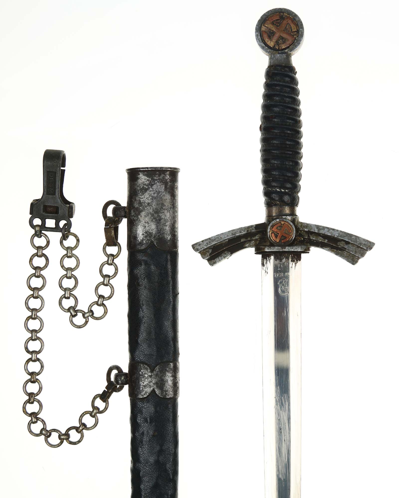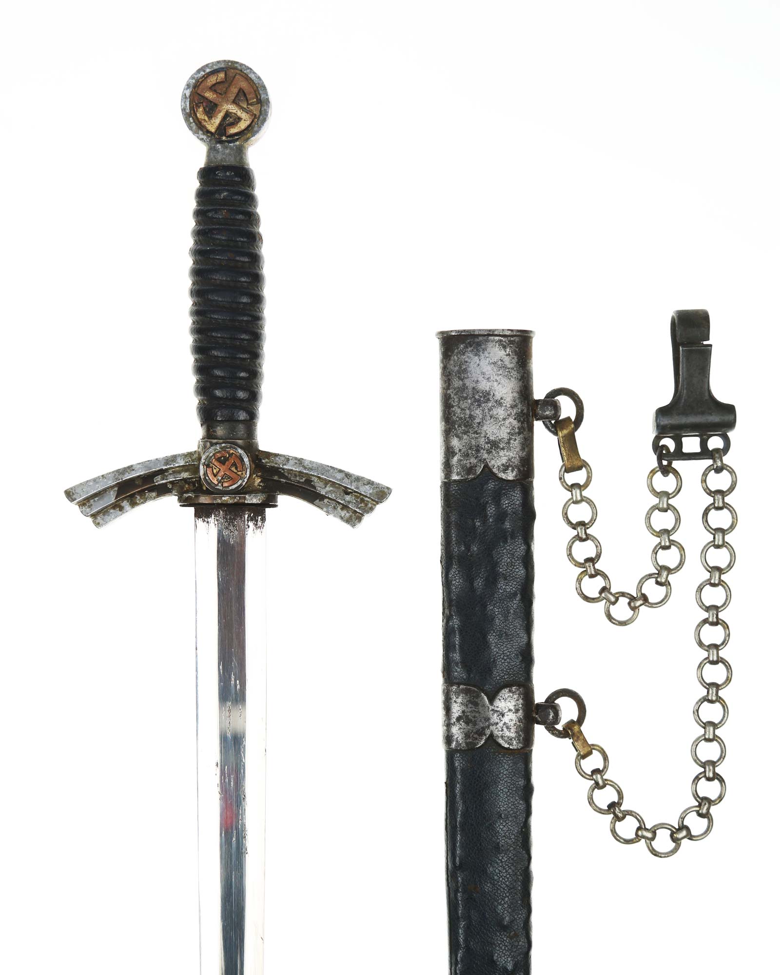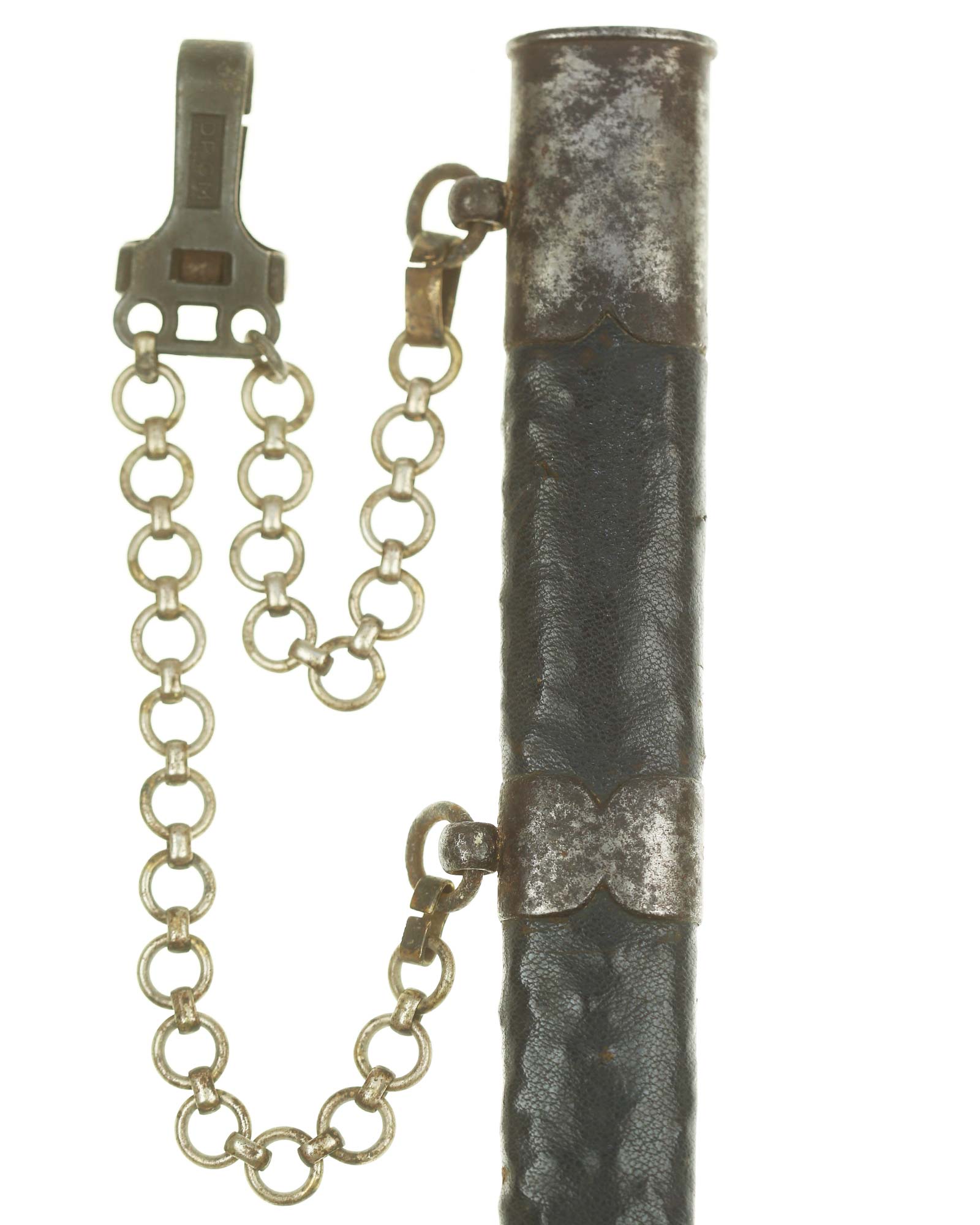 Griff: Der Griff besteht aus einem Holzkern, dieser ist mit einem blauem Saffianleder umwickelt. Die Griffwicklung fehlt. Der Knauf ist beidseitig mit Sonnenrädern, dieser ist auf die Klingenangel festgeschraubt.