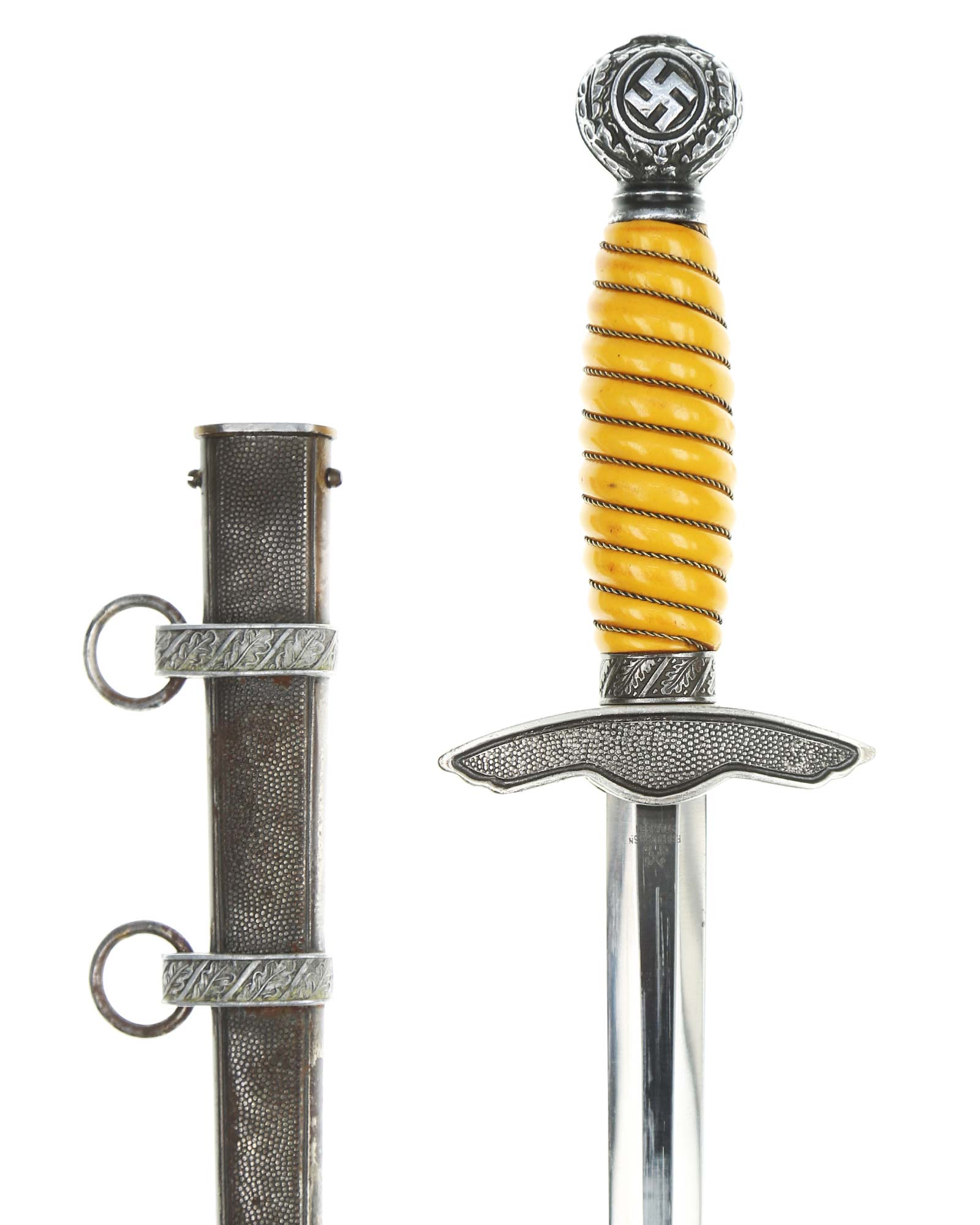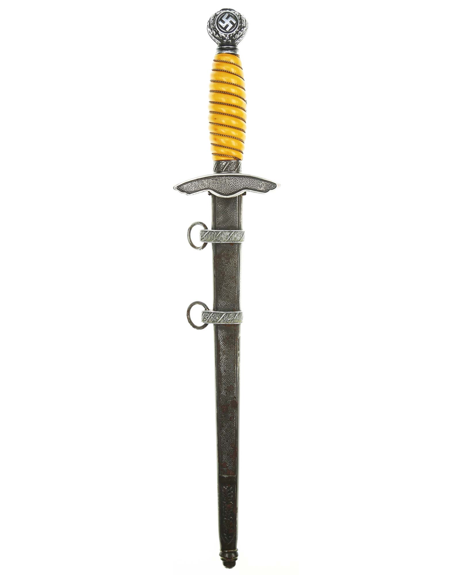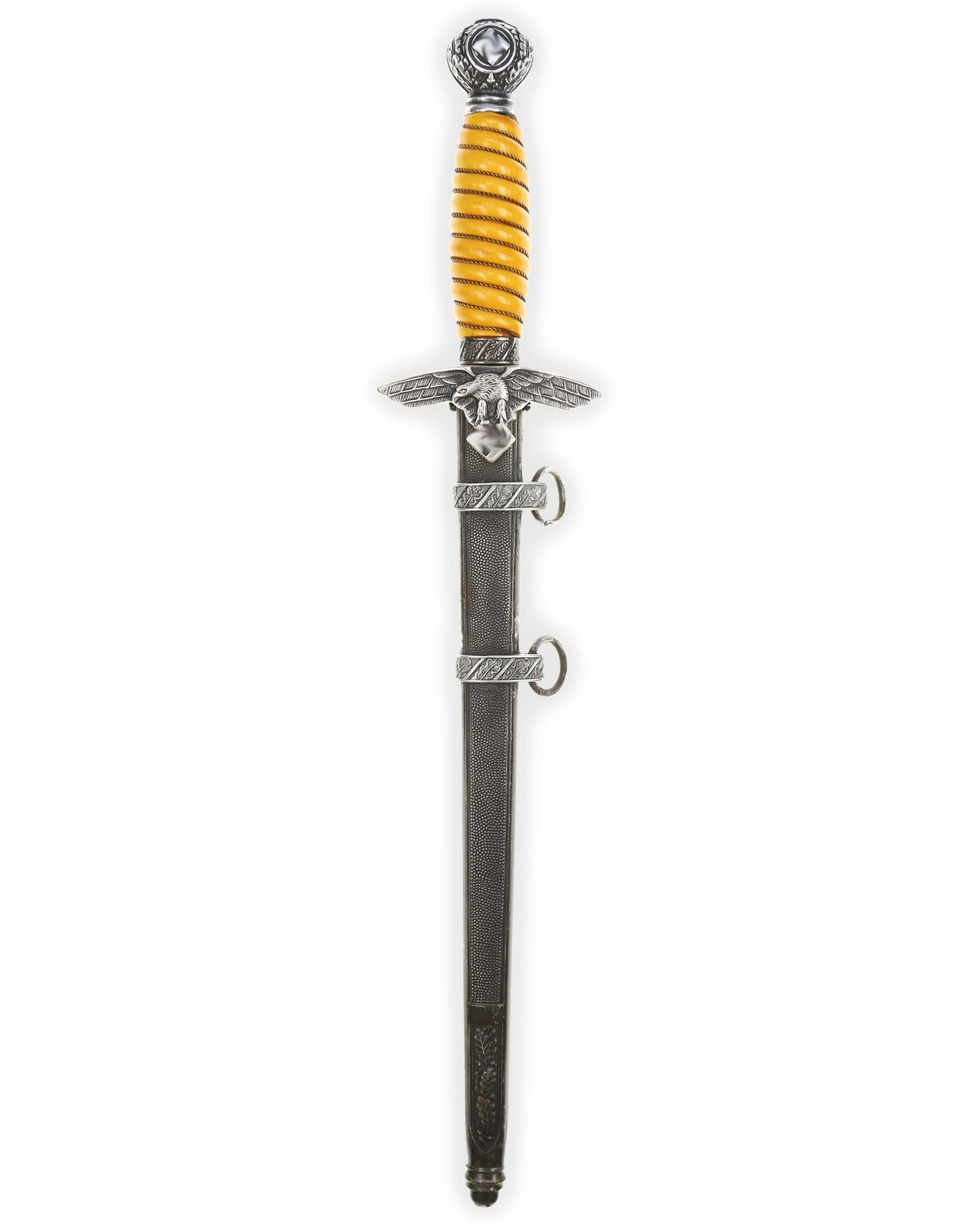 Dolch für Offiziere der Luftwaffe, M1937 - 2. Modell. Die Gesamtlänge beträgt 42,6 cm. Der Luftwaffen Offiziersdolch hat den Hersteller auf der Klinge: F. Herder A. & S. Solingen.