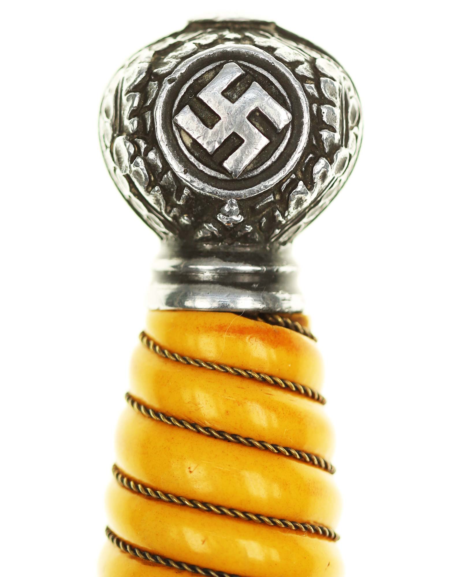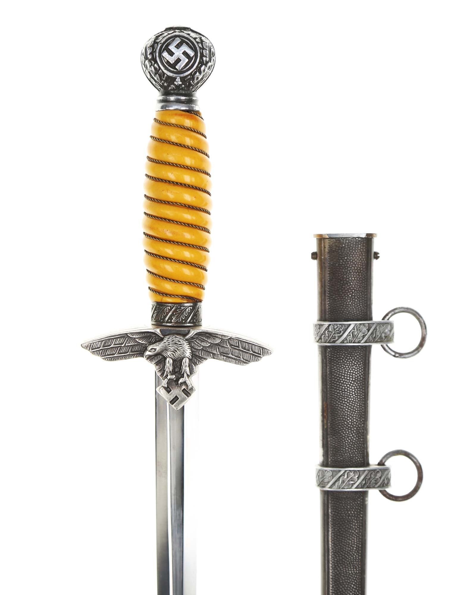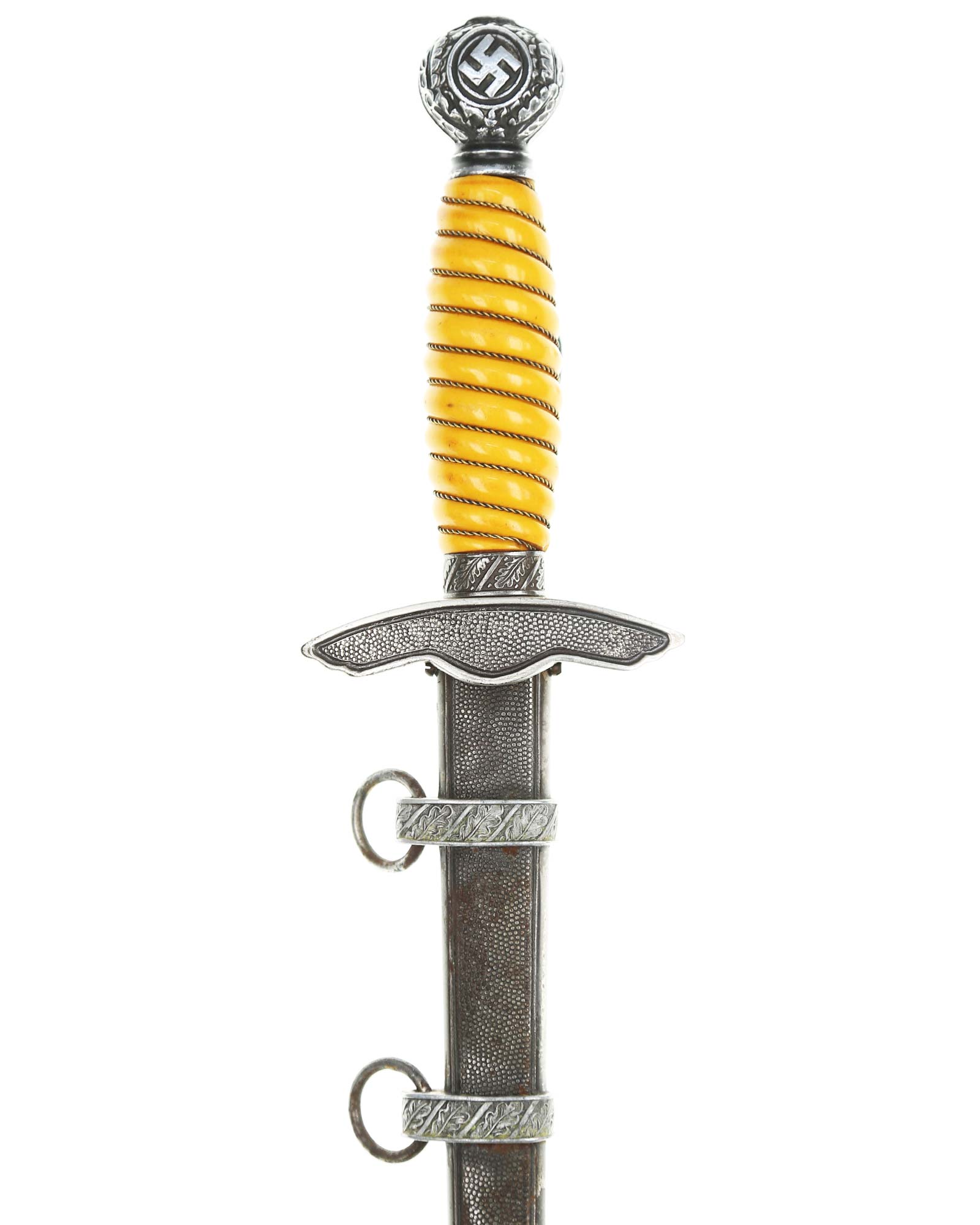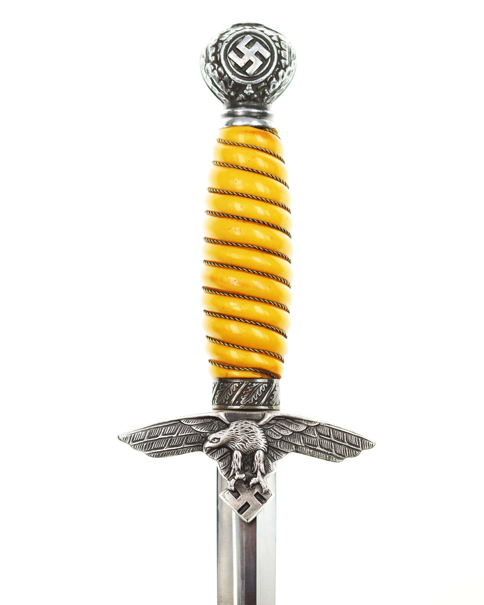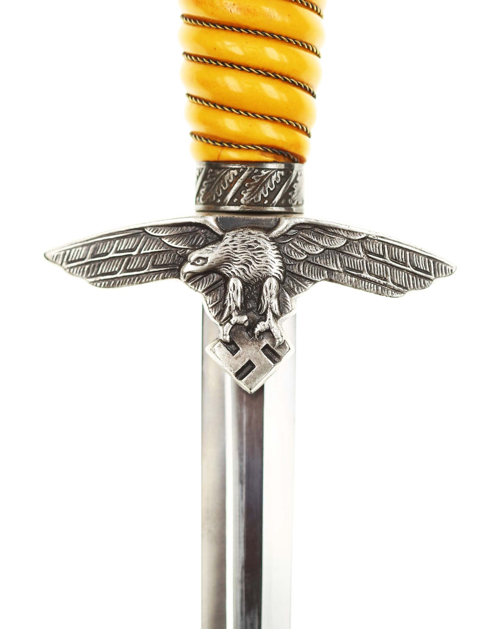 Griff: Der Griff ist orange und rund. Die Form der Kanneluren ist konvex bzw. nach außen gewölbt. Der Knauf ist beidseitig mit Hakenkreuzen, diese sind mit Eichenlaub verziert. Knauf ist auf die Klingenangel festgeschraubt. Die Parierstange ist in Form eines Luftwaffenadlers, der nach links schaut. Zu den beiden Enden hin verlaufen die Flügel nach unten. In der Mitte befindet sich der Adler, der in seinen Krallen ein Hakenkreuz festhält, die Rückseite der Parierstange ist gekörnt.