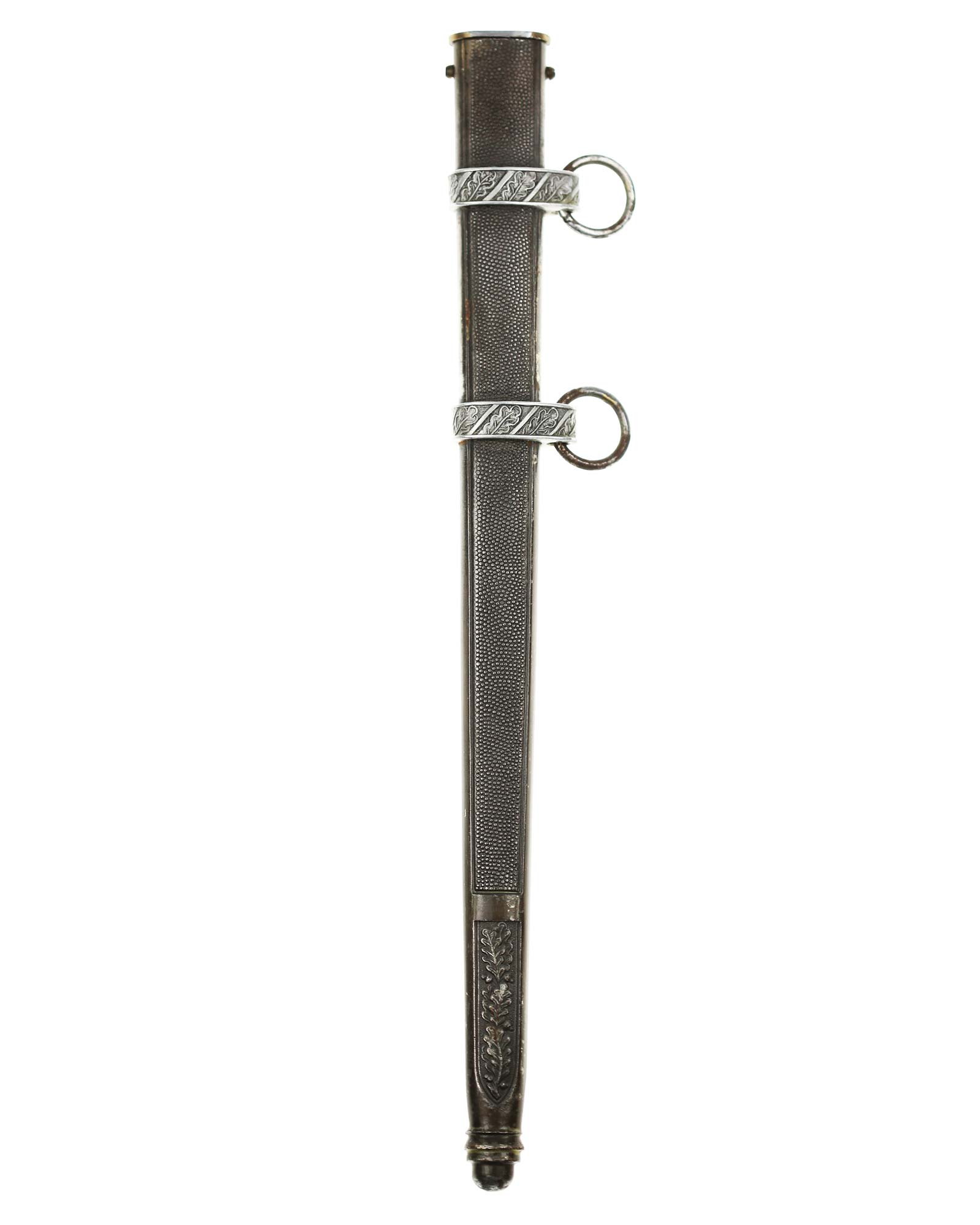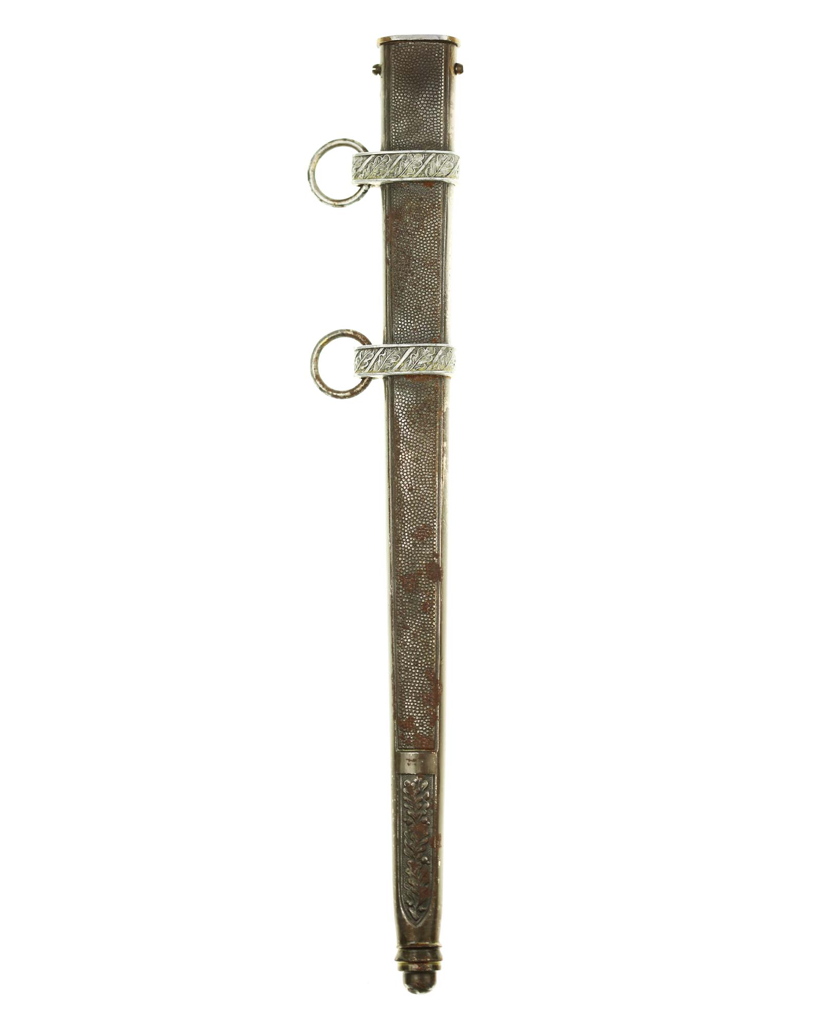 Scheide: Die Scheide besteht aus Mundblech und aus zwei eichenlaubverzierten Scheidenbändern mit zwei losen Trageringen, diese sind komplett geschlossen. Die Scheide ist aus einem Stück Stahlblech gezogen und auf der Vorder- und Rückseite mit körniger Oberflächenstruktur versehen. Die Spitze ist abgerundet und unbeschädigt. Das Mundstück ist separat eingesetzt und wird mit zwei Schrauben befestigt.