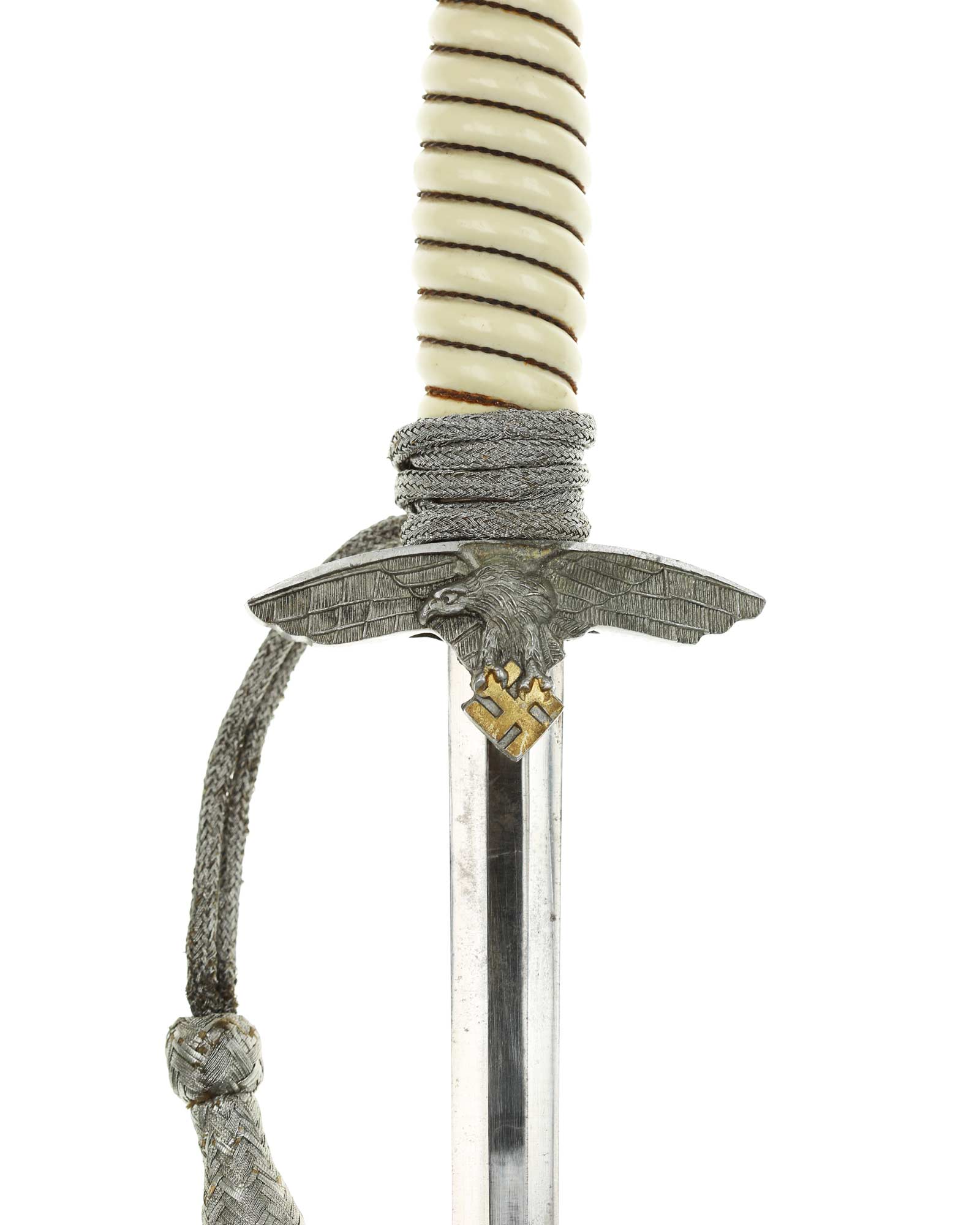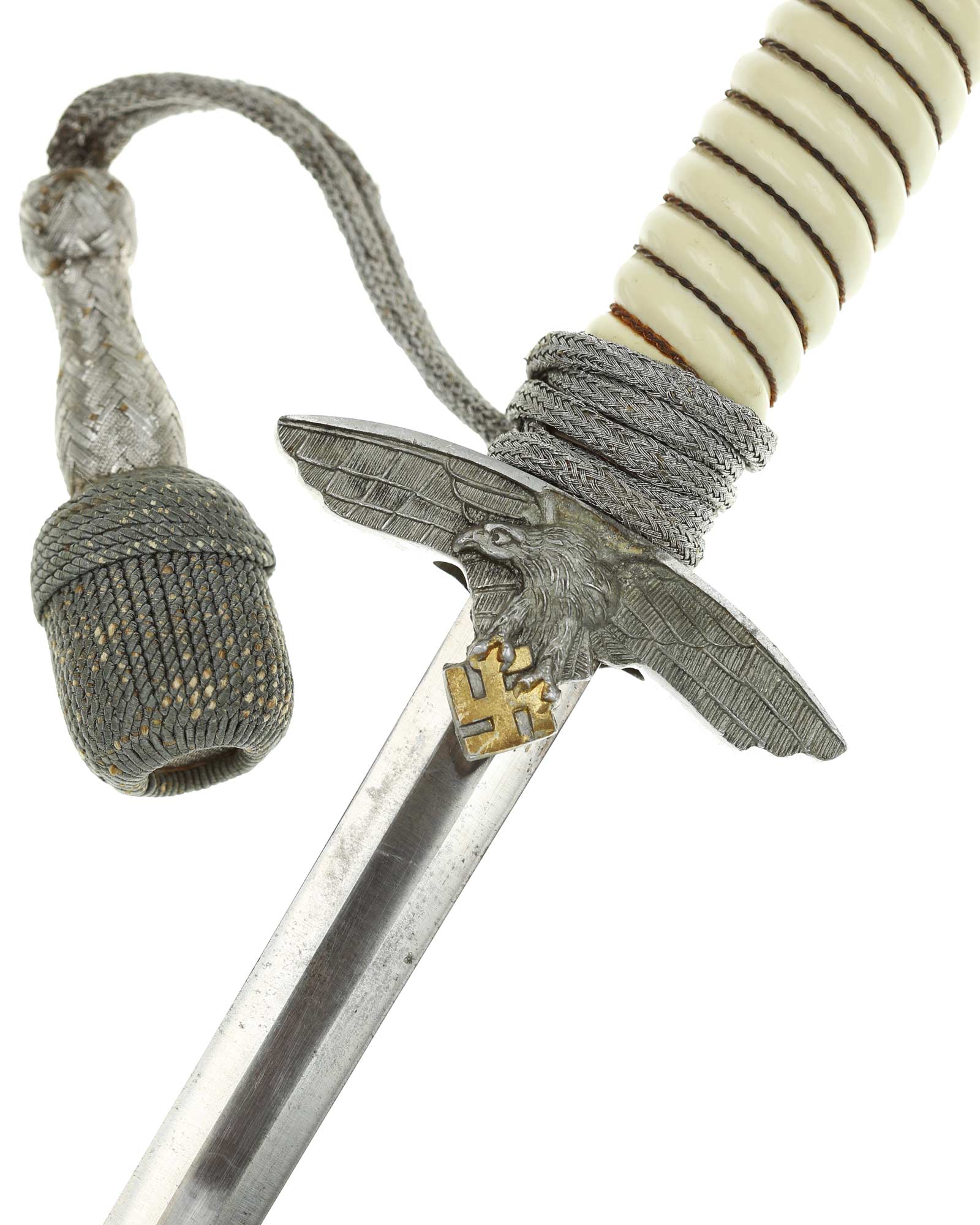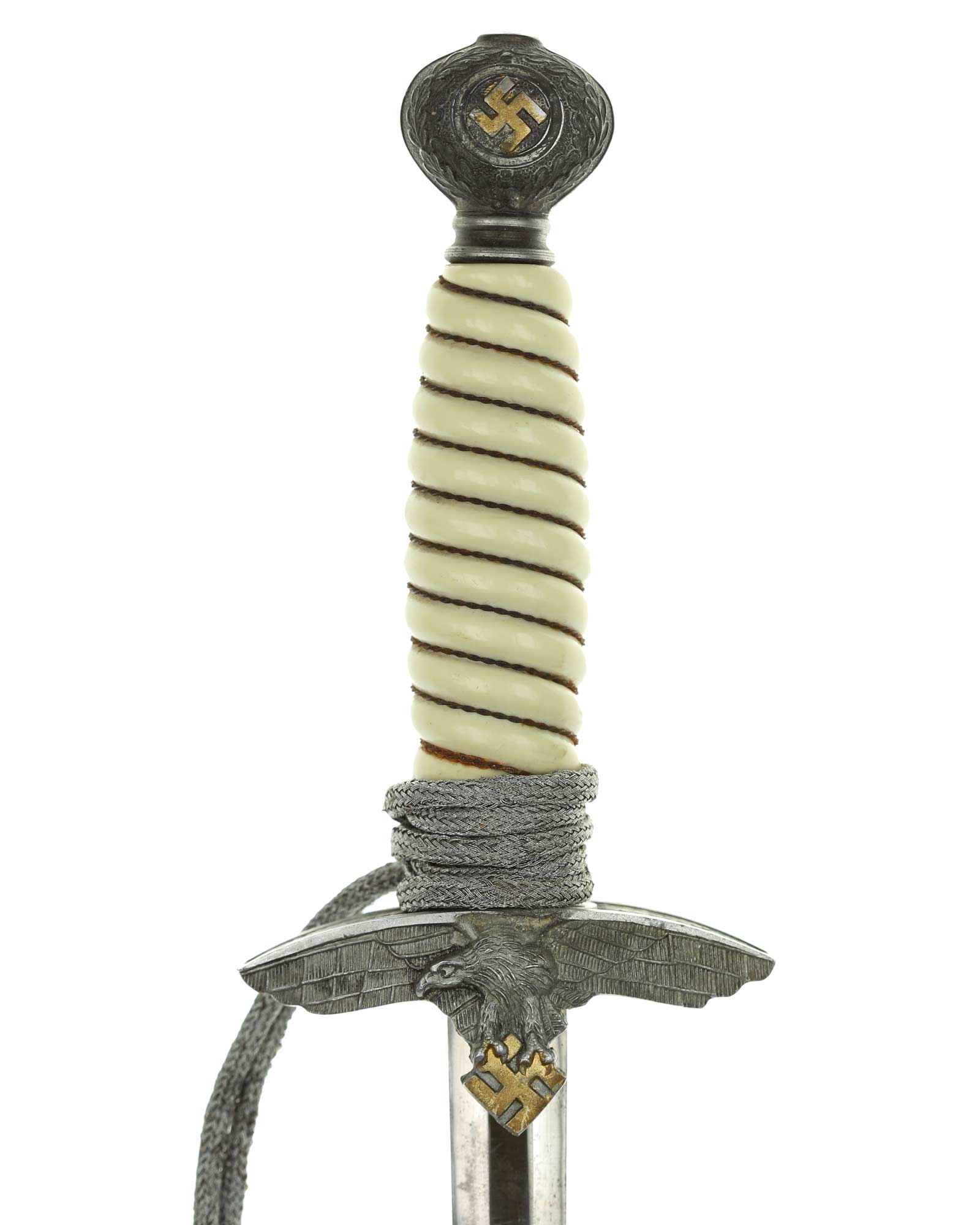 Griff: Der Griff ist weiß mit Doppeldraht-Wicklung. Die Form der Kanneluren ist konvex bzw. nach außen gewölbt. Der Knauf ist beidseitig mit Sonnenrädern und mit Eichenlaub verziert. Der Knauf ist auf die Klingenangel festgeschraubt. Die Parierstange ist in Form eines Luftwaffenadlers, der nach links schaut. Zu den beiden Enden hin verlaufen die Flügel nach unten. In der Mitte befindet sich der Adler, der in seinen Krallen ein Hakenkreuz festhält, die Rückseite der Parierstange ist gekörnt.