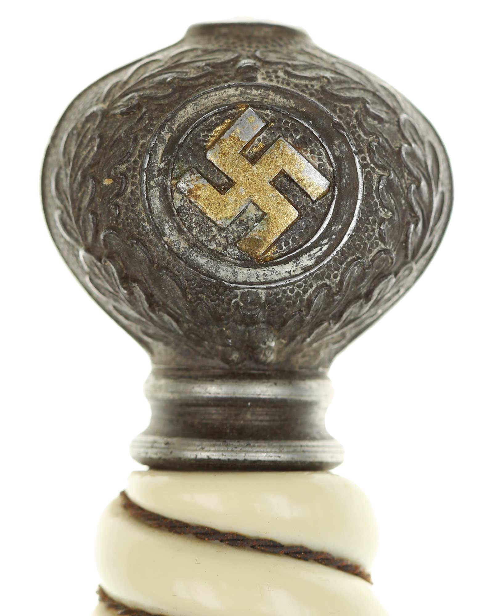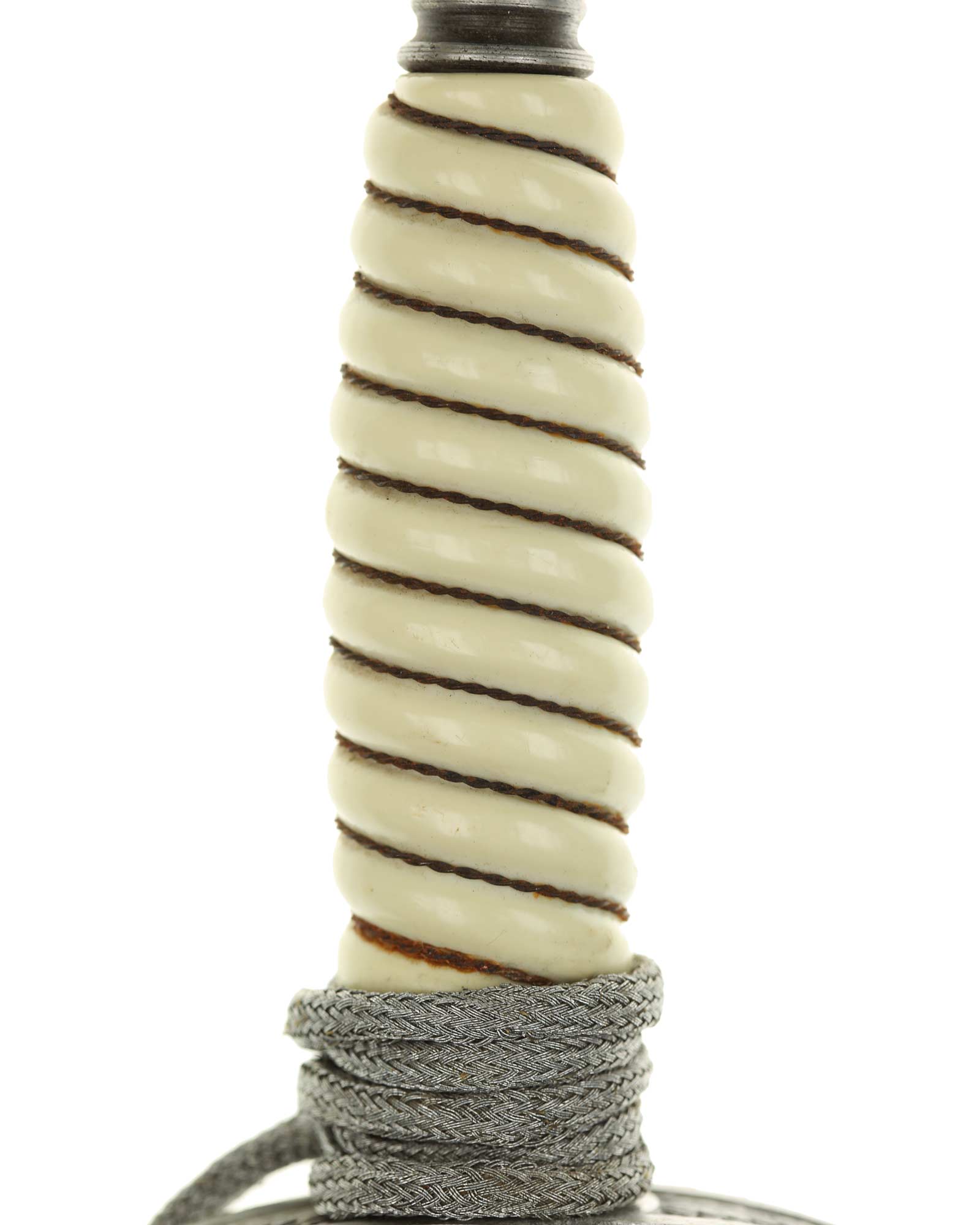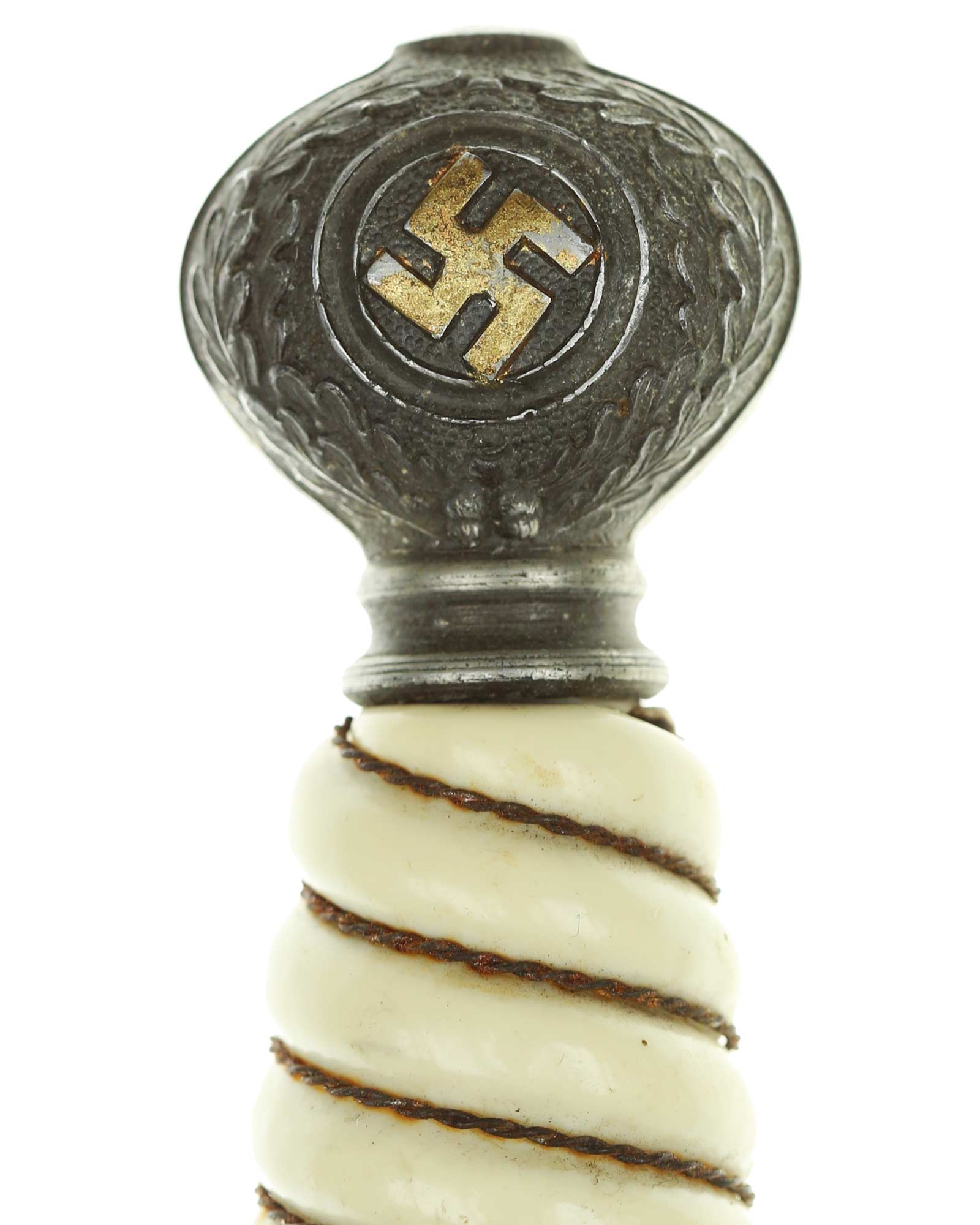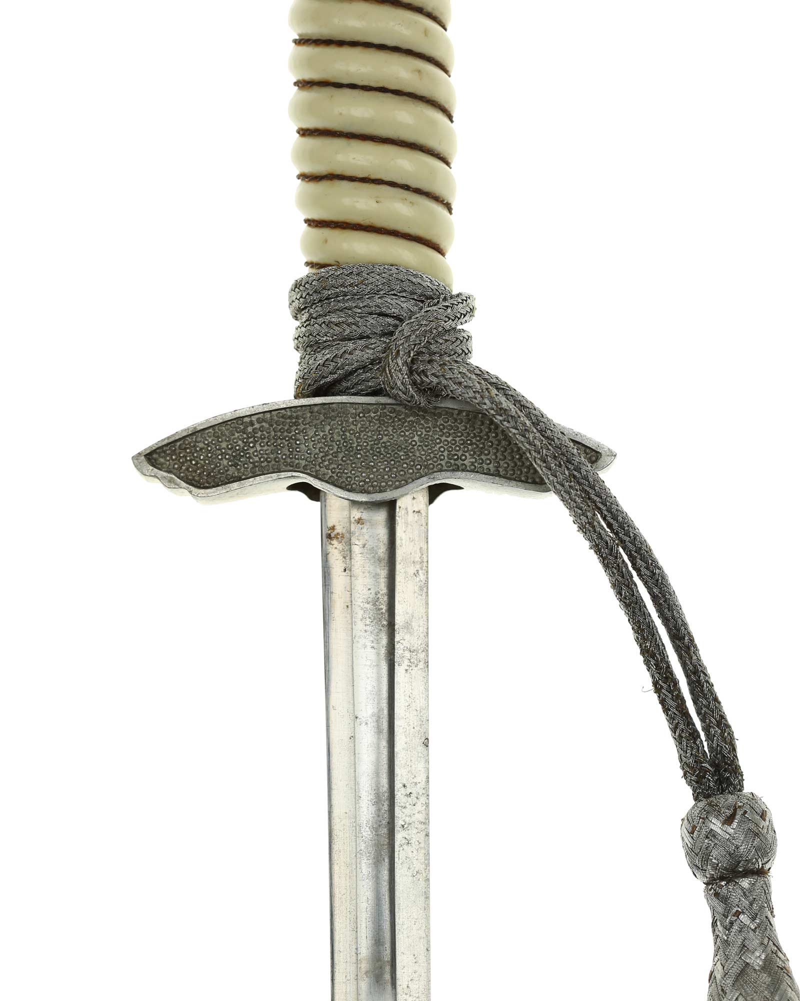 Griff: Der Griff ist weiß mit Doppeldraht-Wicklung. Die Form der Kanneluren ist konvex bzw. nach außen gewölbt. Der Knauf ist beidseitig mit Sonnenrädern und mit Eichenlaub verziert. Der Knauf ist auf die Klingenangel festgeschraubt. Die Parierstange ist in Form eines Luftwaffenadlers, der nach links schaut. Zu den beiden Enden hin verlaufen die Flügel nach unten. In der Mitte befindet sich der Adler, der in seinen Krallen ein Hakenkreuz festhält, die Rückseite der Parierstange ist gekörnt.