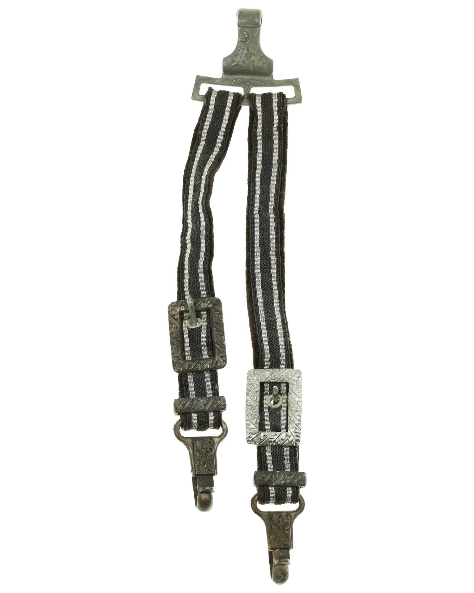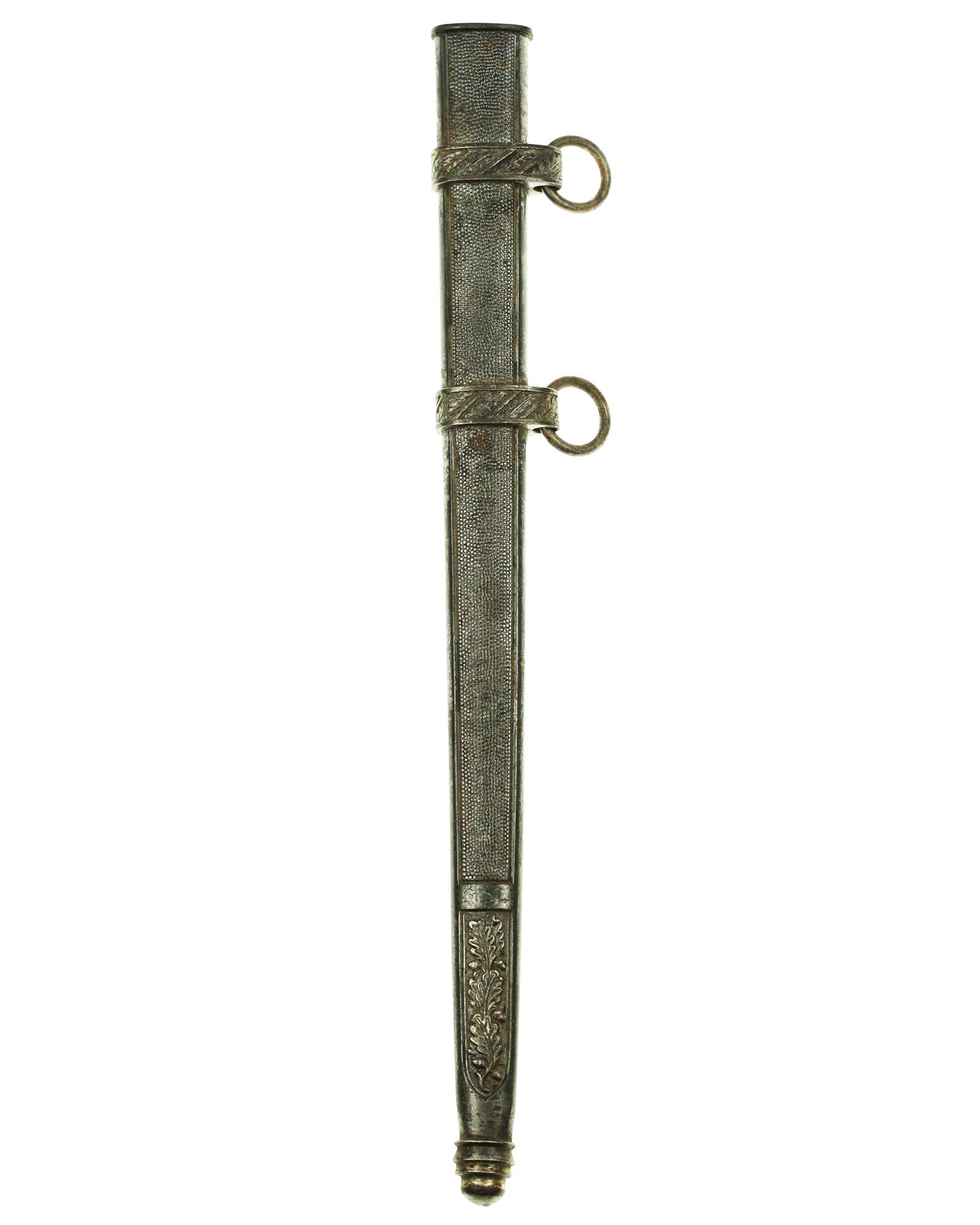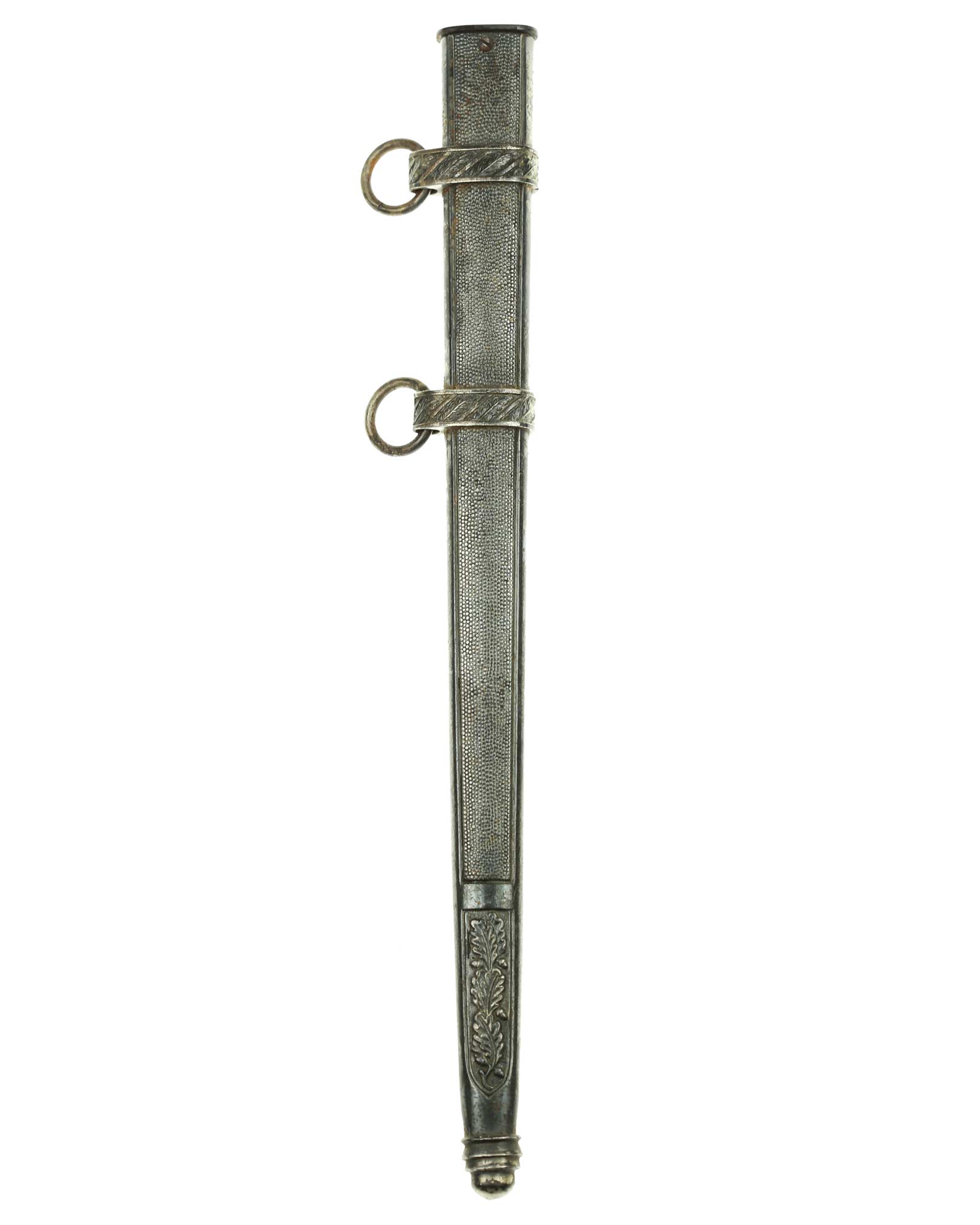 Scheide: Die Scheide besteht aus Mundblech und aus zwei eichenlaubverzierten Scheidenbändern mit zwei losen Trageringen, diese sind komplett geschlossen. Die Scheide ist aus einem Stück Stahlblech gezogen und auf der Vorder- und Rückseite mit körniger Oberflächenstruktur versehen. Die Spitze ist abgerundet und unbeschädigt. Das Mundstück ist separat eingesetzt und wird mit einer Schraube befestigt.